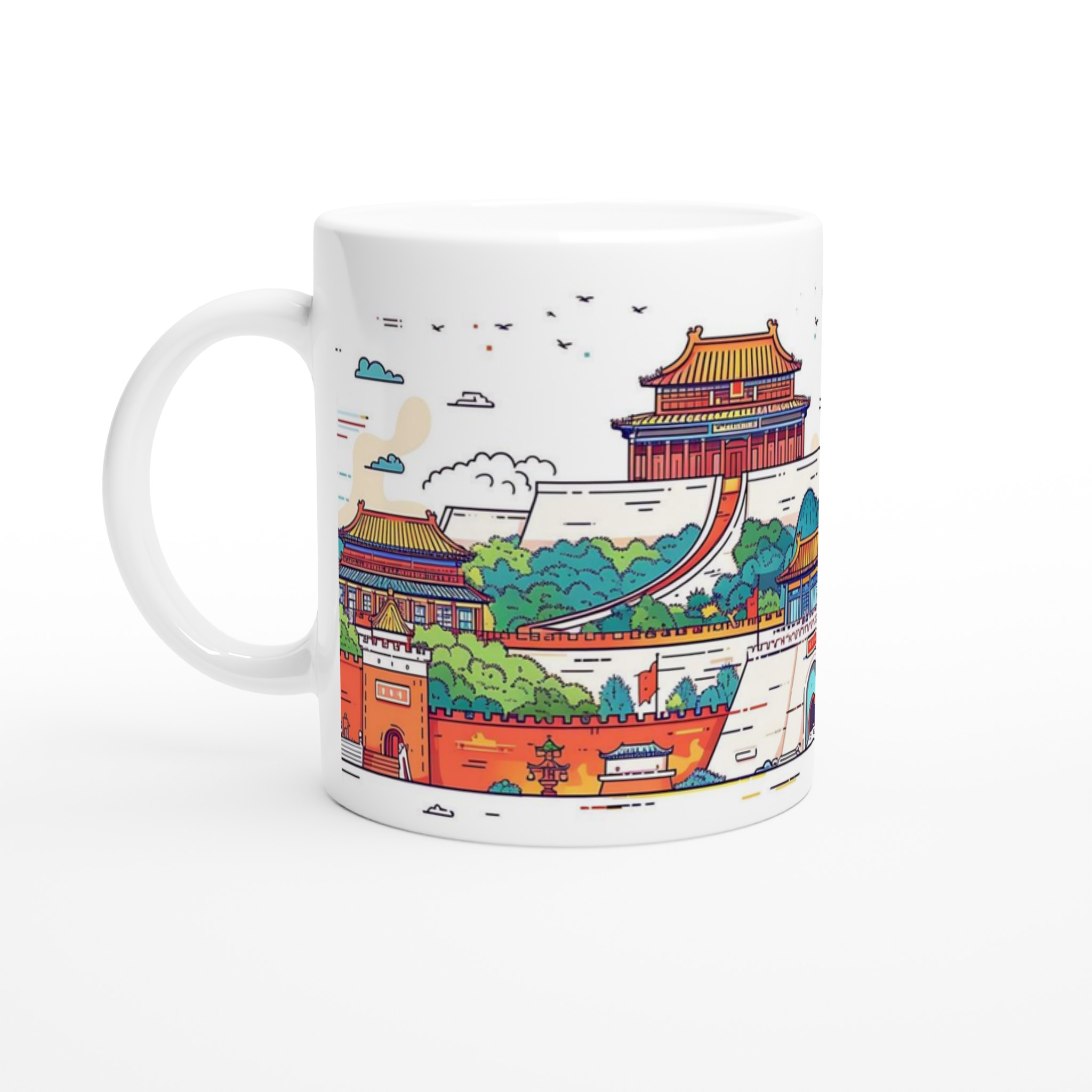 Denna mugg fångar den majestätiska skönheten i traditionell kinesisk arkitektur, med livfulla färger och detaljerade linjer som transporterar dig till forna palats och tempel. Den blanka vita ytan ger ett skarpt och levande tryck som verkligen sticker ut, oavsett om det är en personlig design, ett roligt citat eller en present till någon du tycker om.