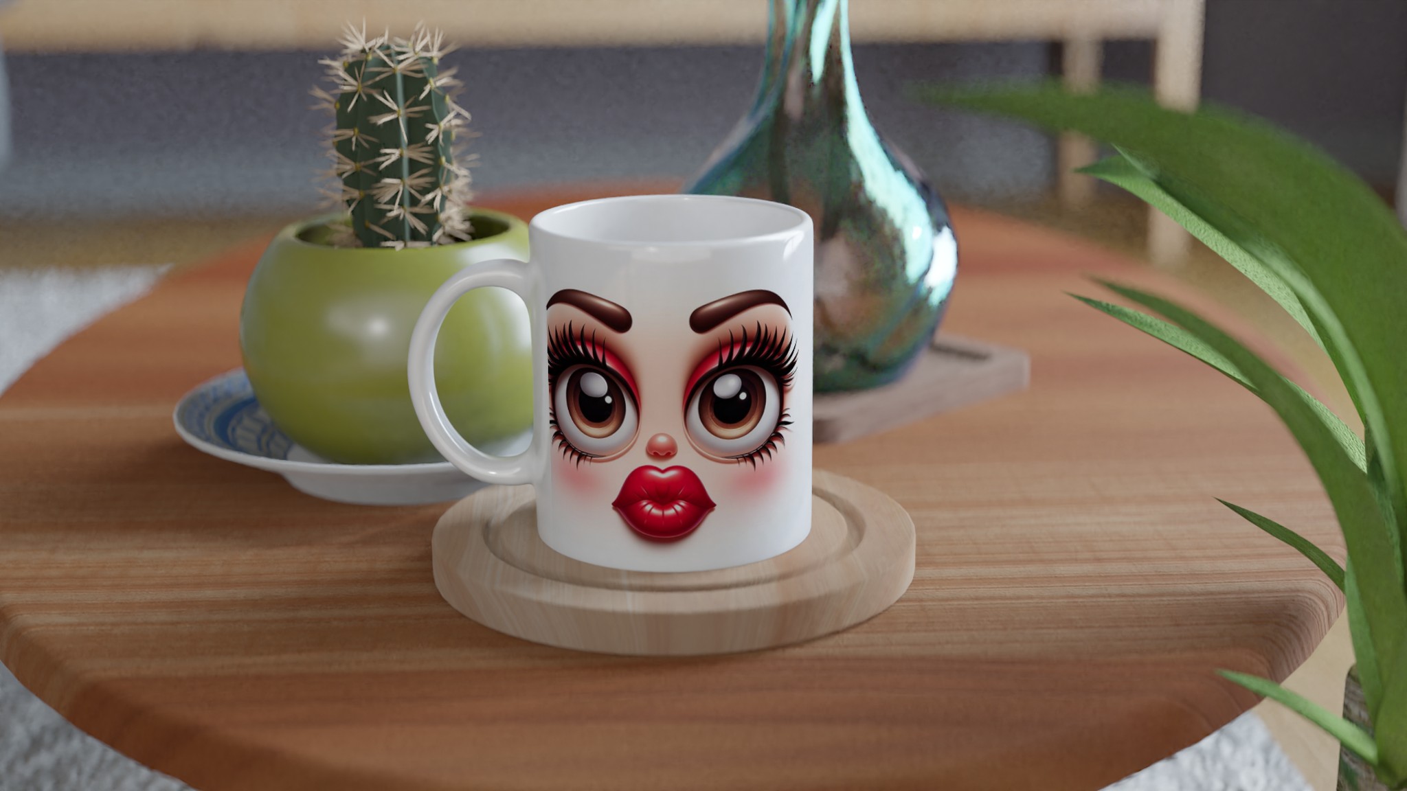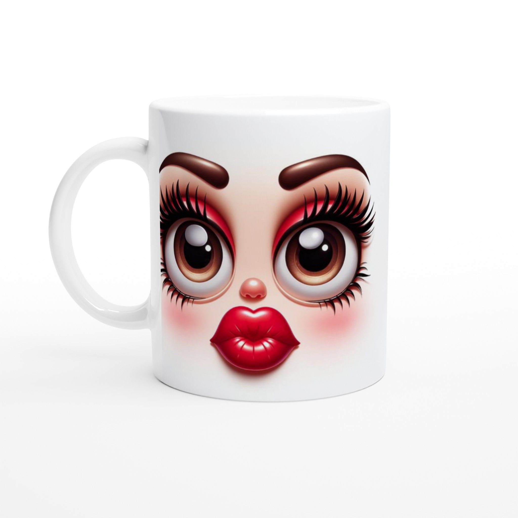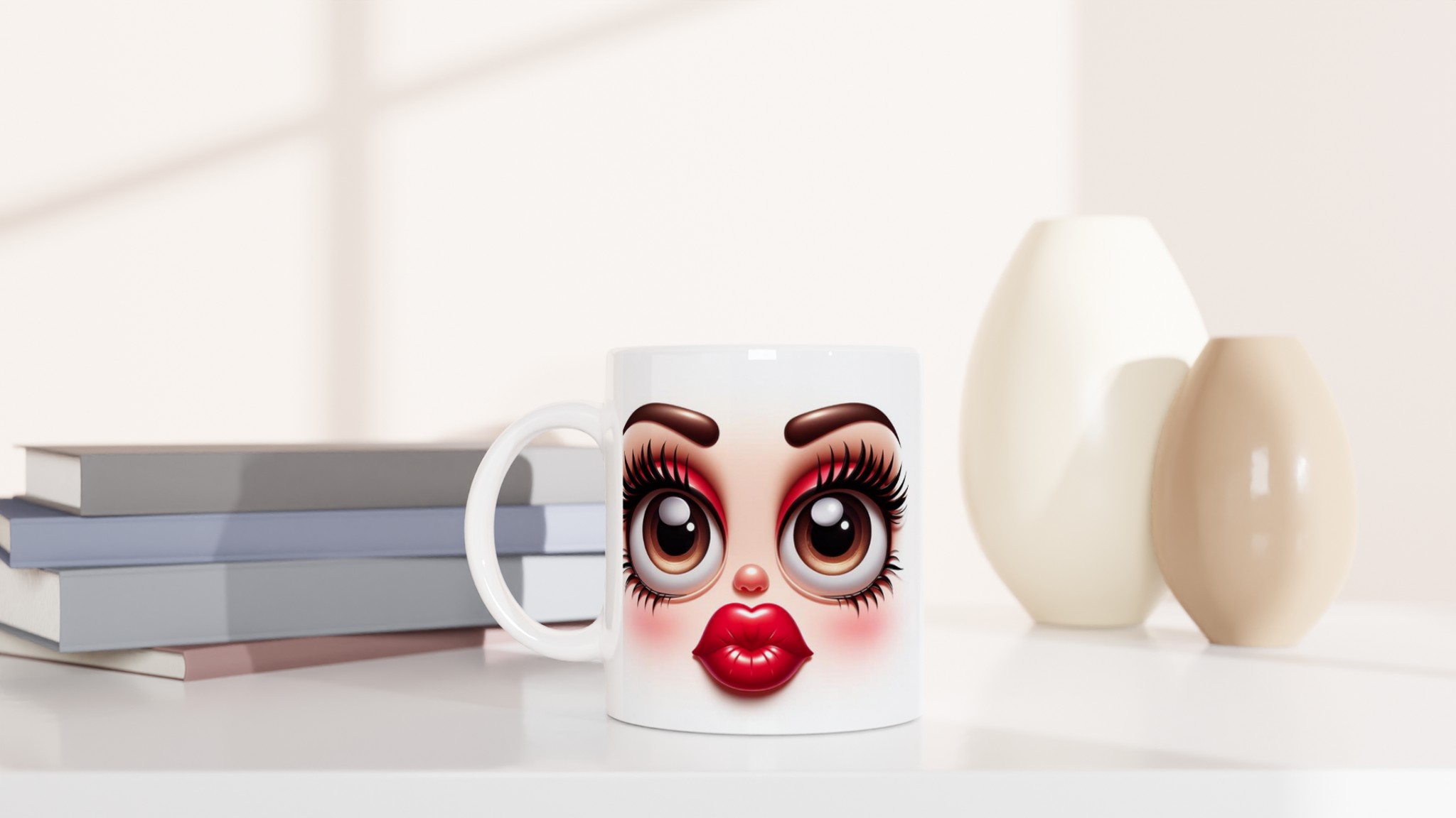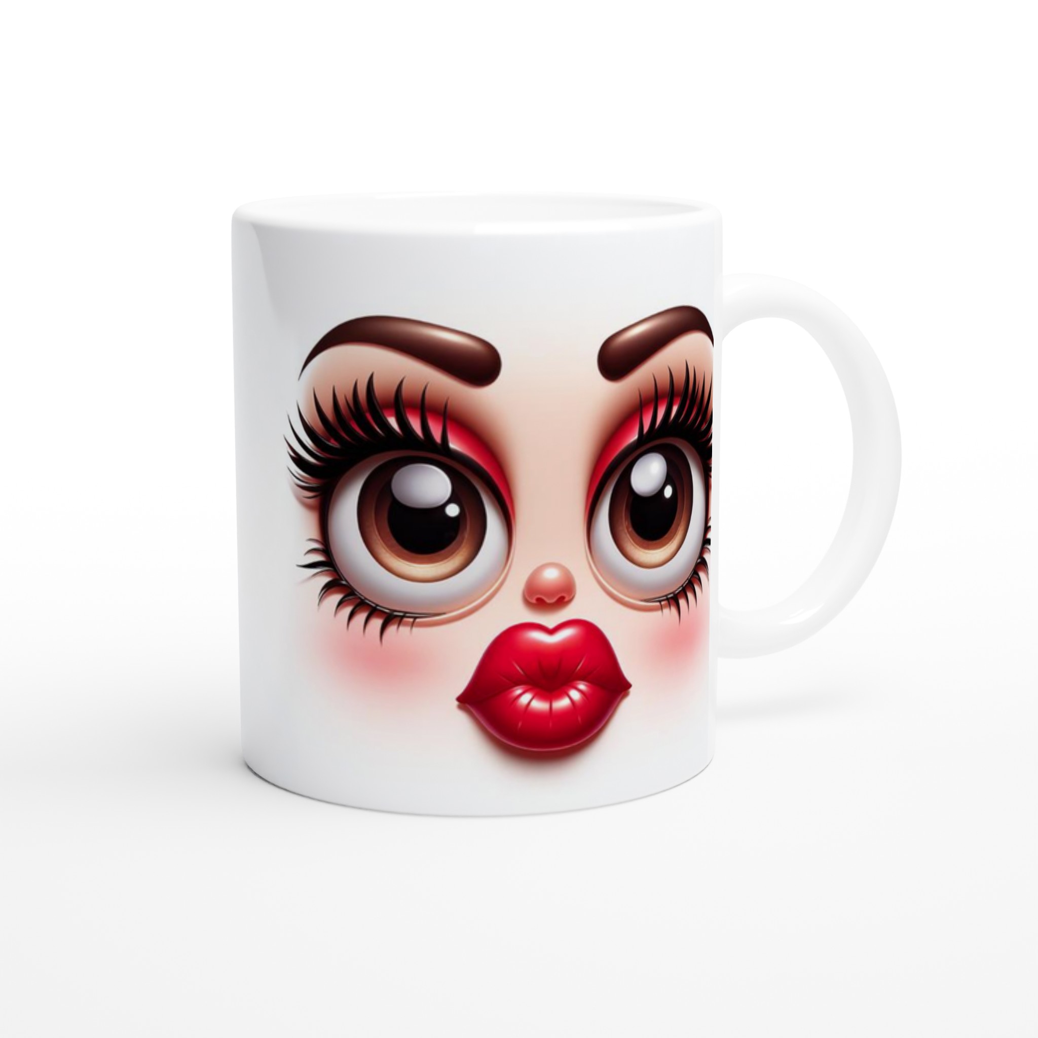 Lyft varje kaffestund med vår premium keramikmugg – stilren, hållbar och skapad för att låta ditt motiv glänsa. Denna mugg fångar den lekfulla charmen hos en kitschy tecknad figur, med stora uttrycksfulla ögon och fylliga röda läppar som ger en oemotståndlig personlighet. Perfekt för den som älskar en dos humor och karaktär i sin vardag, eller som en unik present till en vän med glimten i ögat.