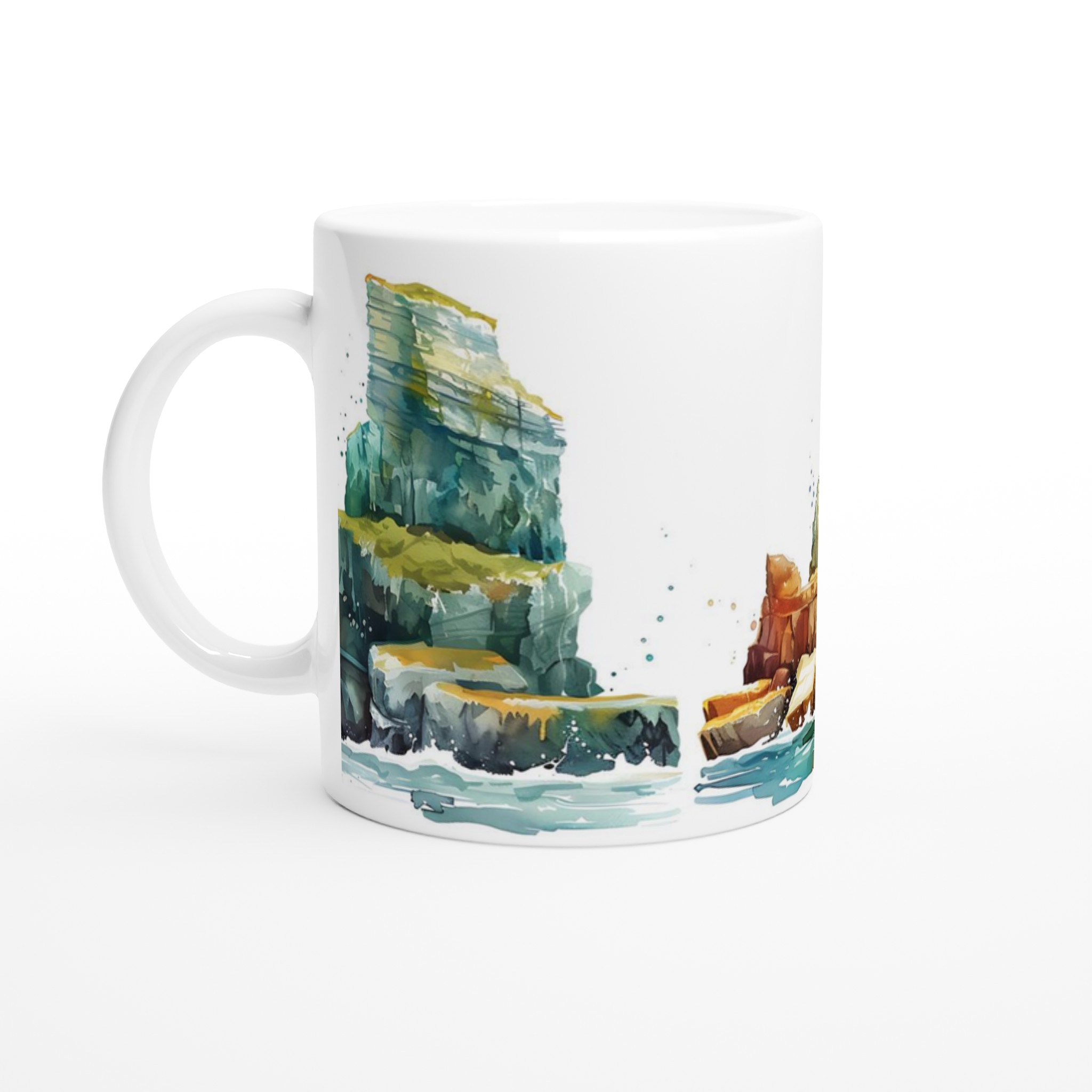 Inspirerad av de dramatiska, vågsköljda klippkusterna, ger den blanka vita ytan ett skarpt och levande tryck som verkligen sticker ut. Oavsett om du väljer en personlig design, ett roligt citat eller en present till någon du tycker om, kommer denna mugg att förmedla en känsla av lugn och äventyr vid varje sip.