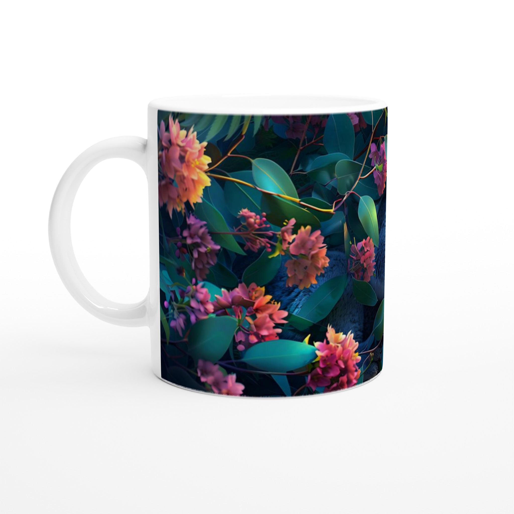 Denna förtrollande mugg fångar den lugna skönheten hos en koala omgiven av blommande eukalyptus, med en rik färgpalett av djupblågröna löv och livfulla rosa och orangea blommor. Den blanka vita ytan ger ett skarpt och levande tryck som verkligen sticker ut, oavsett om det är en personlig design, ett roligt citat eller en present till någon du tycker om.
