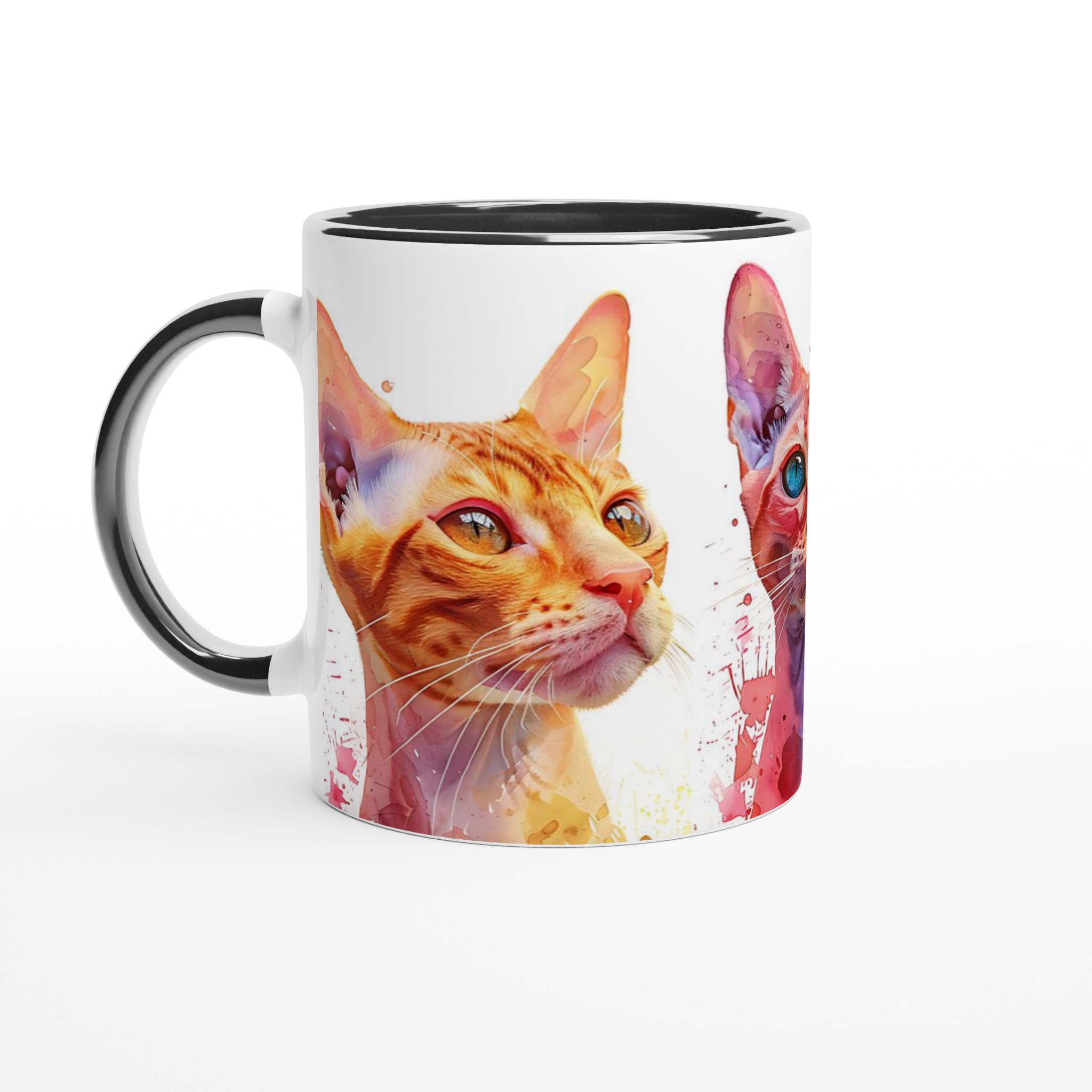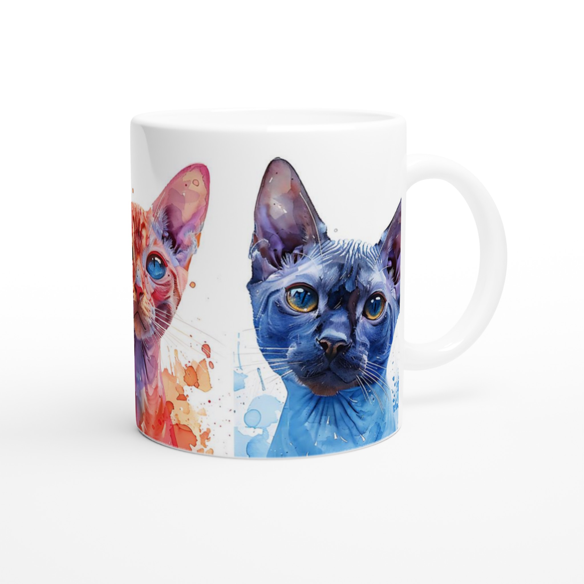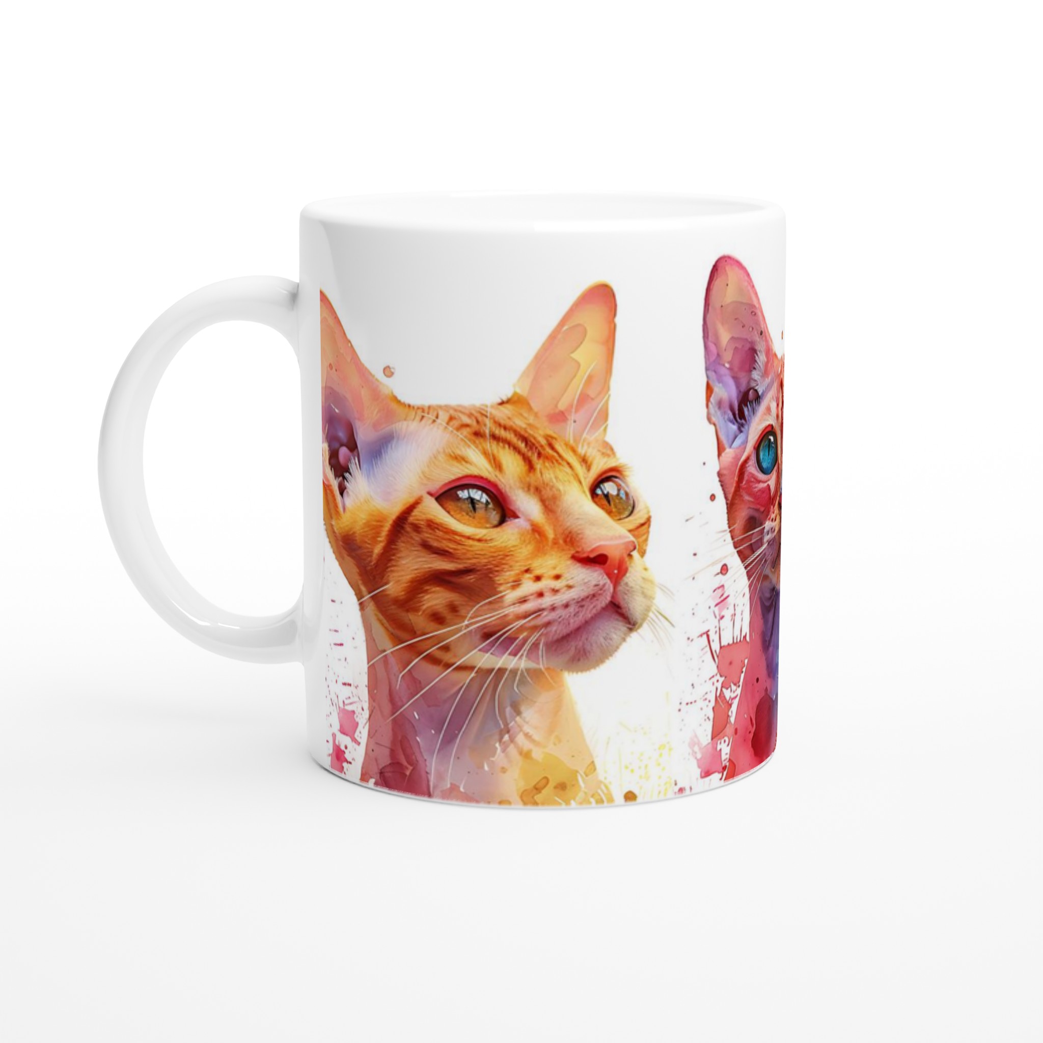 Väck dina sinnen varje morgon med denna konstfulla keramiska mugg, prydd med unika akvarellporträtt av majestätiska katter. Med sina livfulla färger och uttrycksfulla ögon blir varje sip en stund av glädje. De varma nyanserna av guld, djupt rött och svalt blått, kompletterade med akvarellens dynamiska stänk, gör denna mugg till mer än bara en kopp – det är ett litet konstverk för din hand.