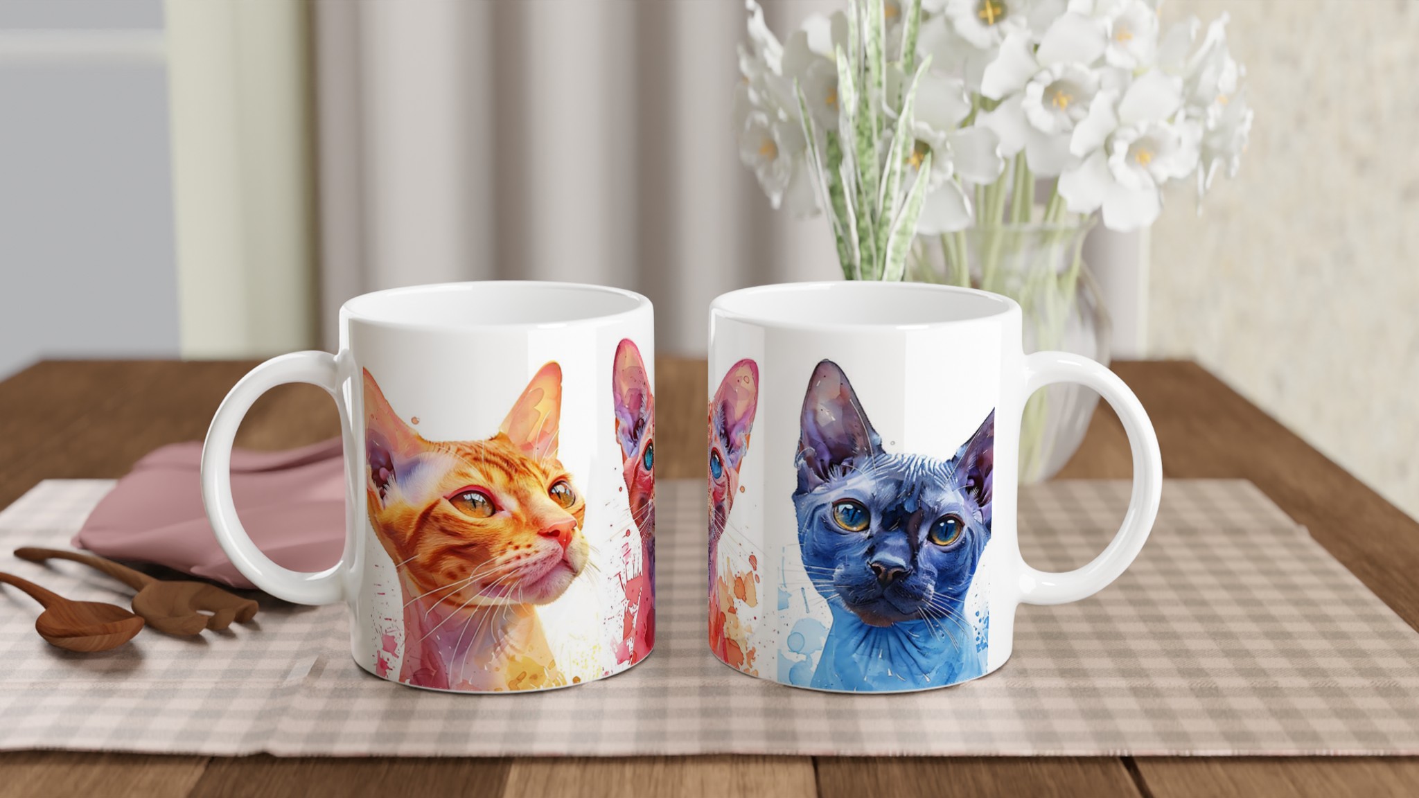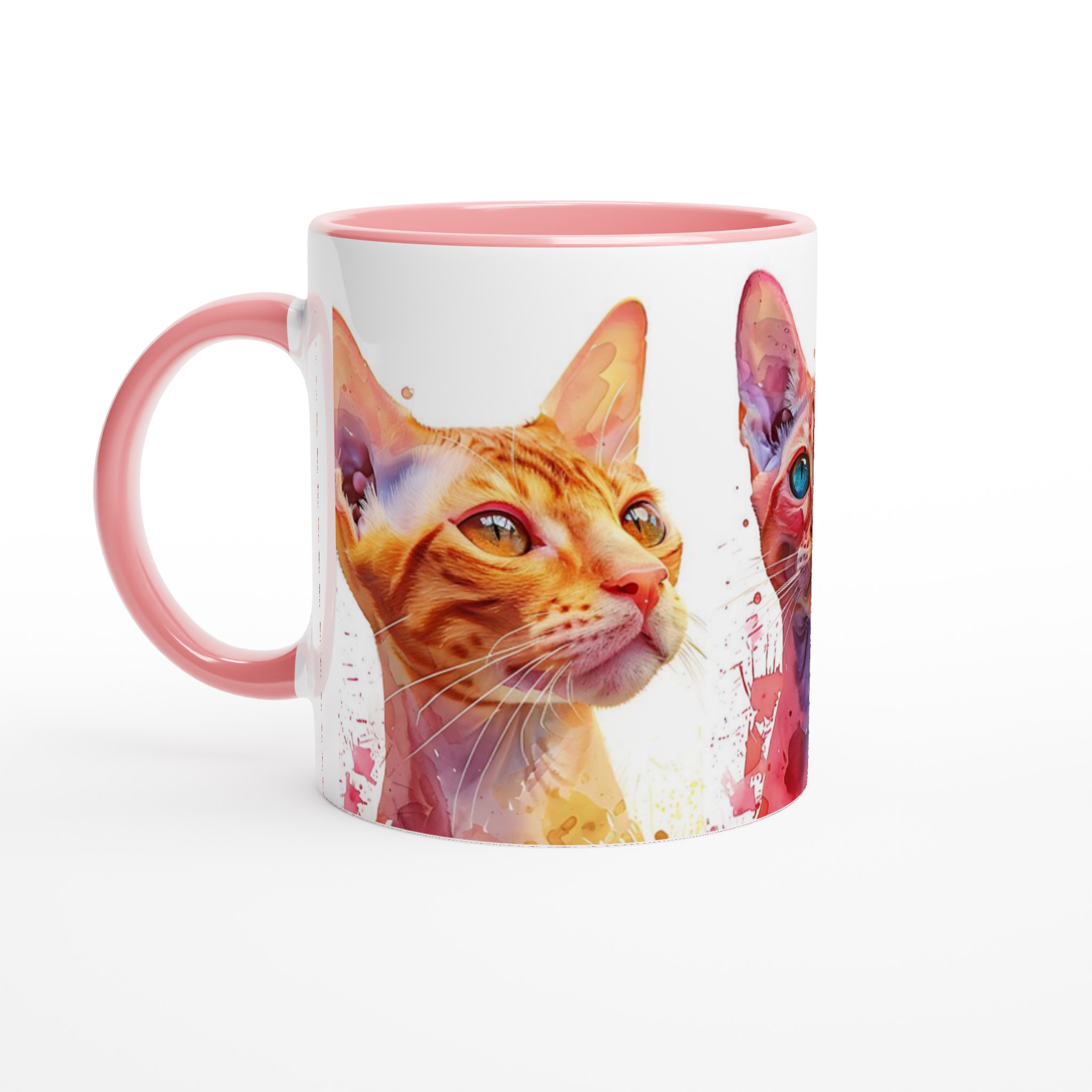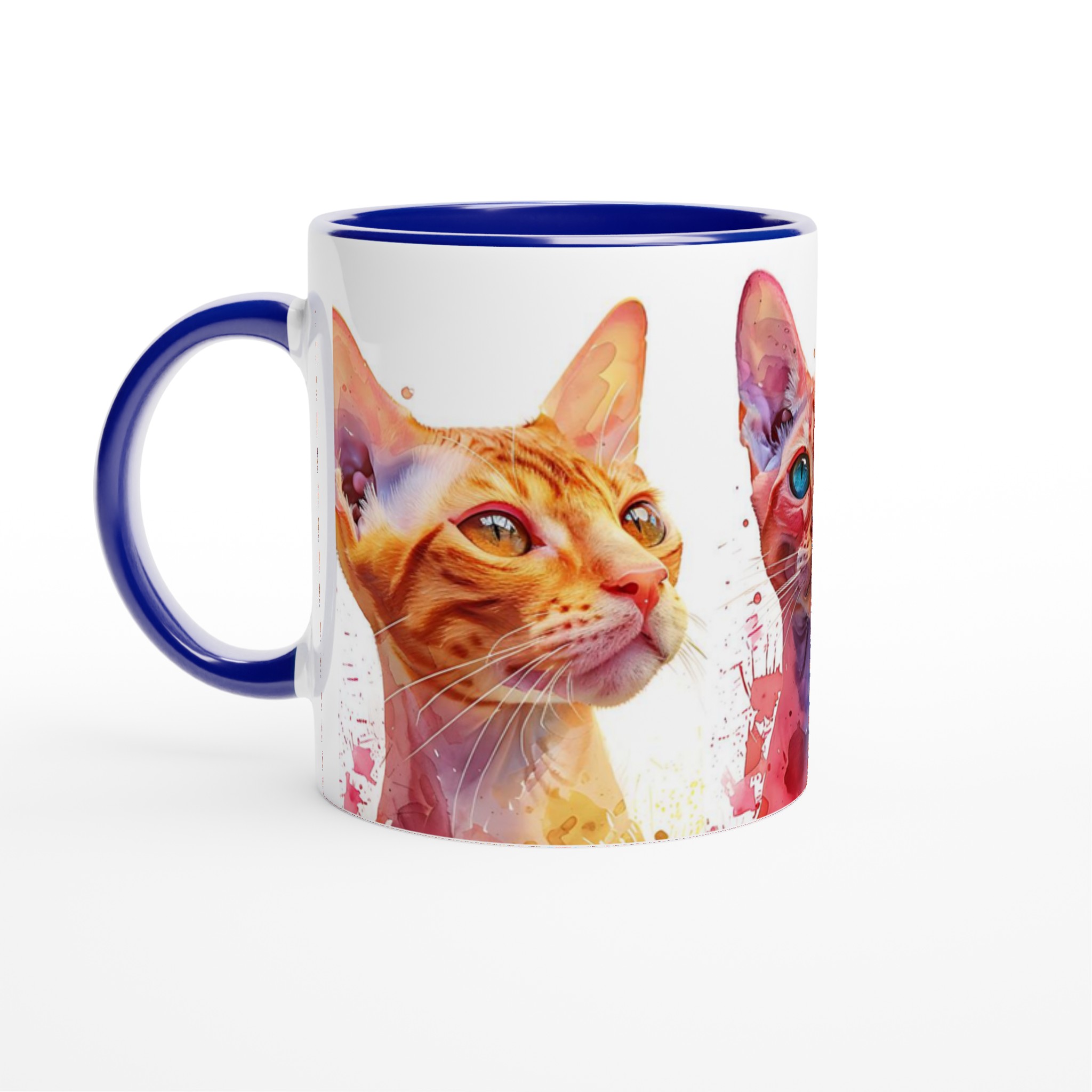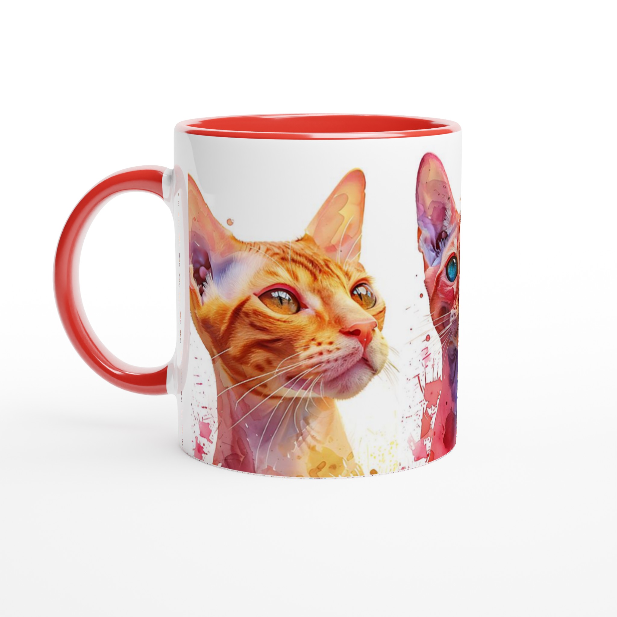 Väck dina sinnen varje morgon med denna konstfulla keramiska mugg, prydd med unika akvarellporträtt av majestätiska katter. Med sina livfulla färger och uttrycksfulla ögon blir varje sip en stund av glädje. De varma nyanserna av guld, djupt rött och svalt blått, kompletterade med akvarellens dynamiska stänk, gör denna mugg till mer än bara en kopp – det är ett litet konstverk för din hand.