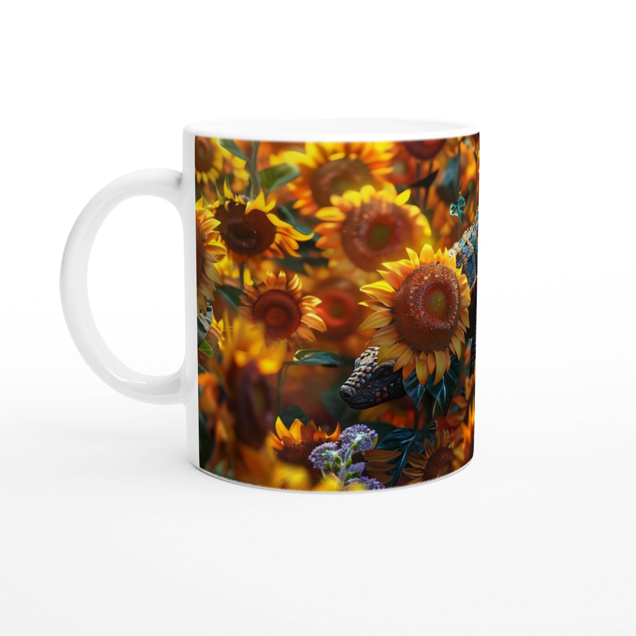 Lyft varje kaffestund med vår premium keramikmugg – stilren, hållbar och skapad för att låta ditt motiv glänsa. Denna unika mugg fångar den glädjefyllda essensen av en sköldpadda bland solrosor, med en rik palett av gult, orange och lugnande blått som väcker liv i varje detalj. Perfekt för naturälskare, konstentusiaster eller den som söker en touch av lantlig charm i vardagen.