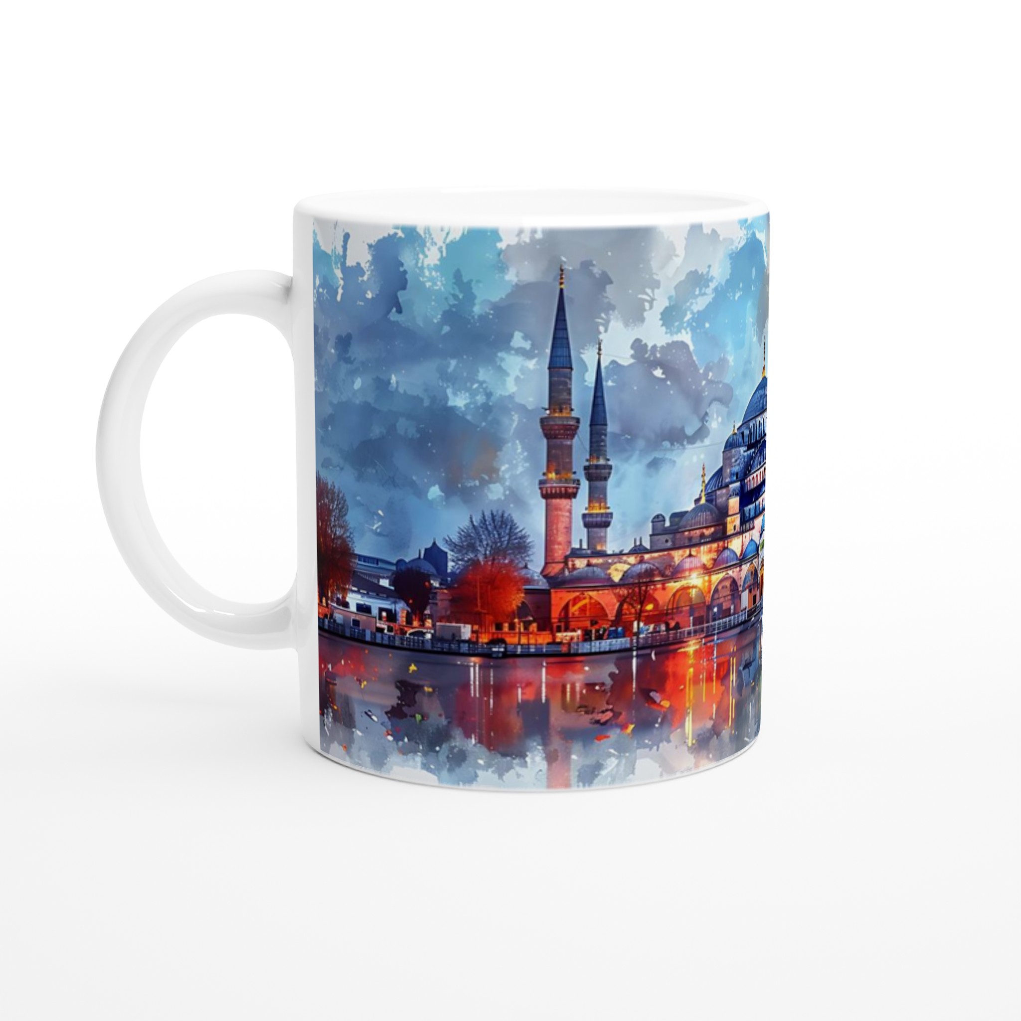 Inspirerad av den ikoniska Blå Moskén med en färgstark akvarellpalett av djupa blåtoner och varma, glödande accenter, blir denna mugg en blickfångare. Den blanka vita ytan ger ett skarpt och levande tryck som verkligen sticker ut, oavsett om det är en personlig design, ett roligt citat eller en present till någon du tycker om.