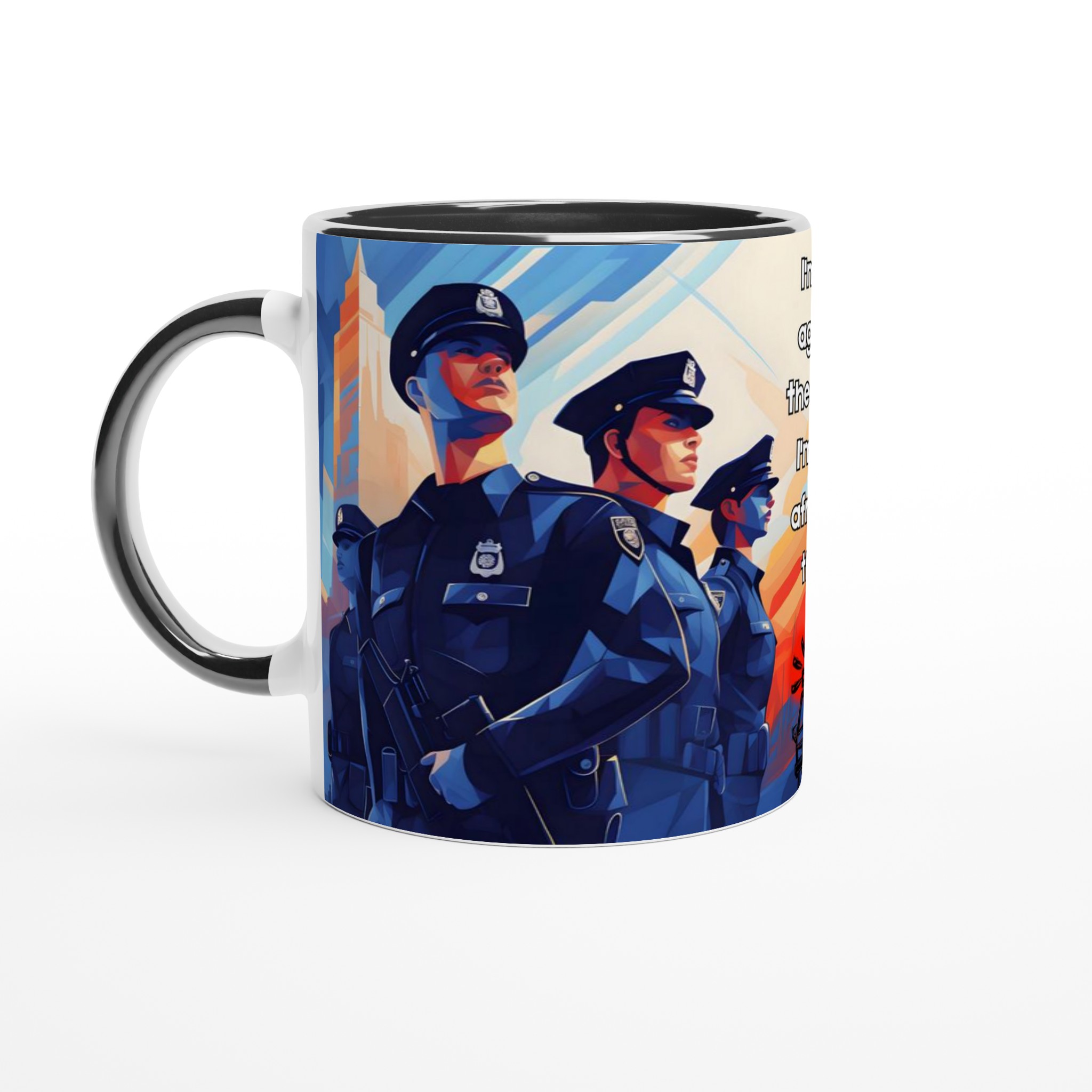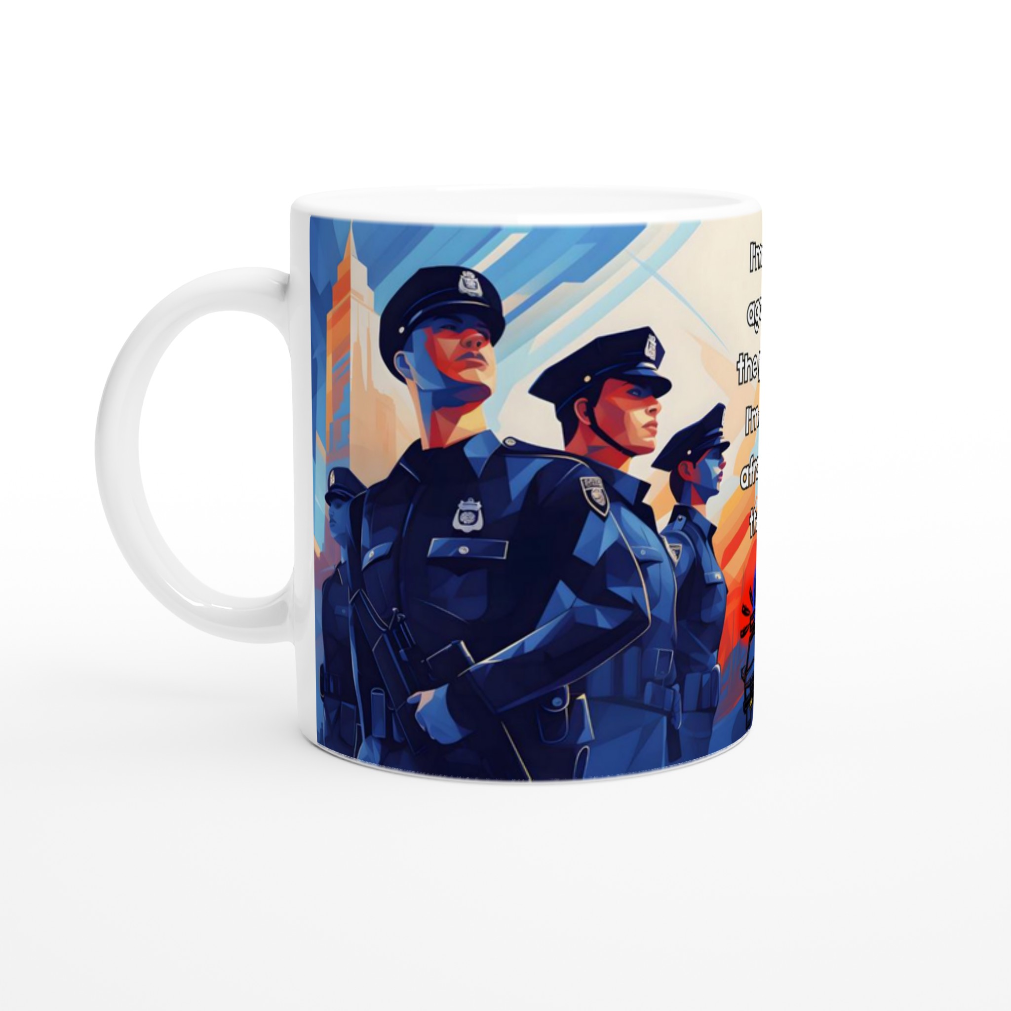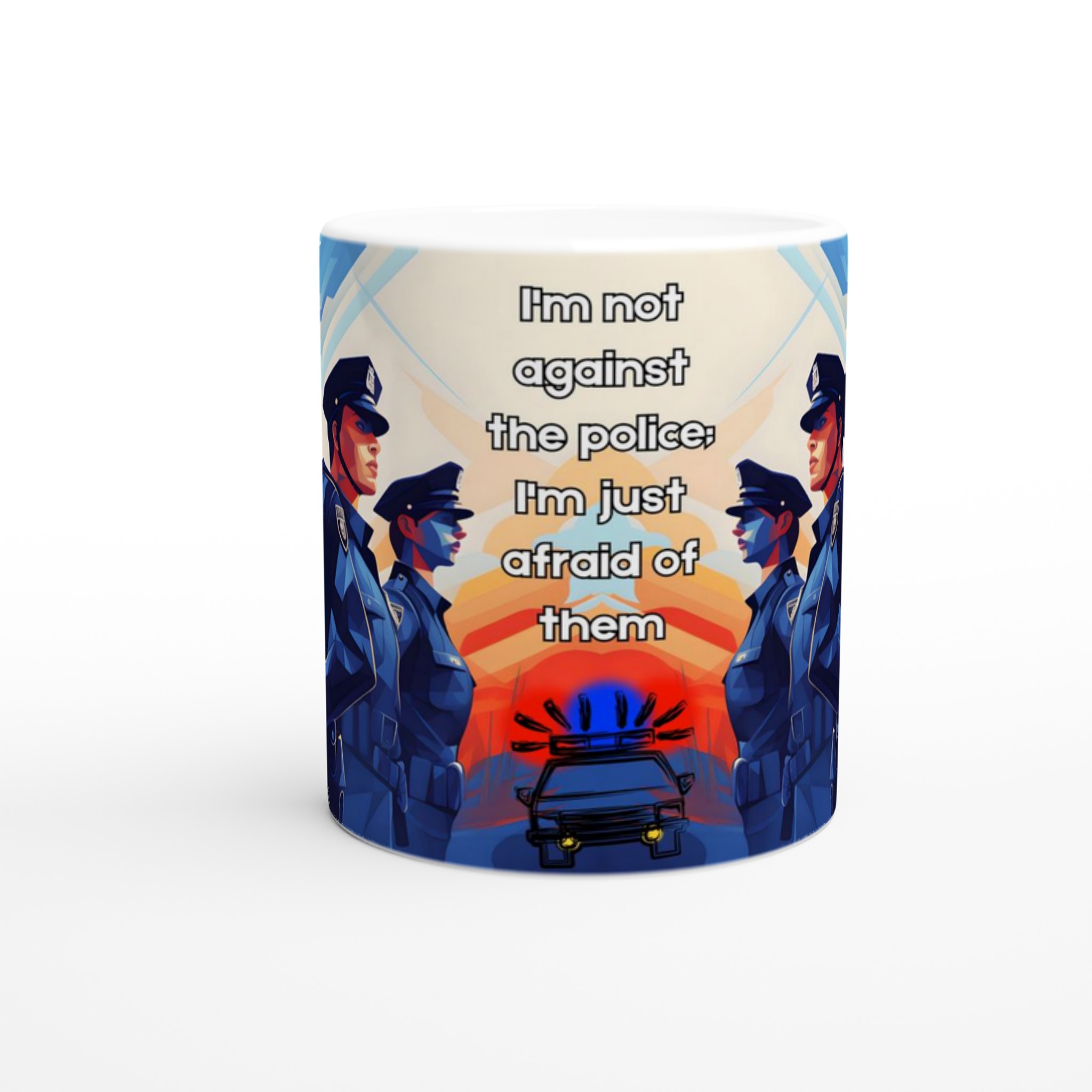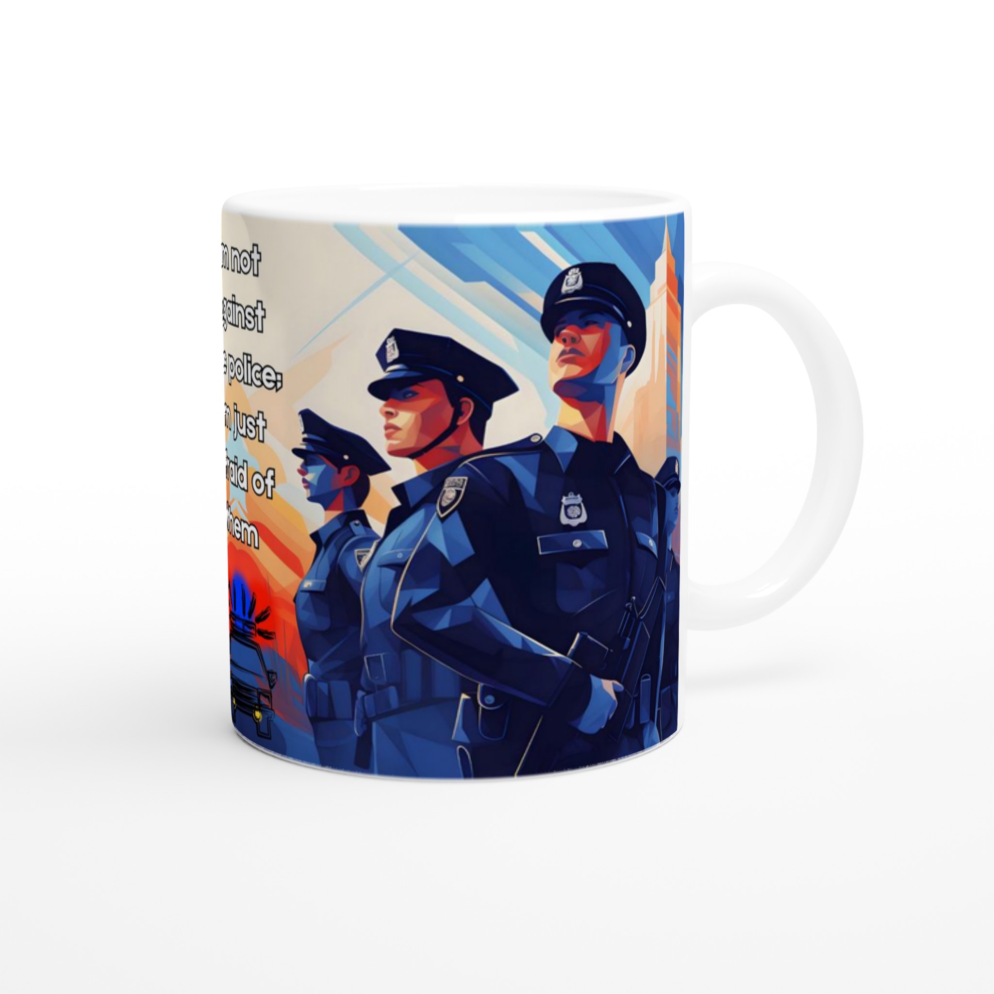Lyft din vardagsritual med en mugg som verkligen talar. Denna stilrena keramiska mugg blir snabbt en favorit, perfekt för morgonkaffet, kvällens varma choklad eller när du bara vill njuta av en kopp te. Med sitt tankeväckande motiv ”I’m not against the police: I’m just afraid of them” fångar den en stark känsla och en konstnärlig, kubistisk stil med djupt blåa och orangea nyanser. Den blanka vita ytan ser till att trycken framhävs med klara och levande färger, som håller sig fina även efter många turer i mikron och diskmaskinen.