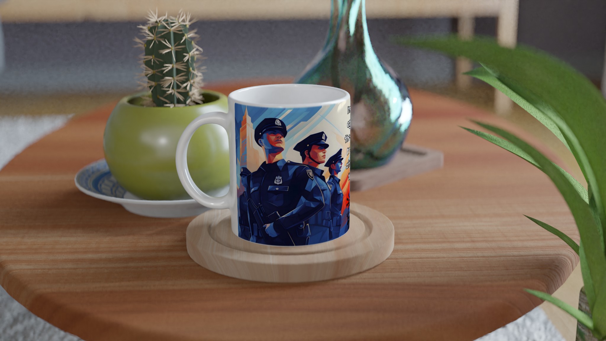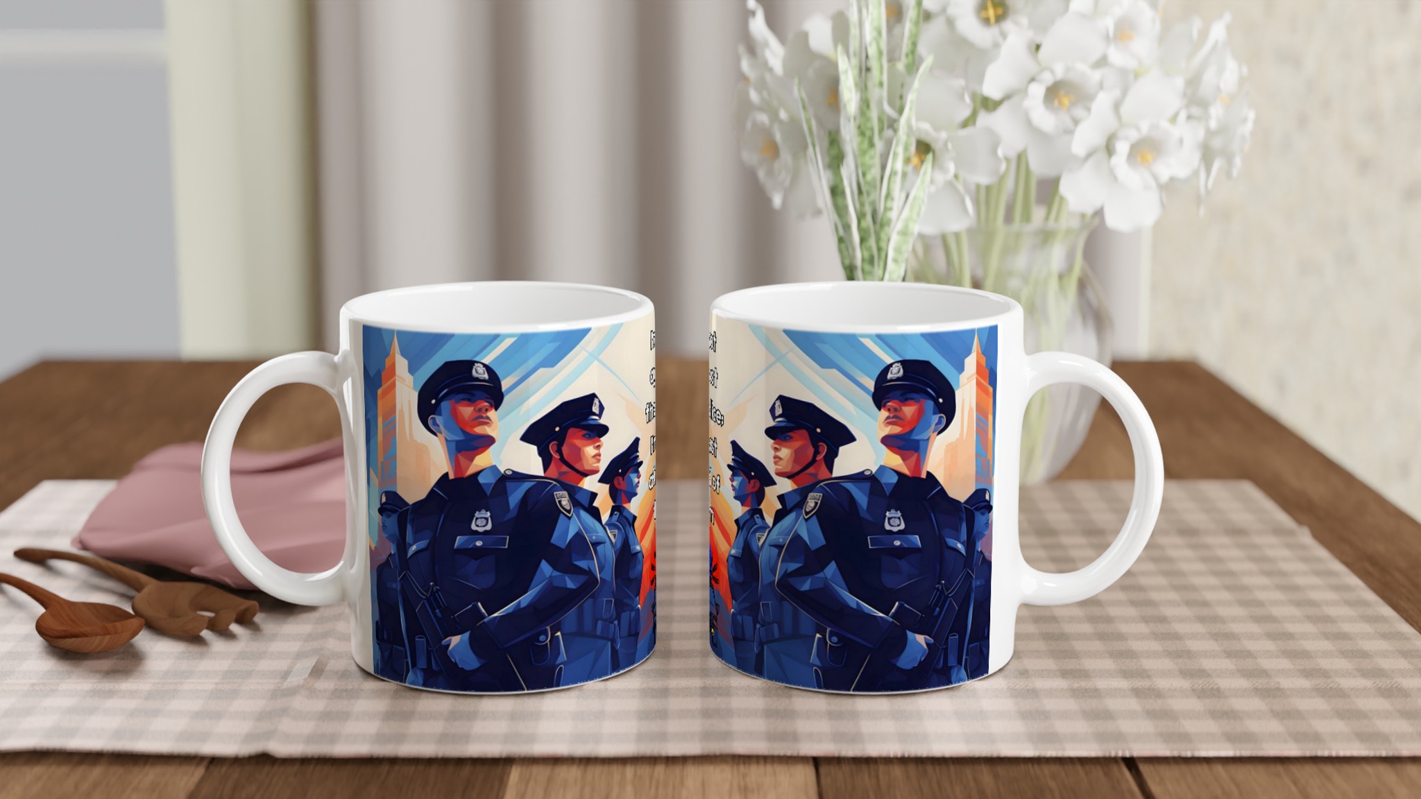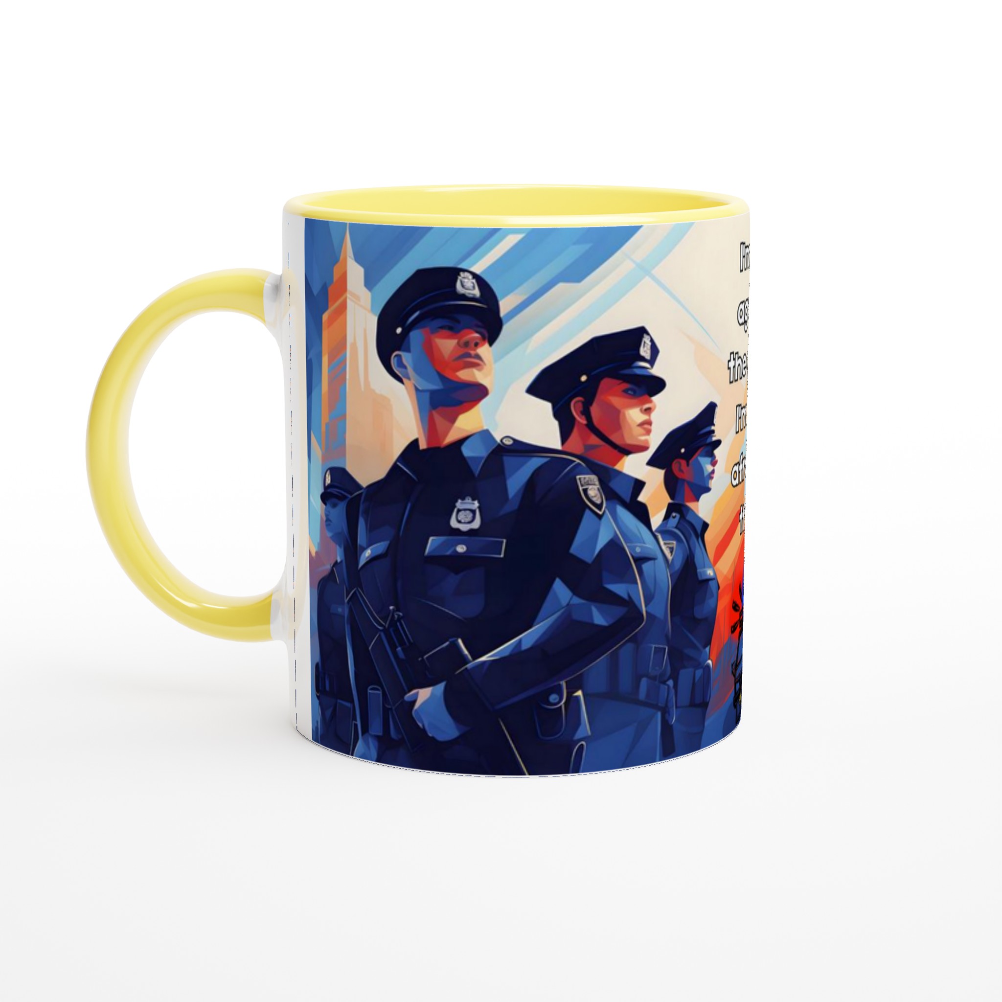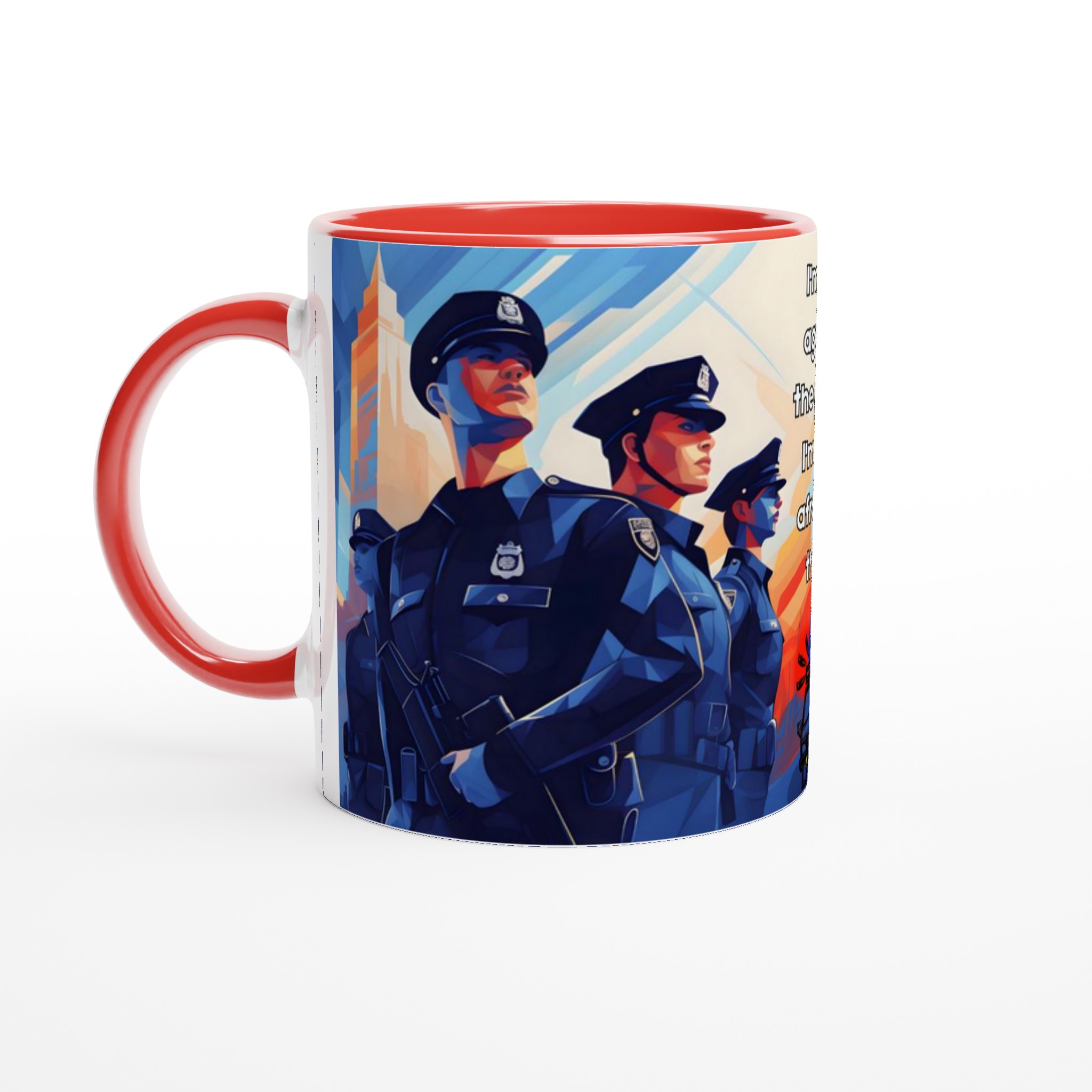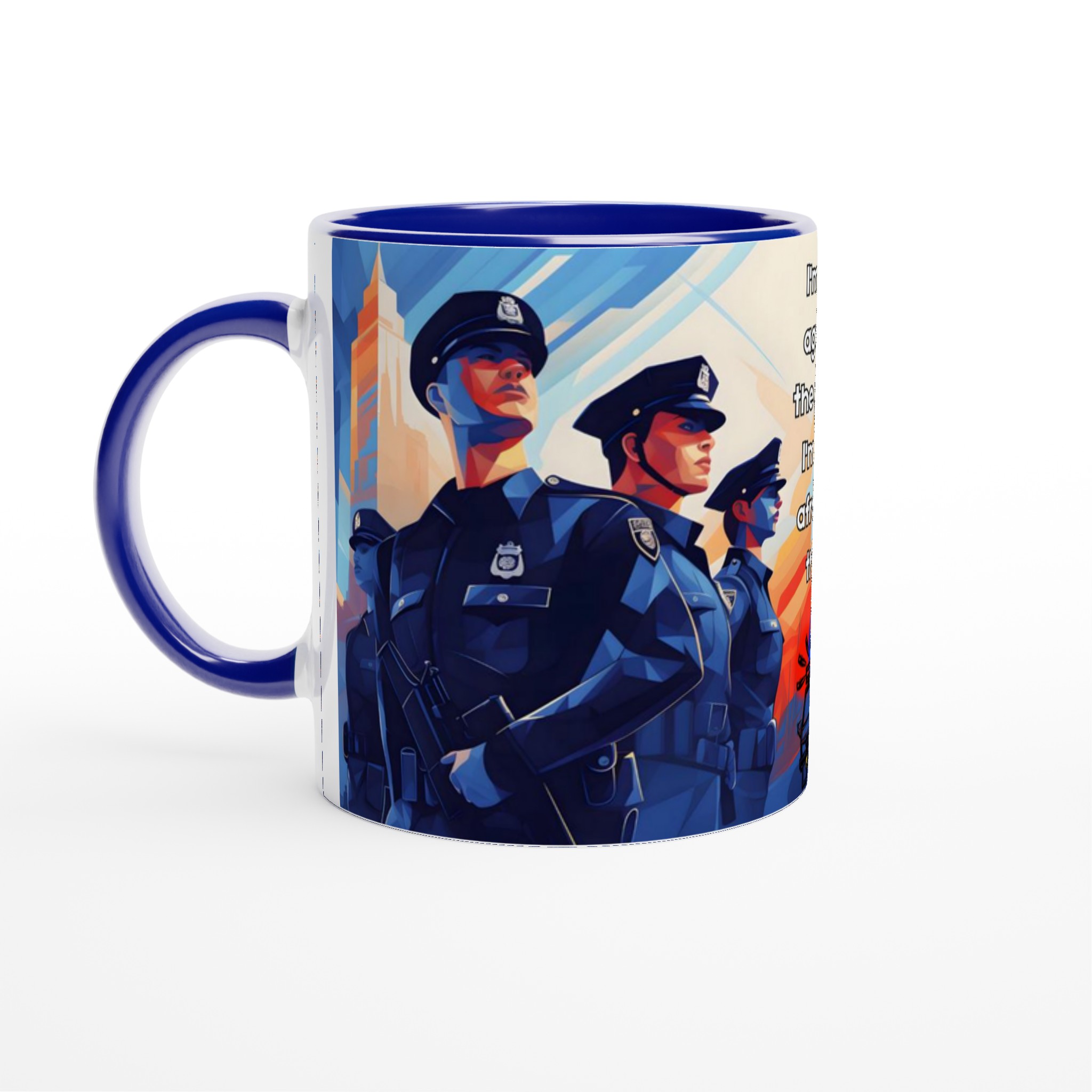 Lyft din vardagsritual med en mugg som verkligen talar. Denna stilrena keramiska mugg blir snabbt en favorit, perfekt för morgonkaffet, kvällens varma choklad eller när du bara vill njuta av en kopp te. Med sitt tankeväckande motiv ”I’m not against the police: I’m just afraid of them” fångar den en stark känsla och en konstnärlig, kubistisk stil med djupt blåa och orangea nyanser. Den blanka vita ytan ser till att trycken framhävs med klara och levande färger, som håller sig fina även efter många turer i mikron och diskmaskinen.