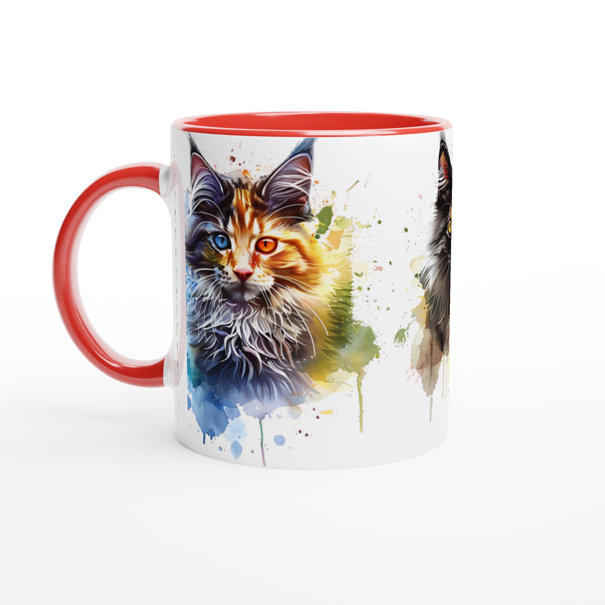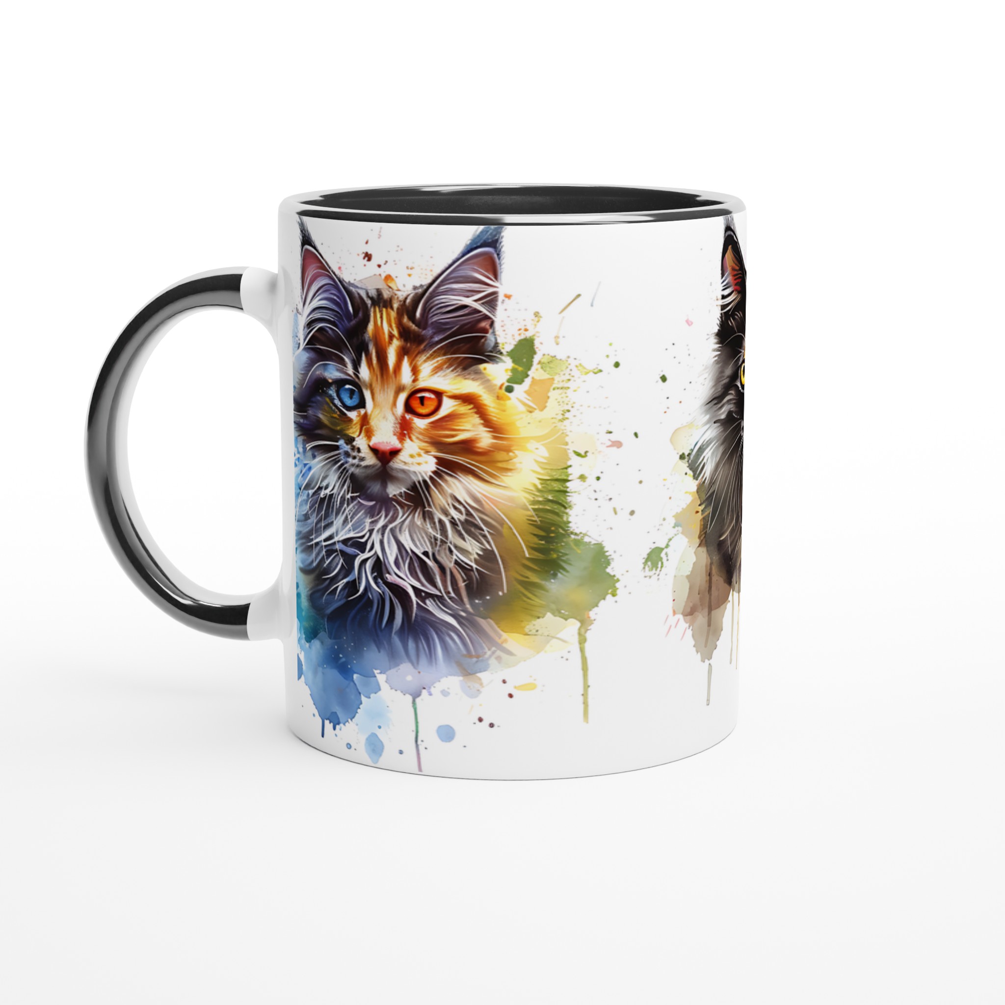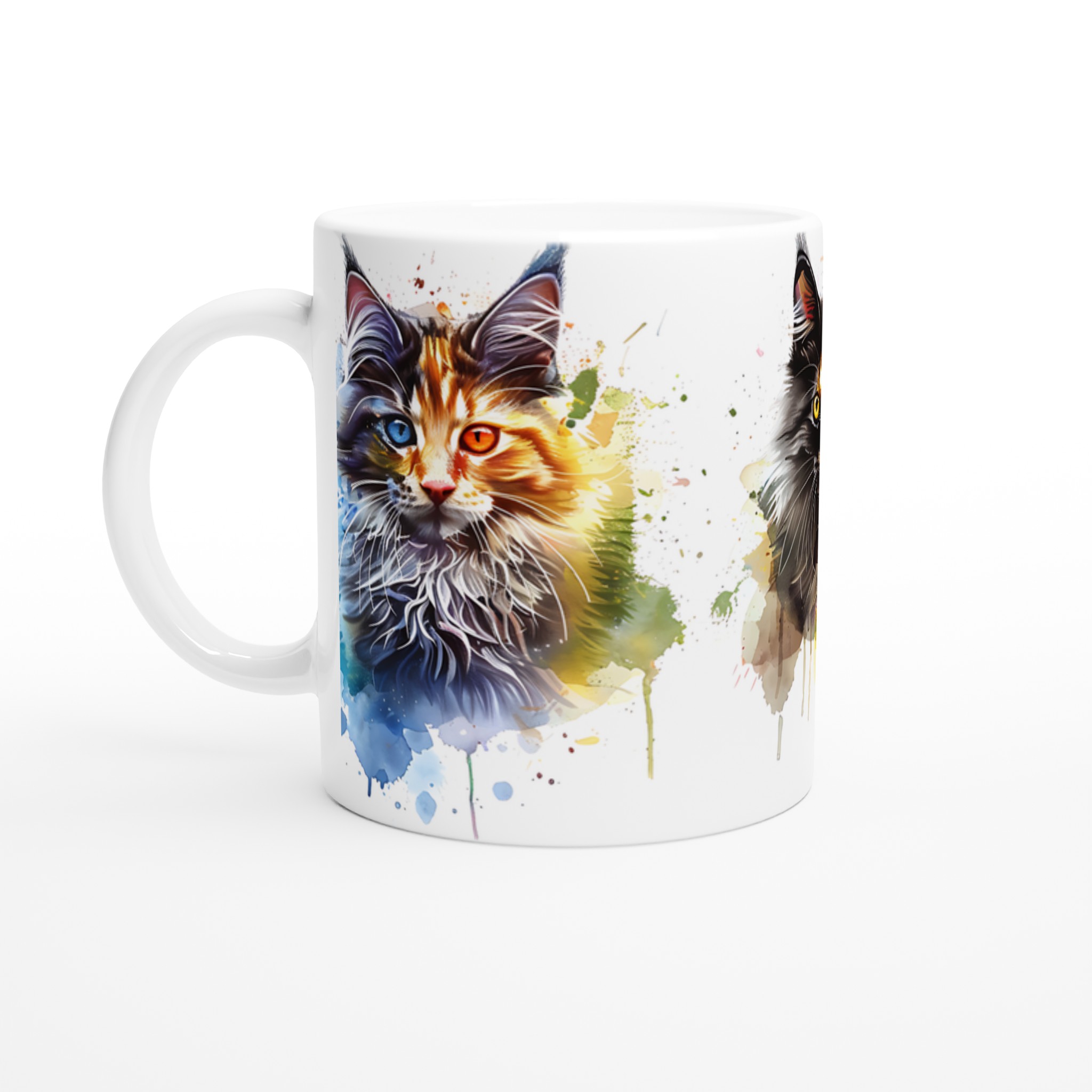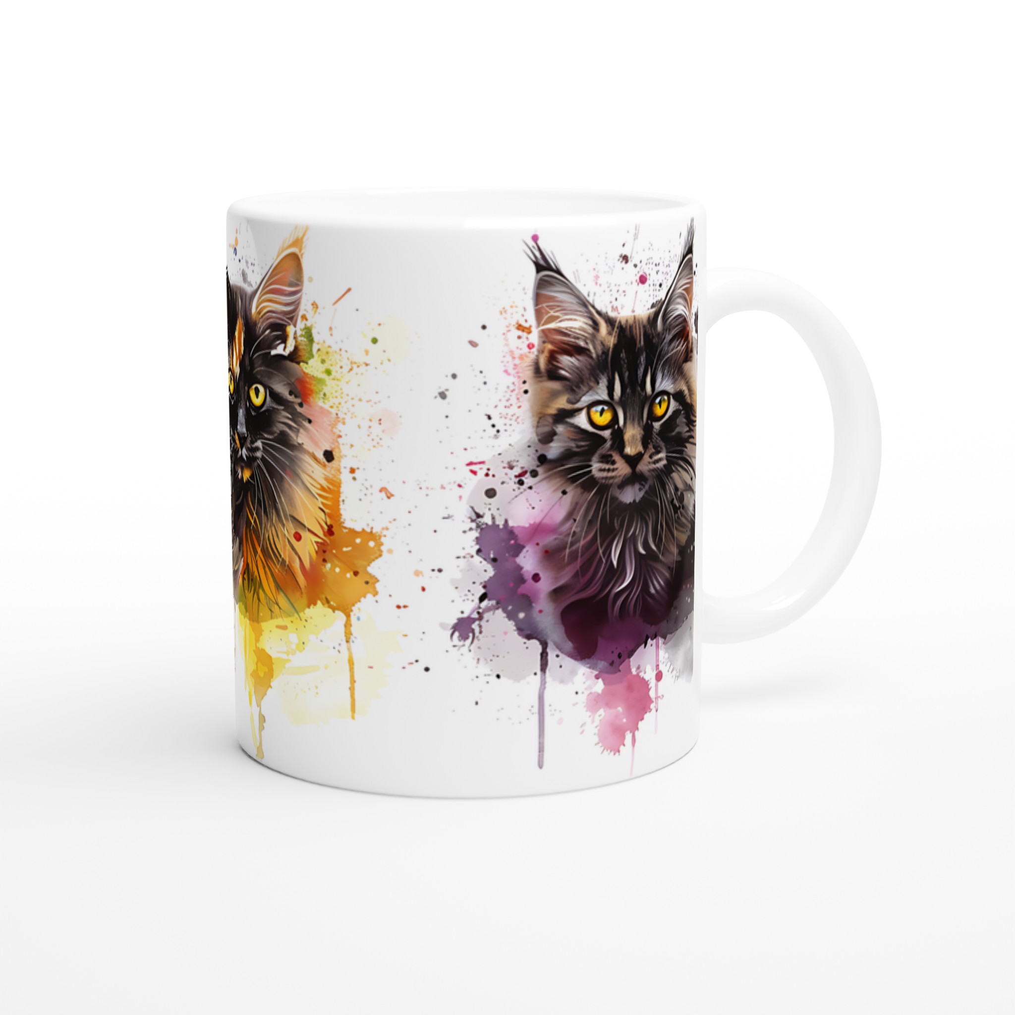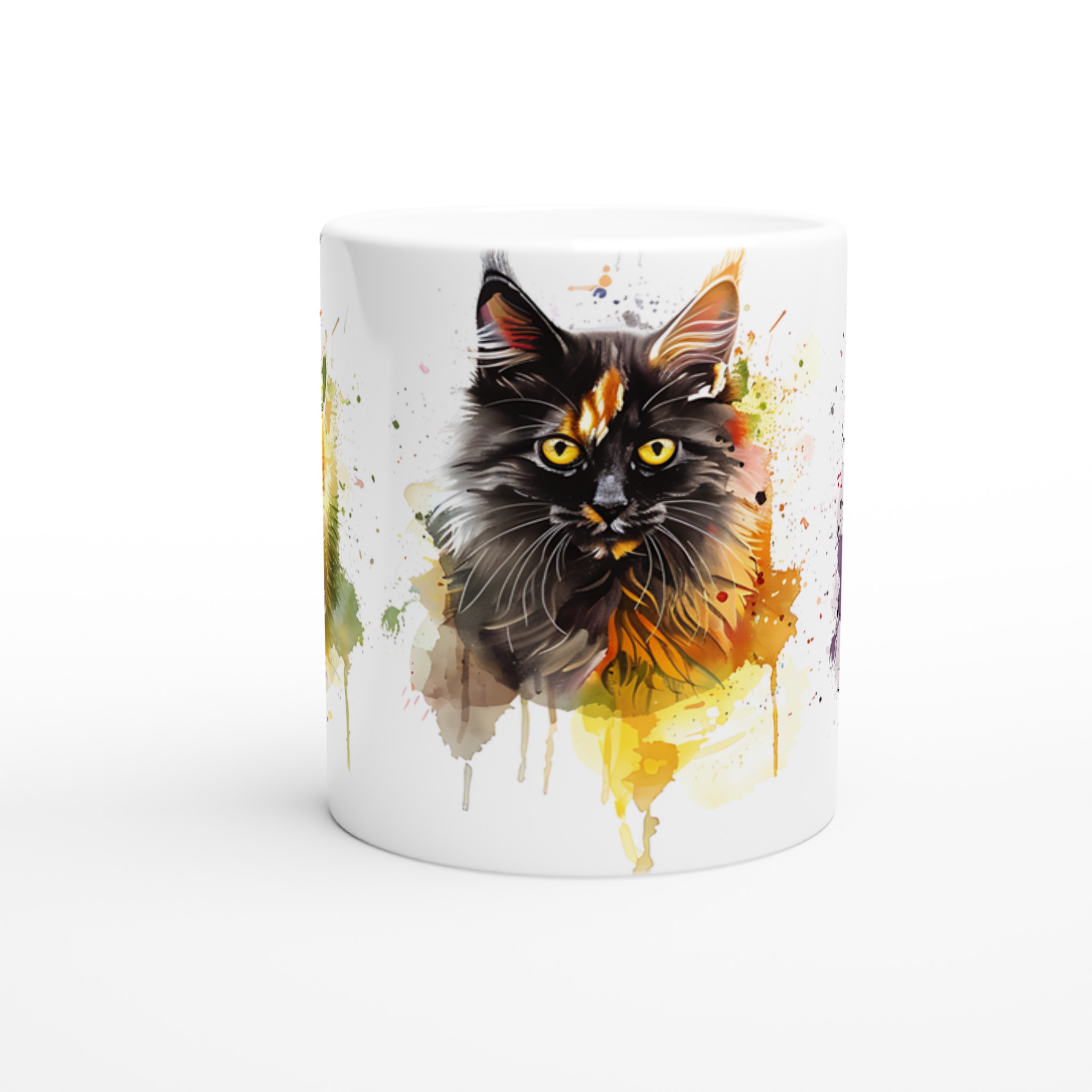 Ge din kaffestund en touch av lekfull konst med vår ”Akvarellkatt”-mugg! Denna unika keramiska mugg blir snabbt en vardagsfavorit, perfekt för morgonkaffet, kvällens varma choklad eller när du bara vill njuta av en kopp te. Med sitt livfulla akvarellporträtt av en katt, omgiven av stänk av blått, orange och lila, förvandlar den varje dryck till en inspirerande upplevelse. Den blanka vita ytan ser till att trycken framhävs med klara och levande färger, som håller sig fina även efter många turer i mikron och diskmaskinen.