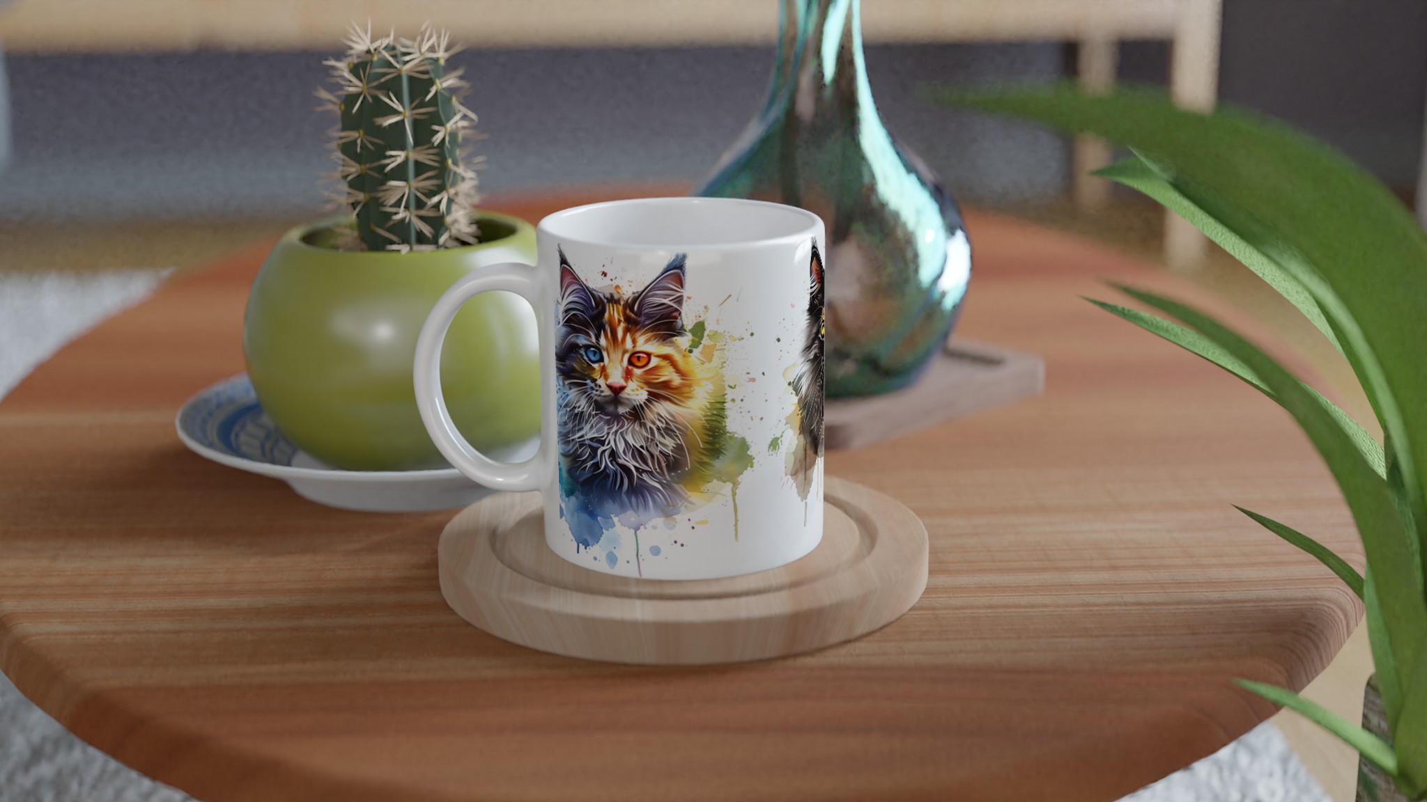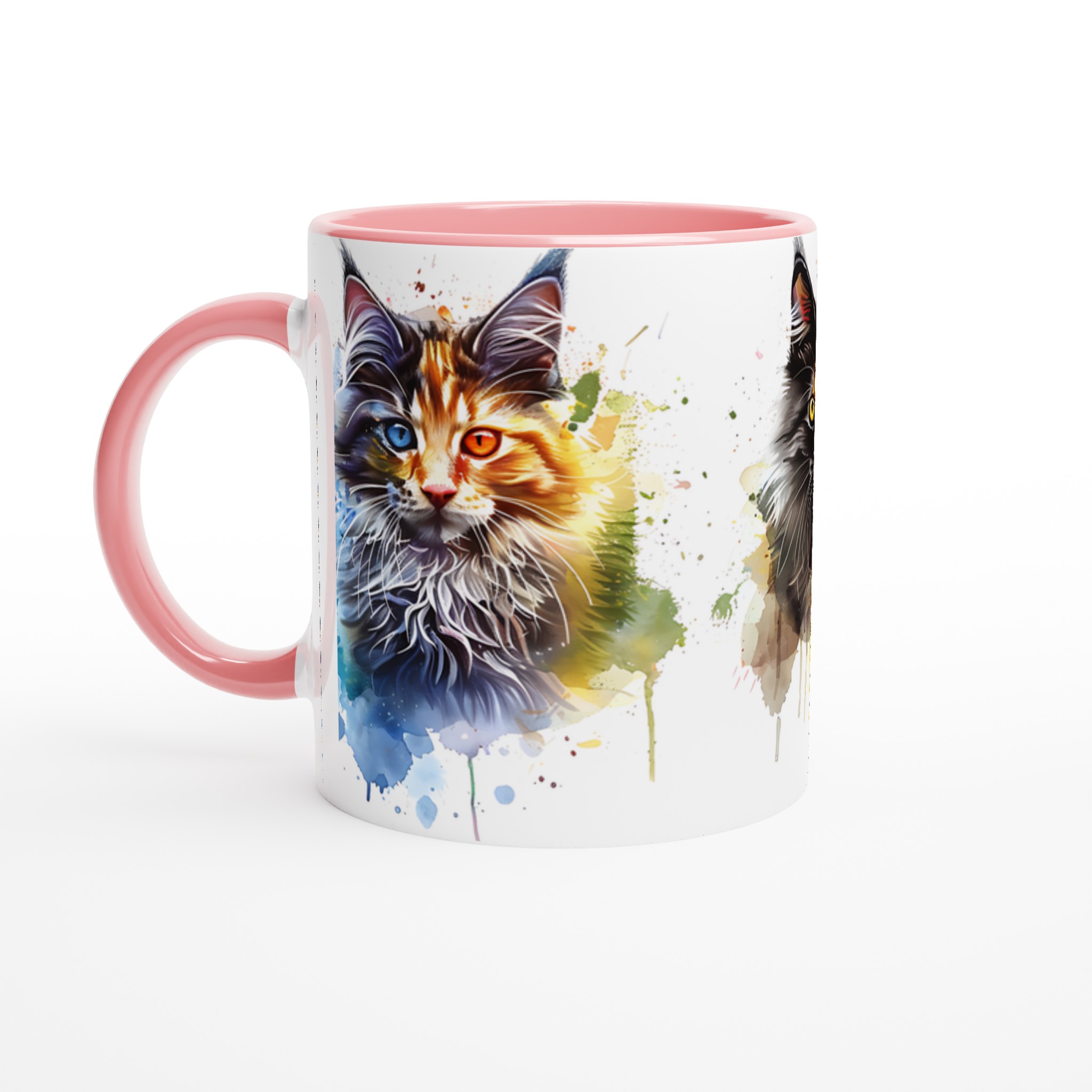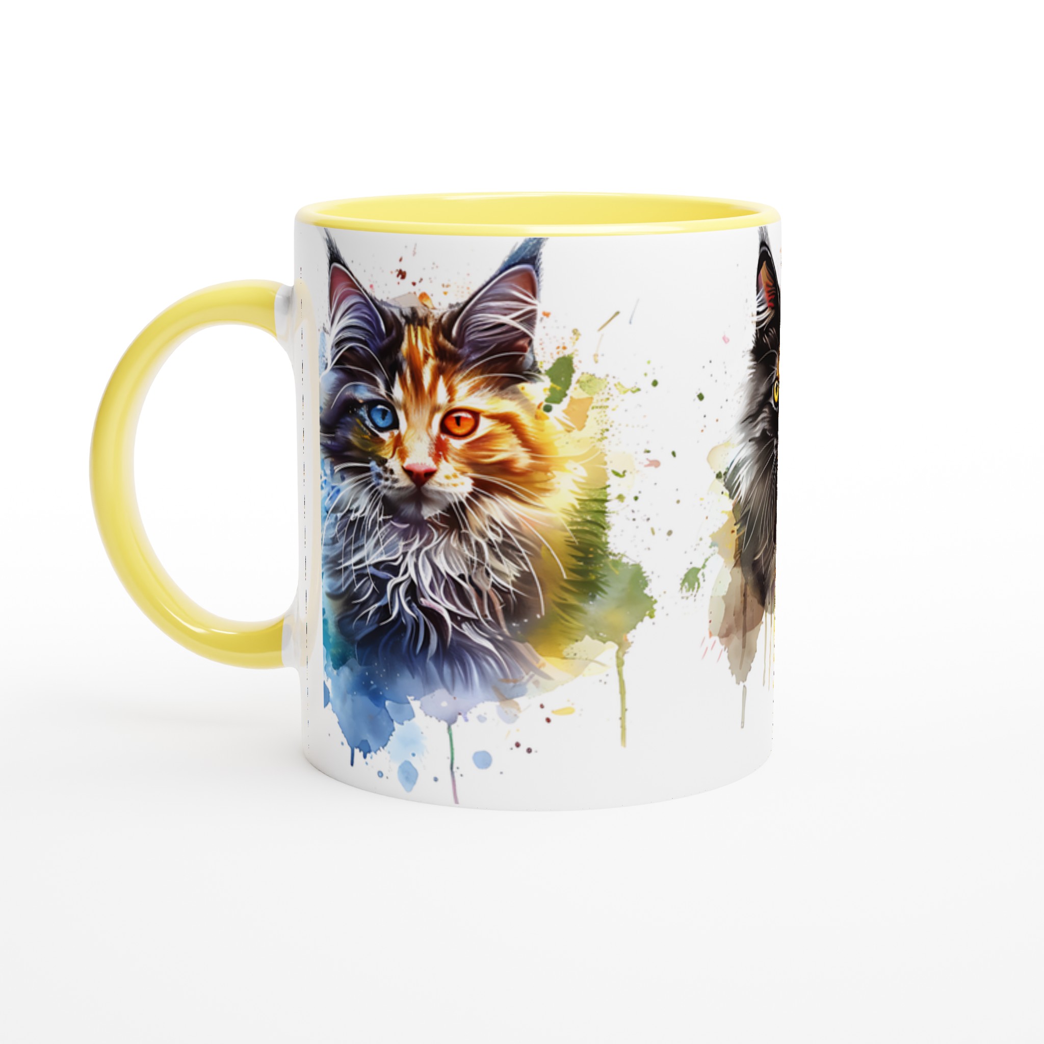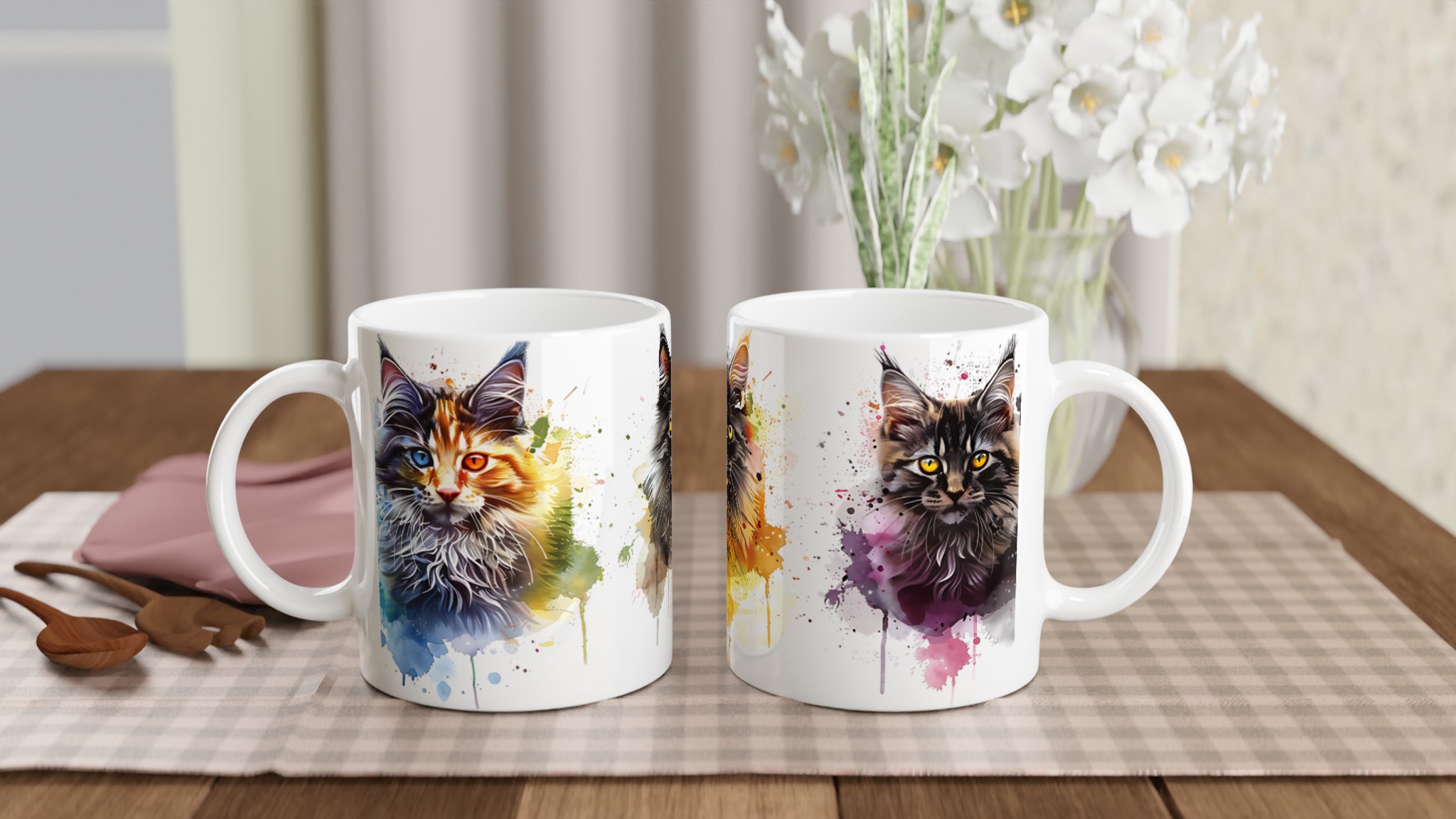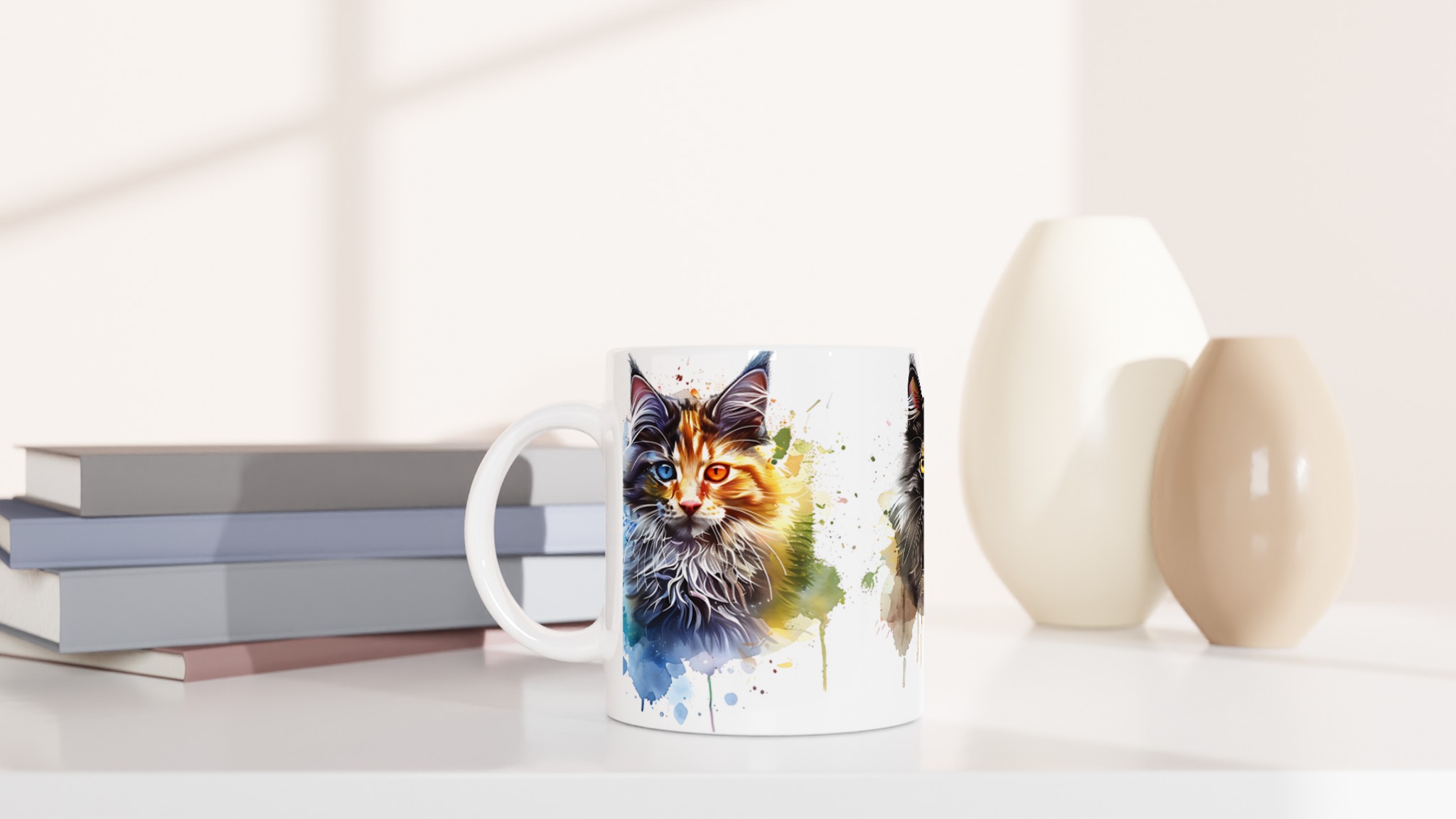 Ge din kaffestund en touch av lekfull konst med vår ”Akvarellkatt”-mugg! Denna unika keramiska mugg blir snabbt en vardagsfavorit, perfekt för morgonkaffet, kvällens varma choklad eller när du bara vill njuta av en kopp te. Med sitt livfulla akvarellporträtt av en katt, omgiven av stänk av blått, orange och lila, förvandlar den varje dryck till en inspirerande upplevelse. Den blanka vita ytan ser till att trycken framhävs med klara och levande färger, som håller sig fina även efter många turer i mikron och diskmaskinen.