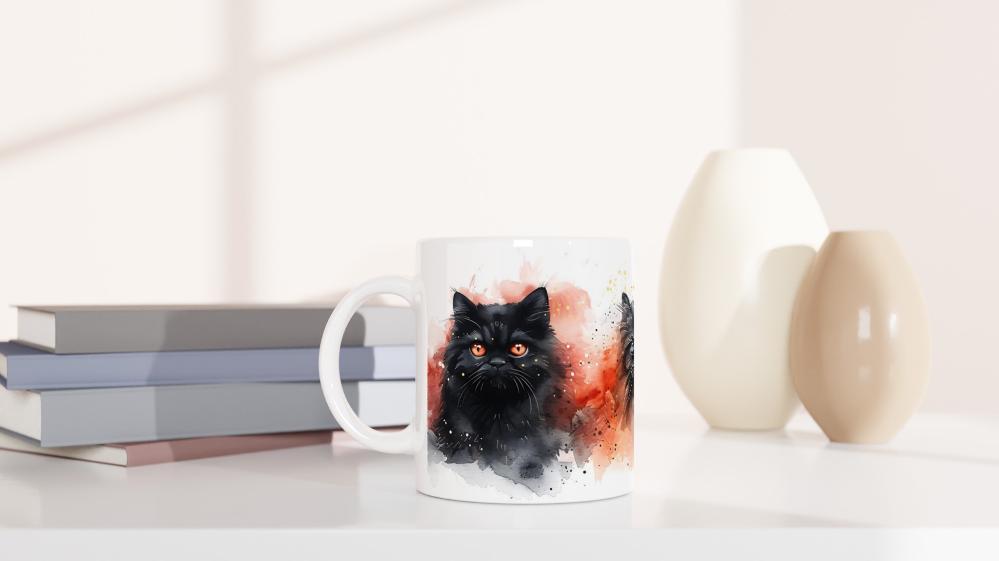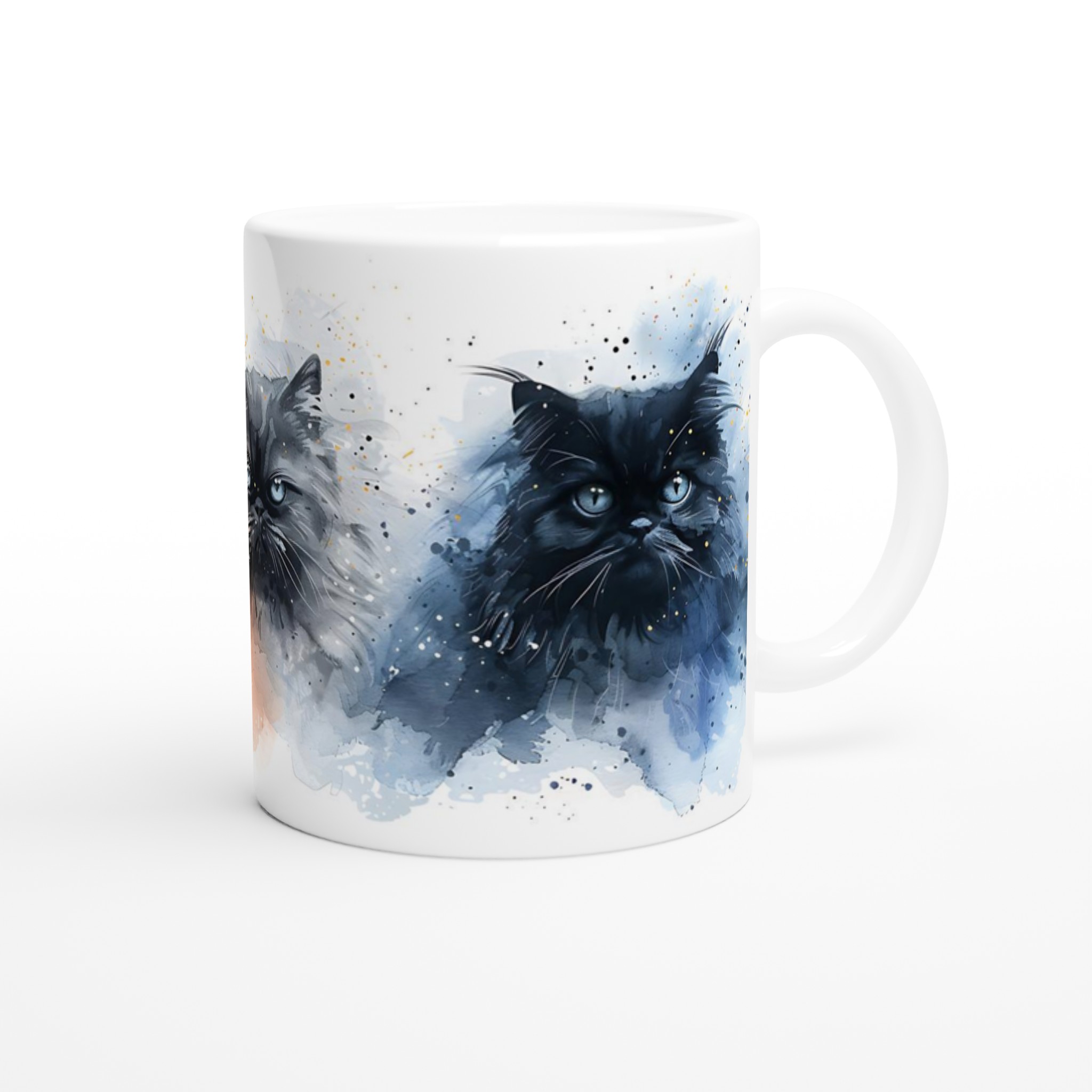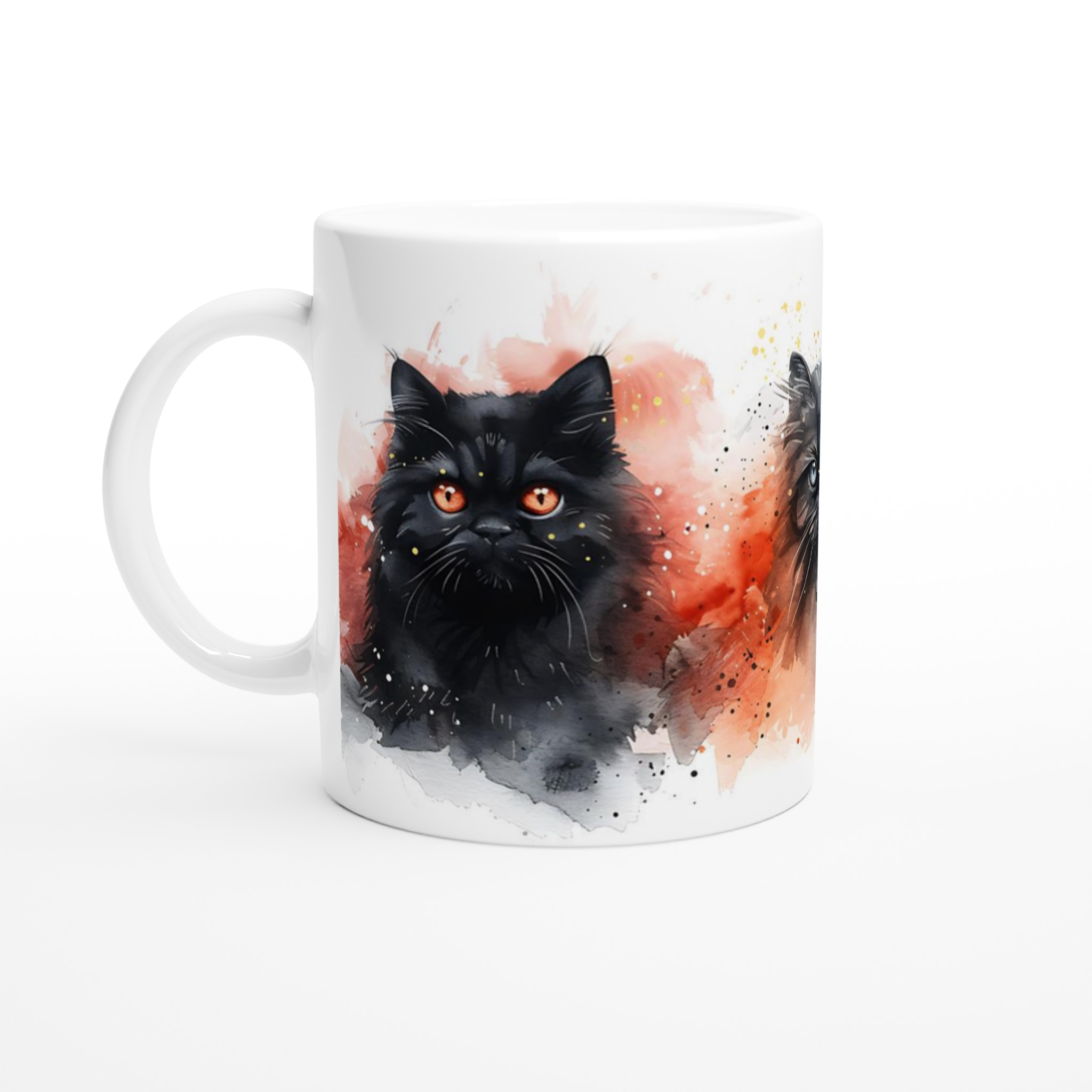 Fånga magin i varje klunk med vår unika keramiska mugg, prydd med en fantastisk akvarellillustration av mystiska, lurviga katter. Denna stilrena mugg blir snabbt en vardagsfavorit, perfekt för morgonkaffet, kvällens varma choklad, eller när du bara vill njuta av en kopp te i gott sällskap av din nya favoritkatt.