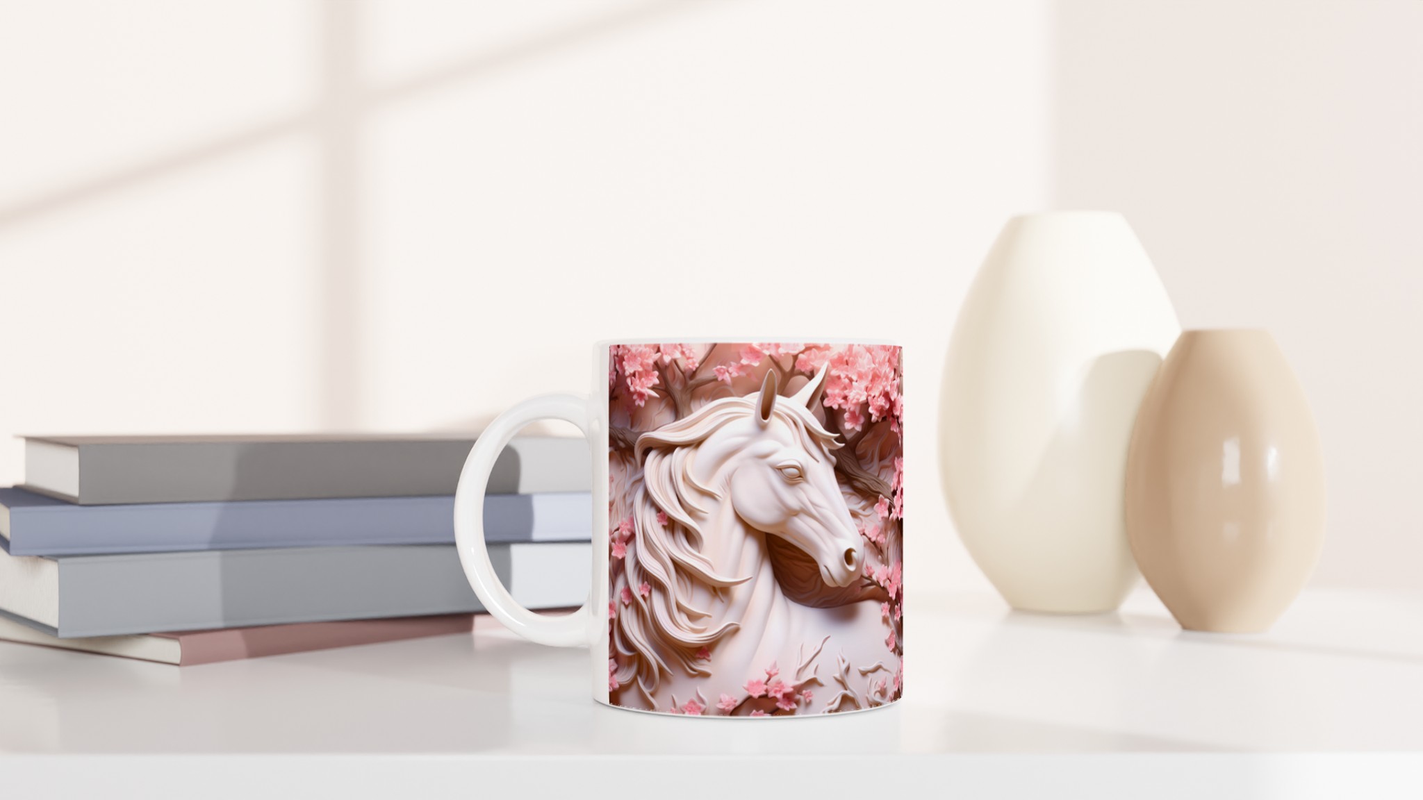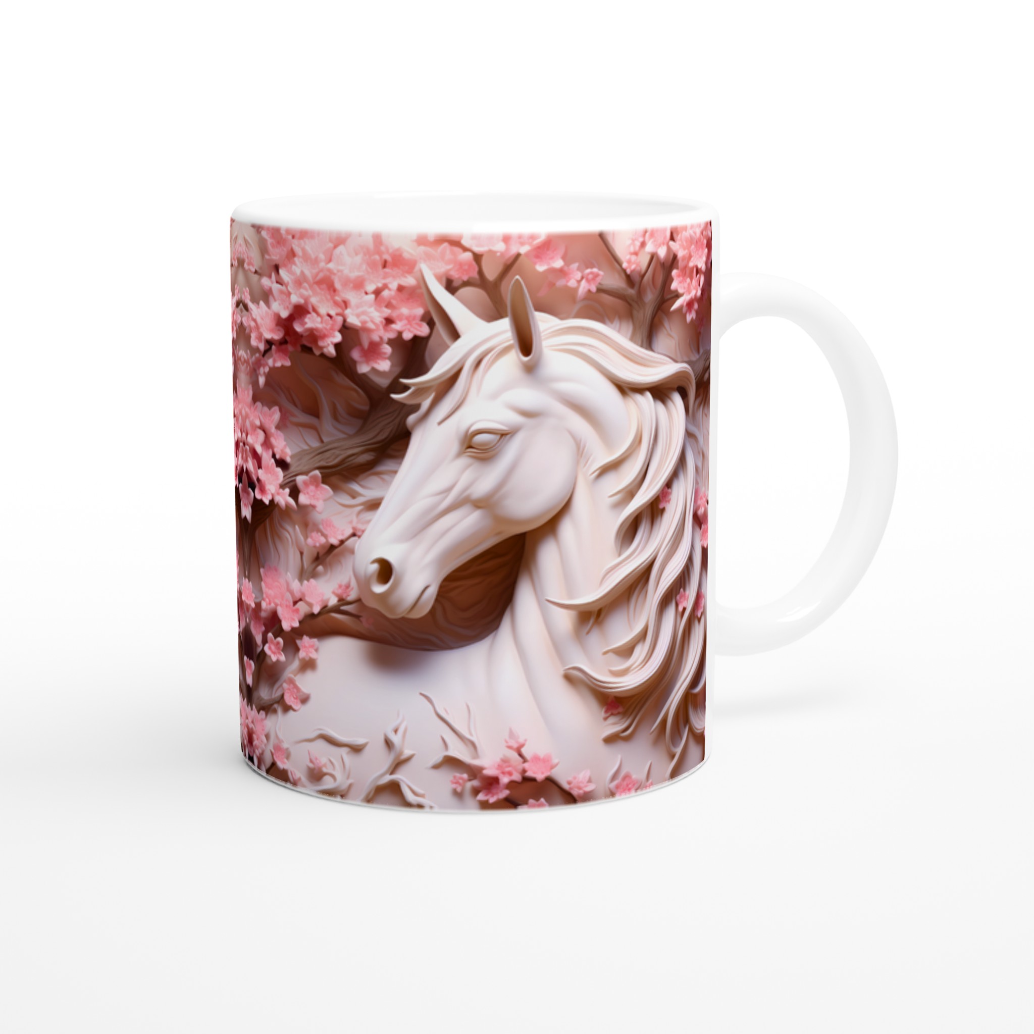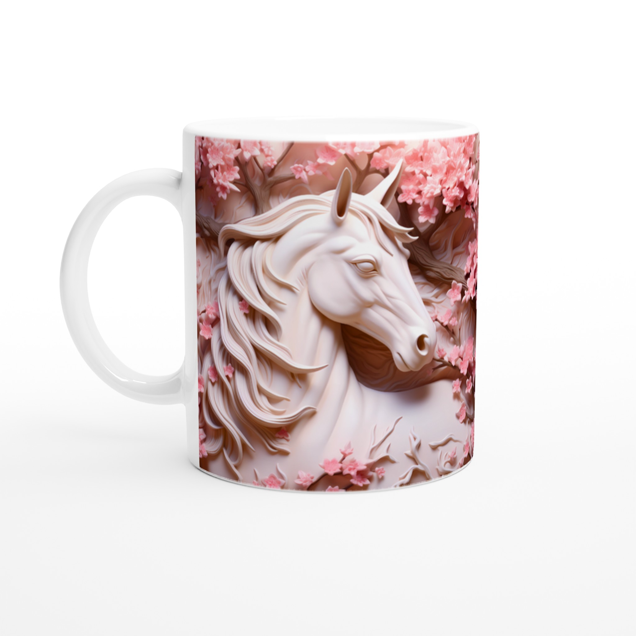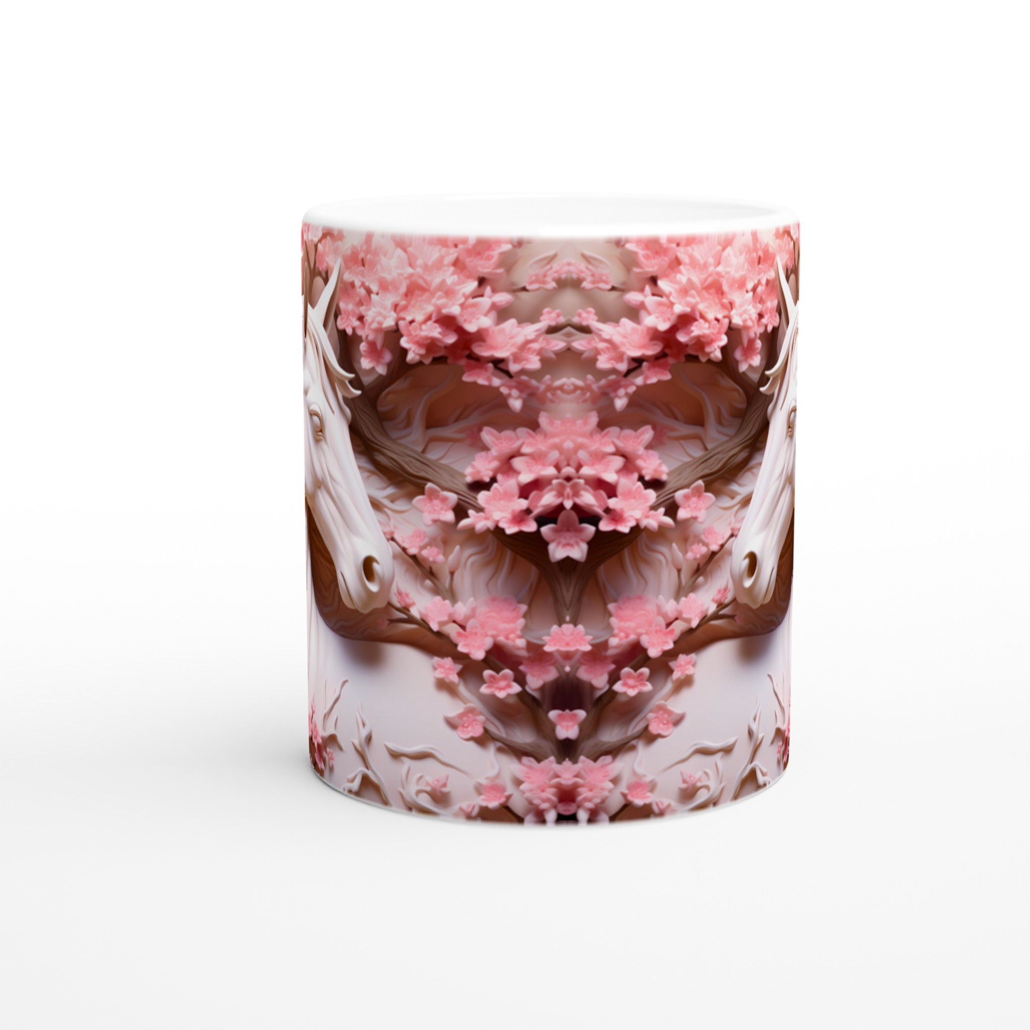 Låt dig förtrollas av denna drömlika keramiska mugg, prydd med en konstnärlig framställning av en häst omgiven av ljuvliga körsbärsblommor i mjuka rosa nyanser. Denna mugg blir snabbt en vardagsfavorit, perfekt för morgonkaffet, kvällens varma choklad eller när du bara vill njuta av en lugn kopp te. Den blanka vita ytan ser till att trycken framhävs med klara och levande färger, som håller sig fina även efter många turer i mikron och diskmaskinen.