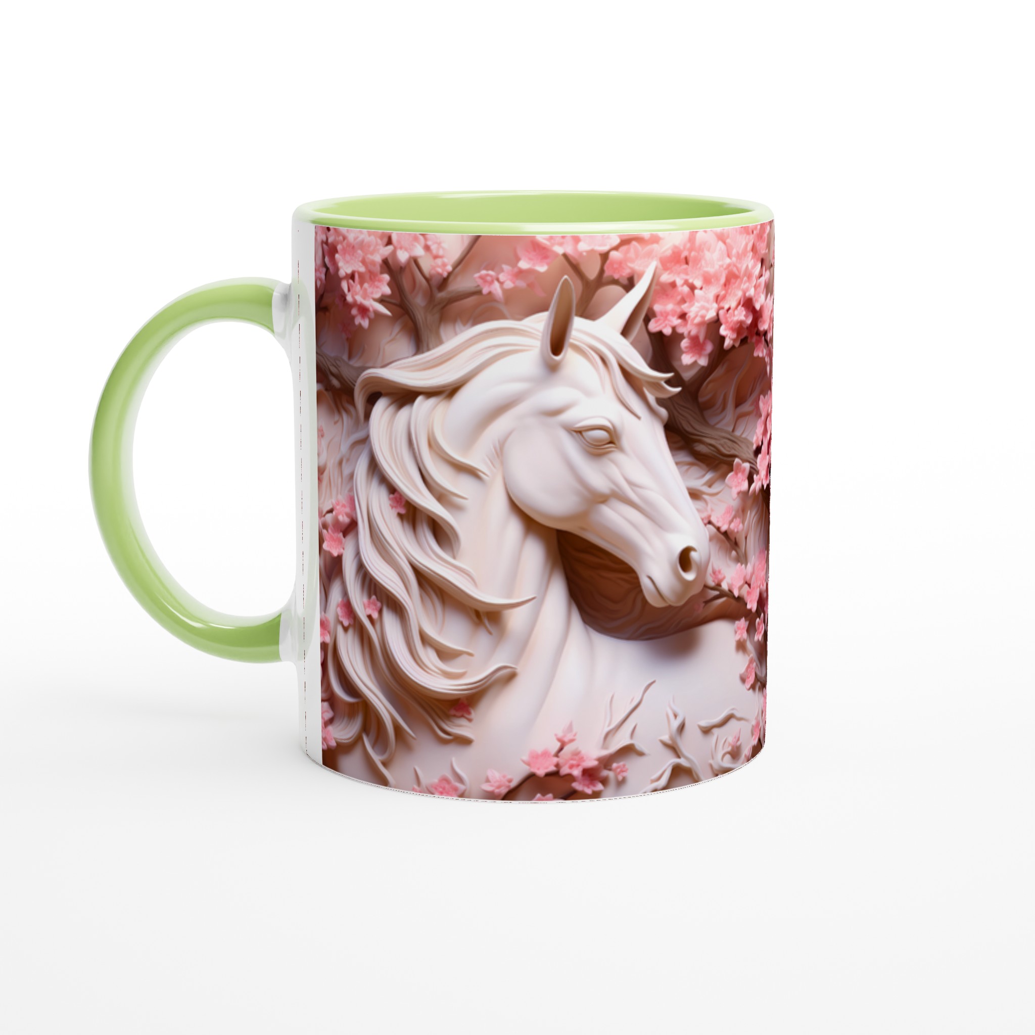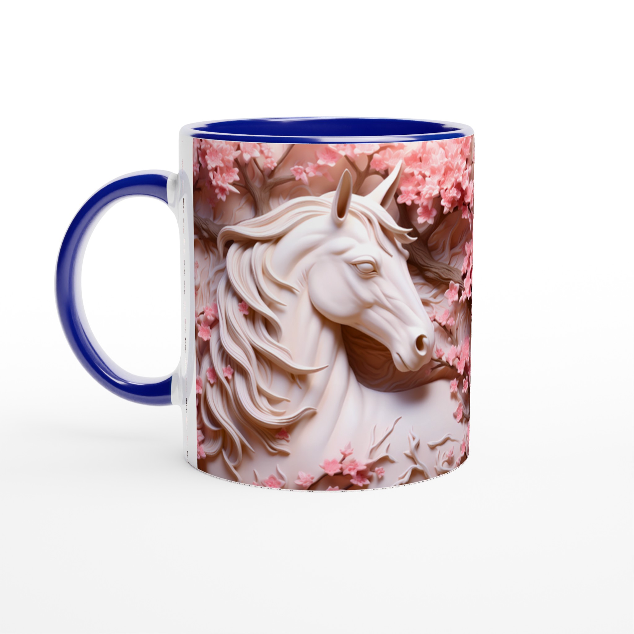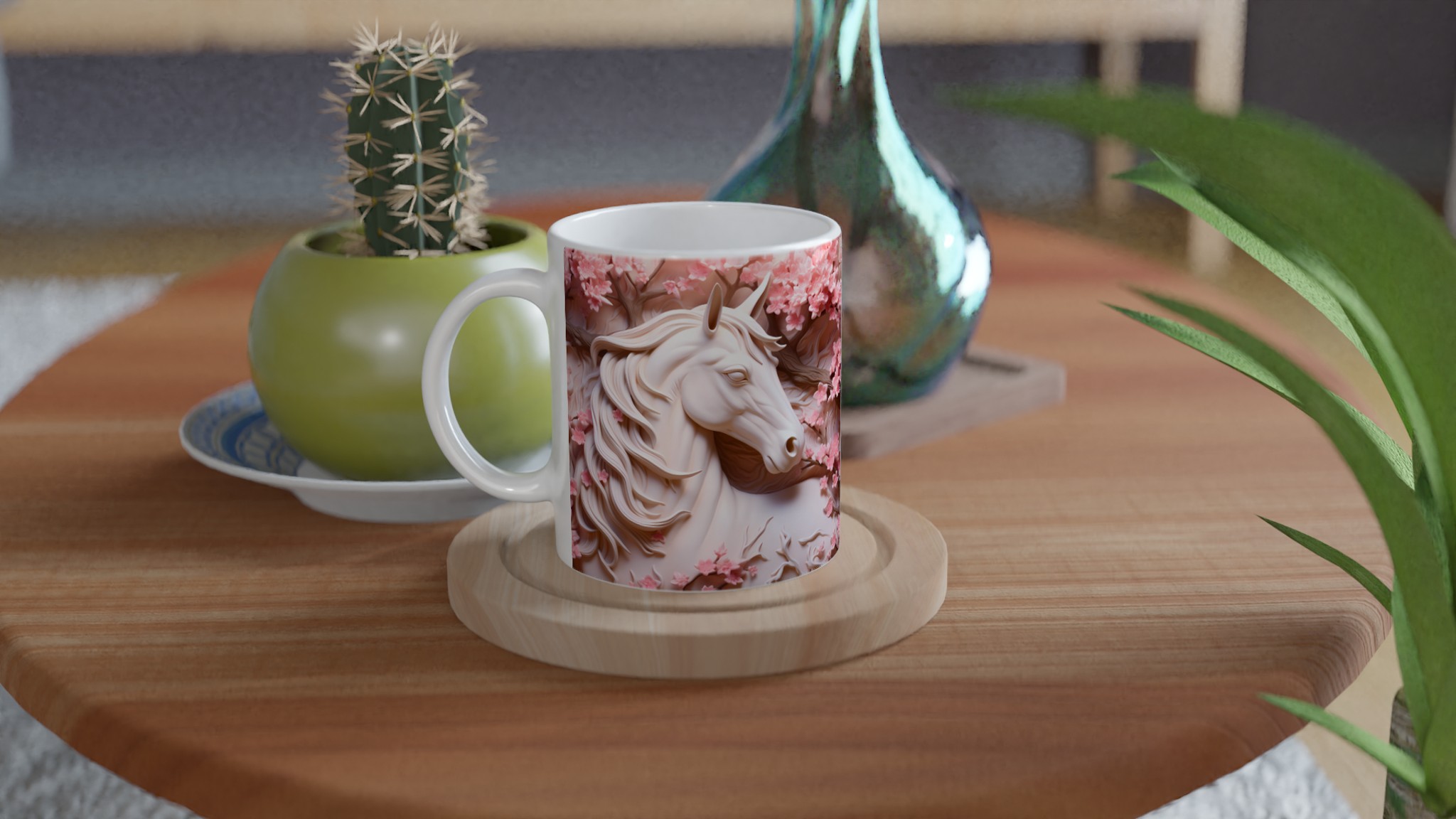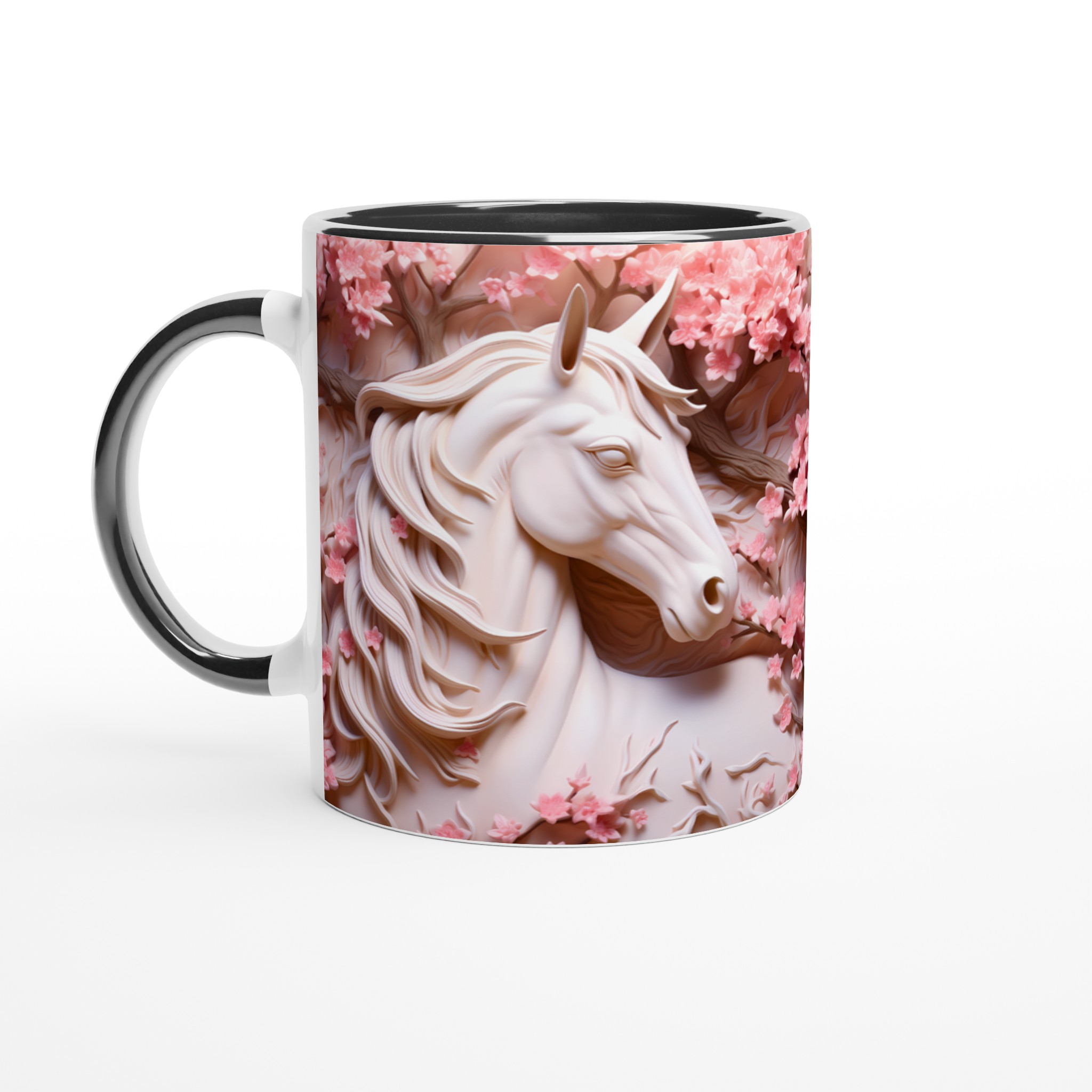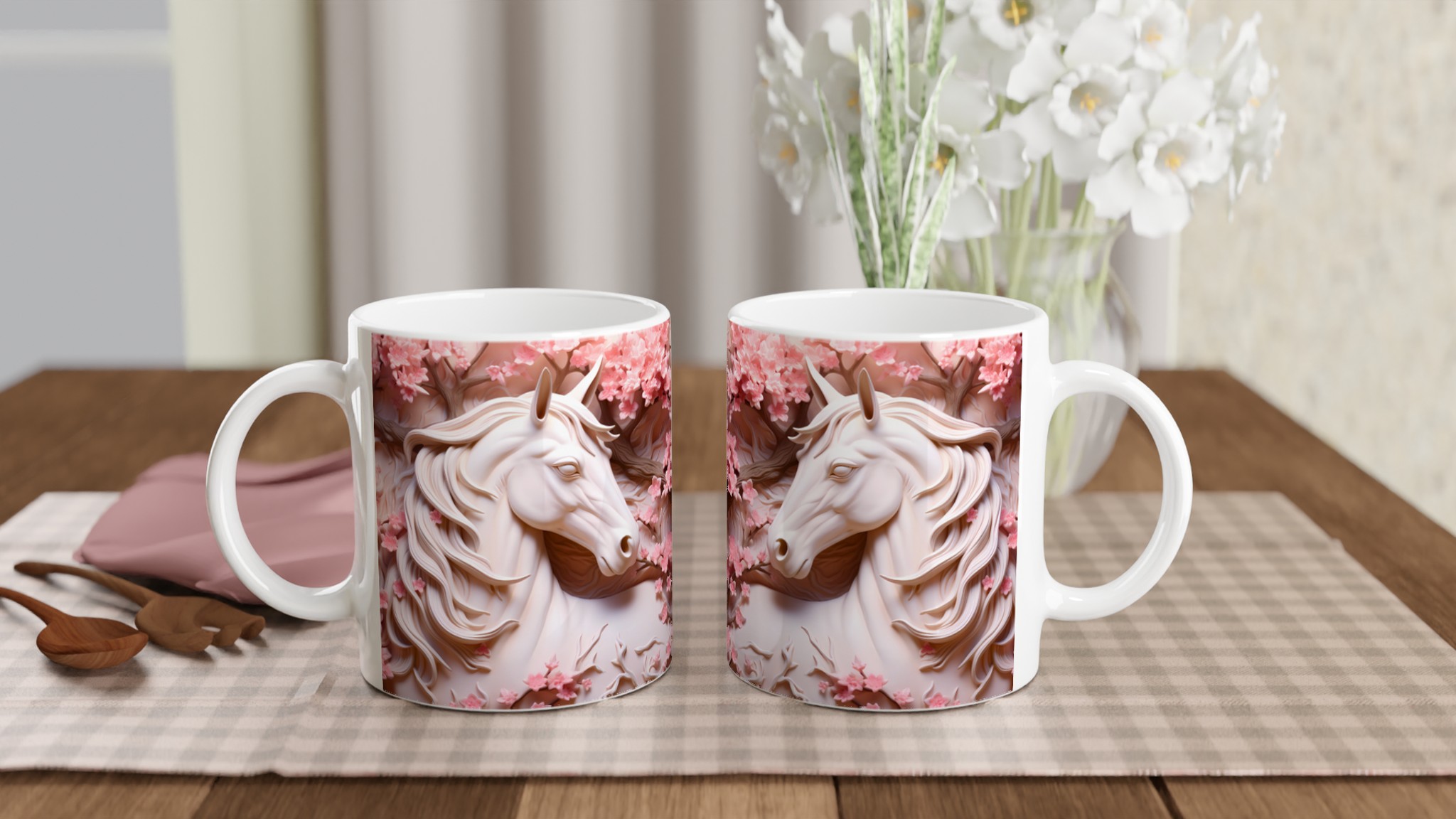 Låt dig förtrollas av denna drömlika keramiska mugg, prydd med en konstnärlig framställning av en häst omgiven av ljuvliga körsbärsblommor i mjuka rosa nyanser. Denna mugg blir snabbt en vardagsfavorit, perfekt för morgonkaffet, kvällens varma choklad eller när du bara vill njuta av en lugn kopp te. Den blanka vita ytan ser till att trycken framhävs med klara och levande färger, som håller sig fina även efter många turer i mikron och diskmaskinen.