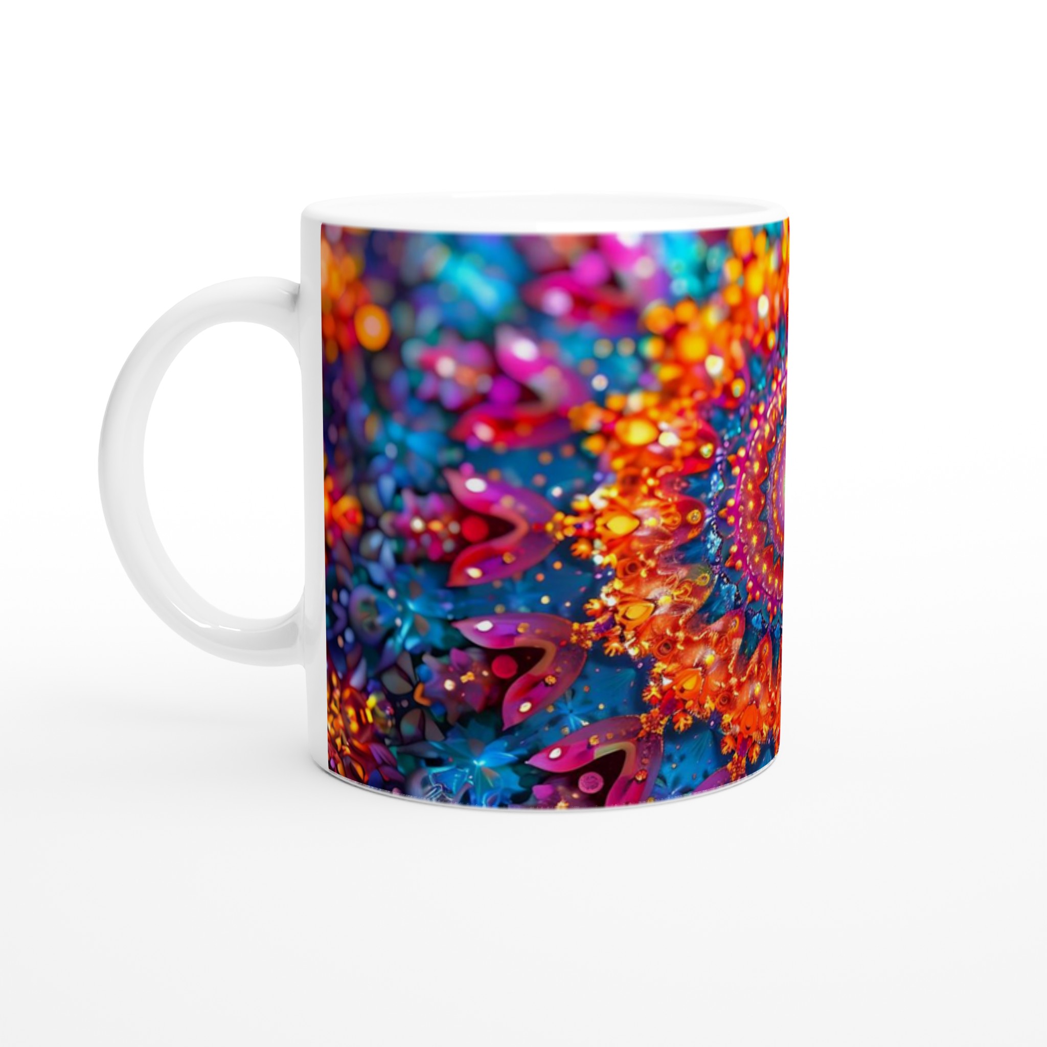 Upplev en explosion av färg med vår ”Kosmisk Kalejdoskop” keramikmugg. Denna mugg förvandlar din fikapaus till en stund av ren förundran, med ett fascinerande mönster i djupa blåa, skimrande lila och eldiga orange toner. Inspirerad av universums oändliga skönhet och psykedeliska drömlandskap, är varje sipp från denna mugg en resa till en annan dimension.