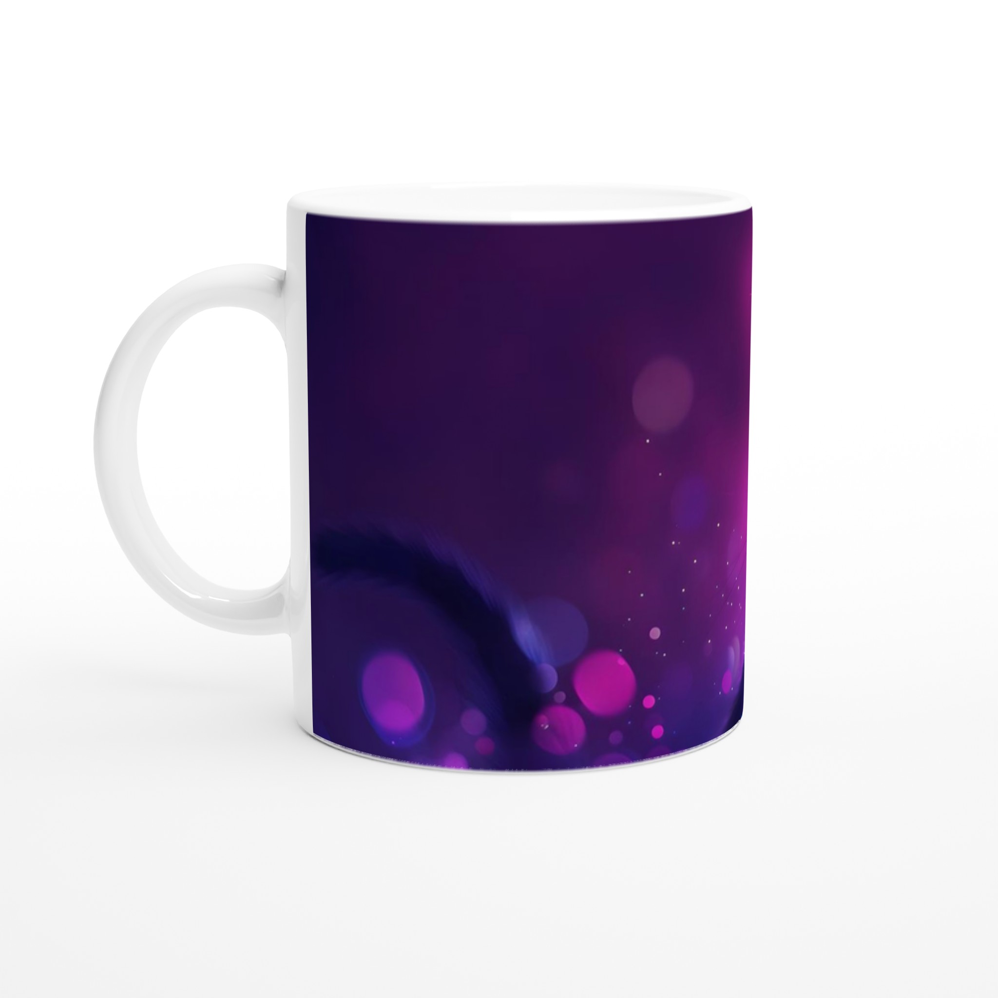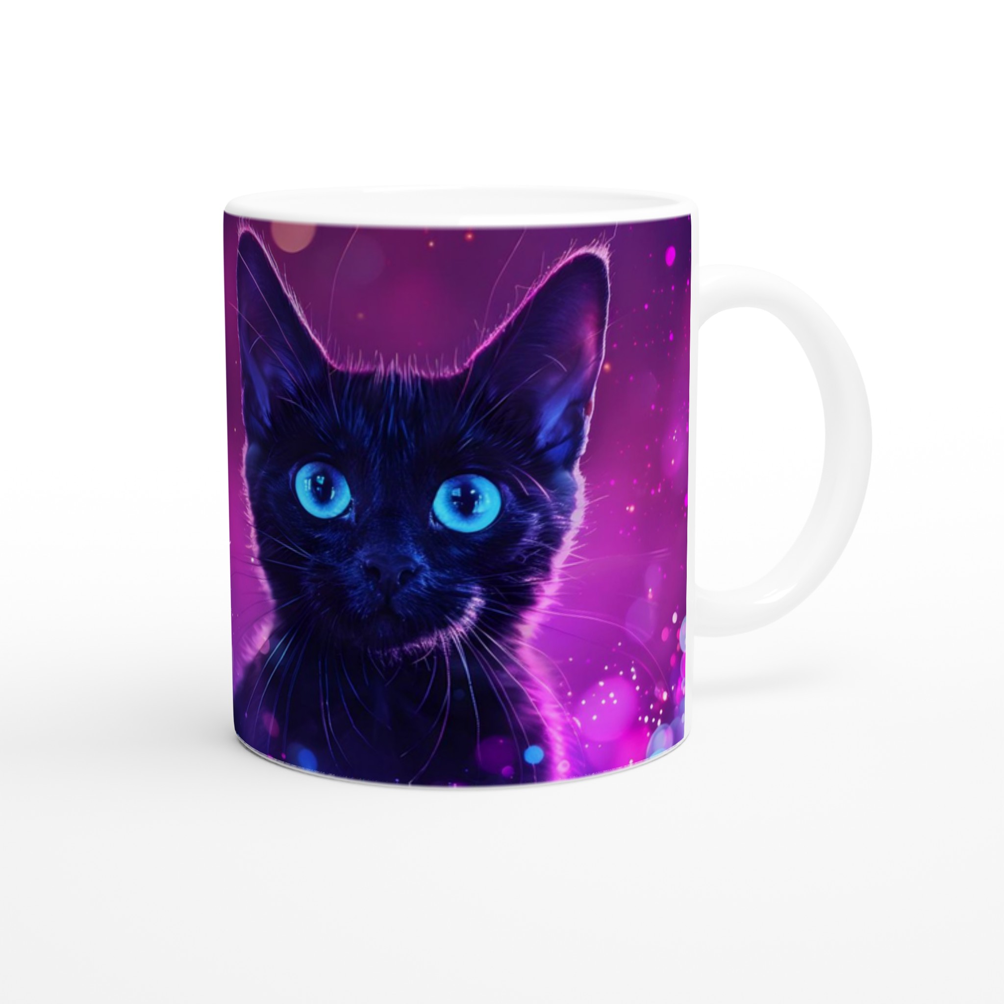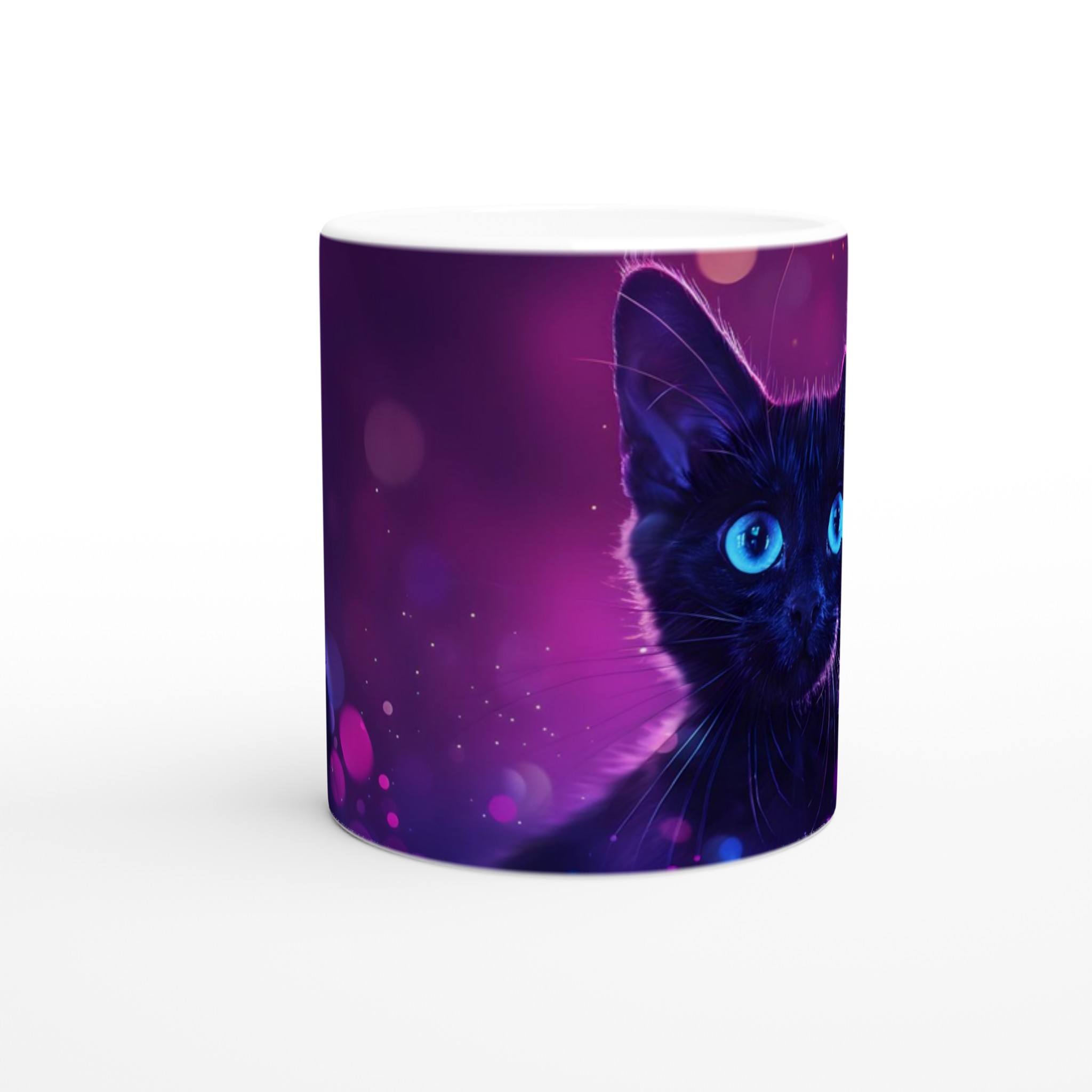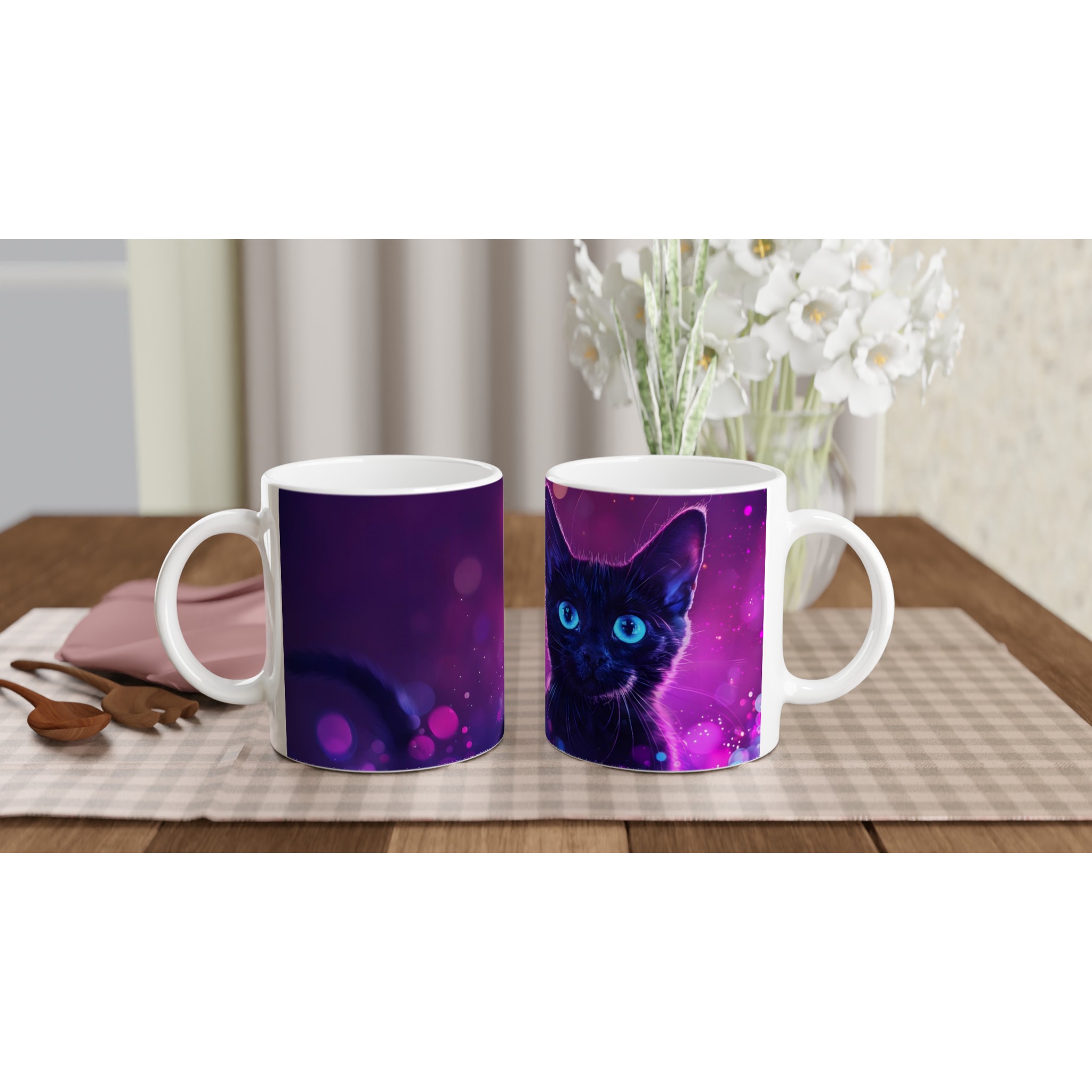 Låt dig förtrollas varje morgon med denna kosmisk katt keramikmugg! Med sina intensivt blå ögon och omgiven av ett magiskt ljus i nyanser av lila och rosa, är denna mugg mer än bara en kopp – den är en portal till en drömlik värld. Perfekt för alla dagens stunder – morgonkaffet, en värmande kopp te eller en härlig varm choklad. Den blanka vita ytan gör att trycken framträder klart och färgstarkt, vilket gör muggen till en riktig favorit i vardagen. Tack vare den höga kvaliteten behåller trycket sin lyster även efter många omgångar i både mikrovågsugn och diskmaskin.