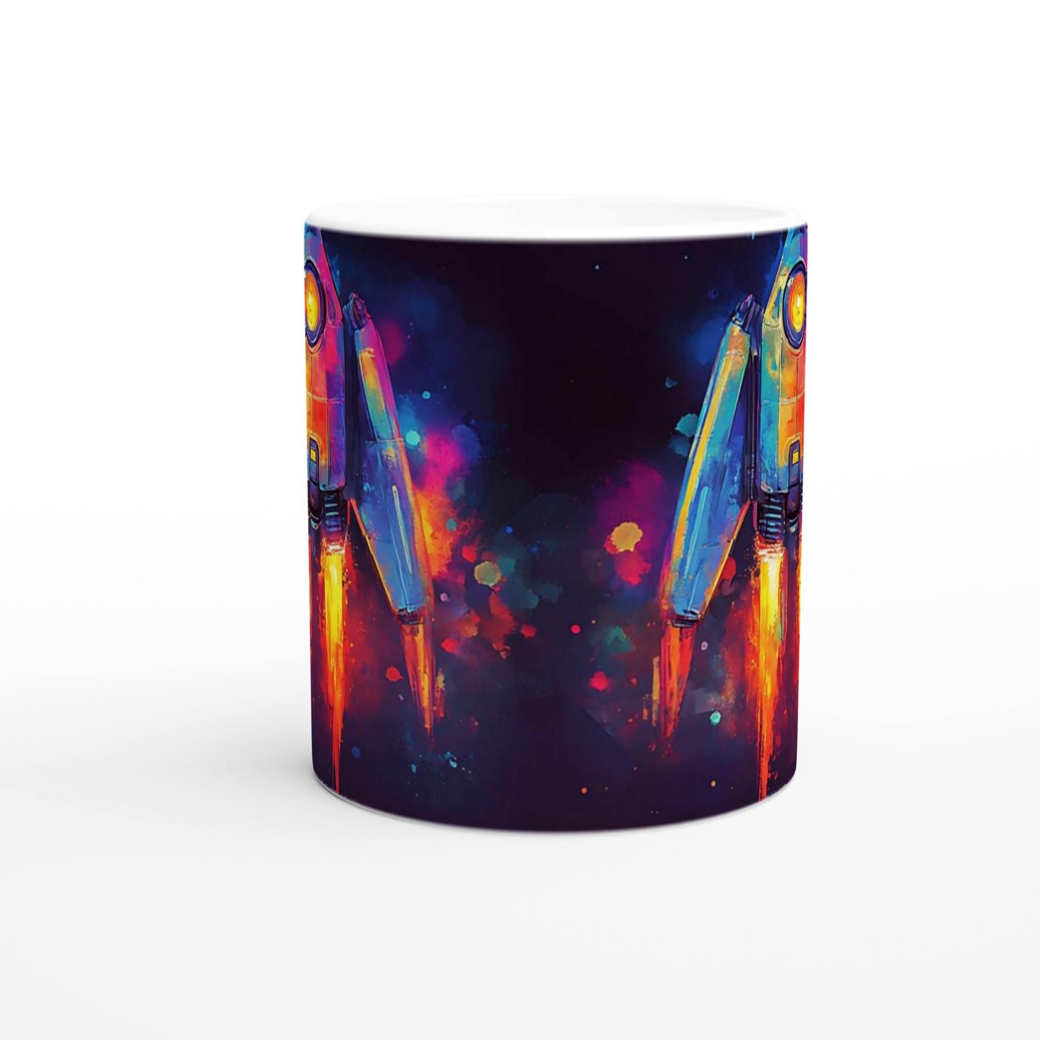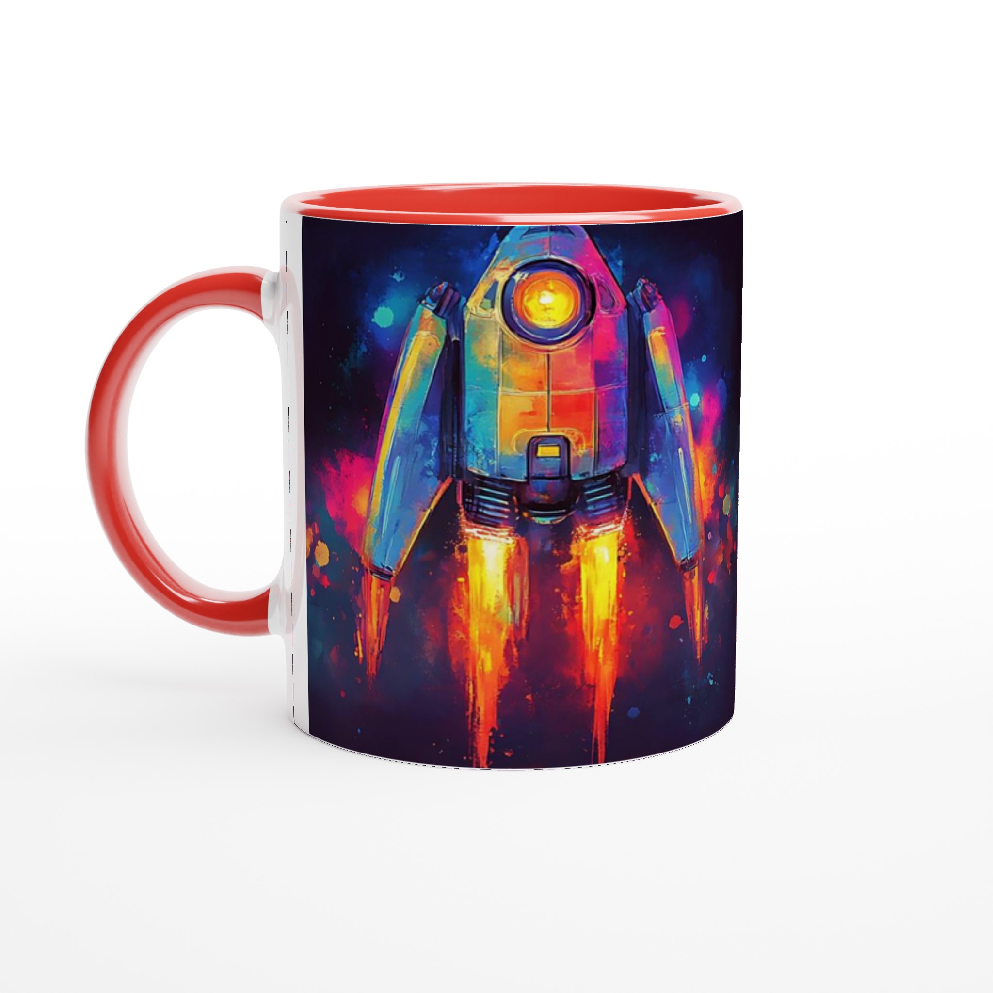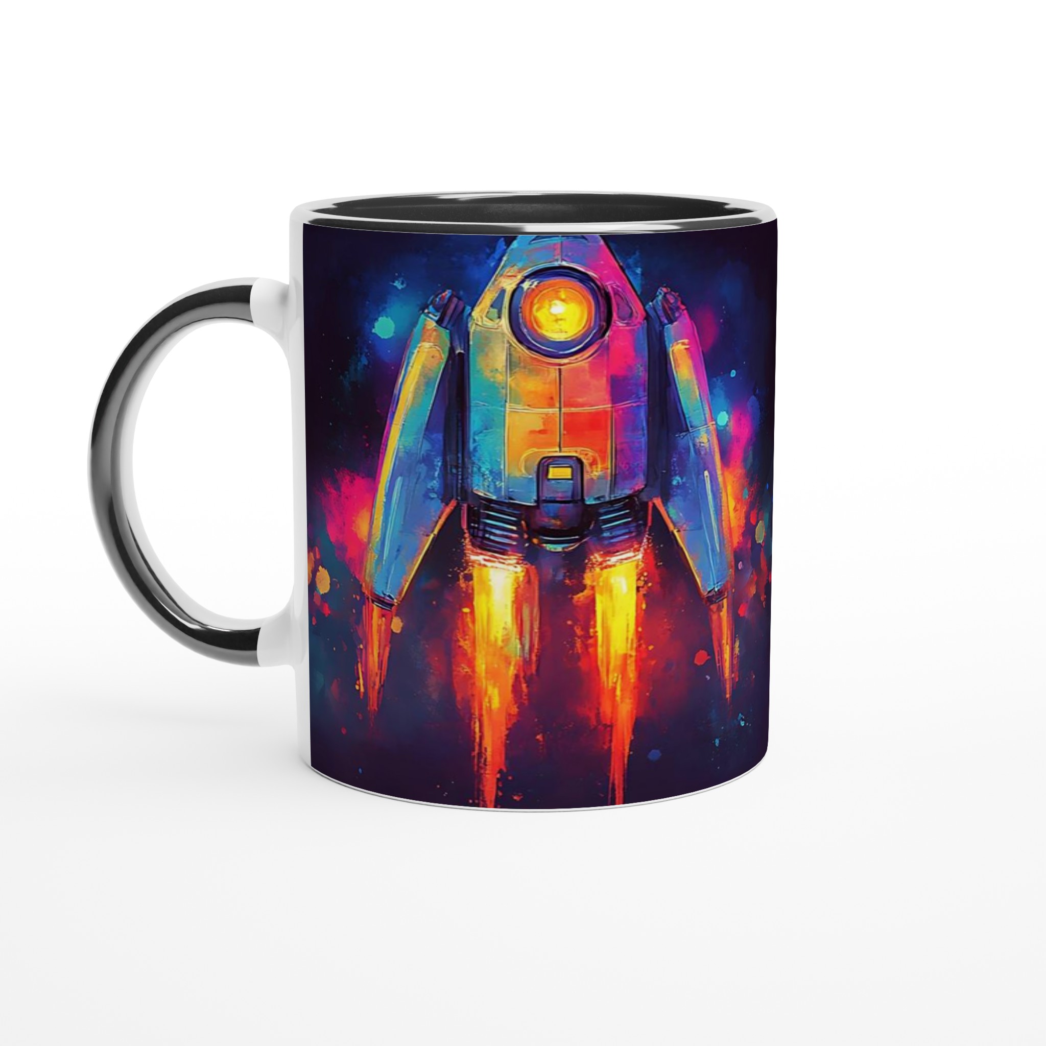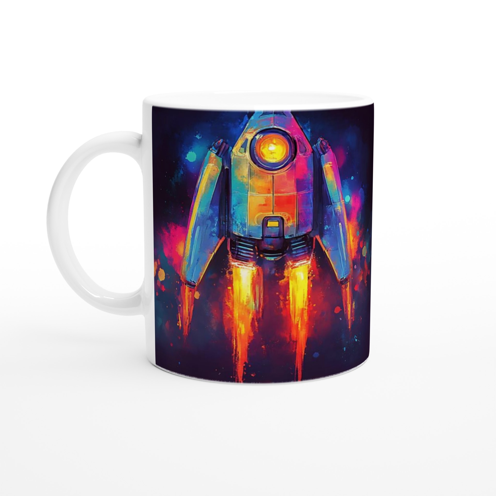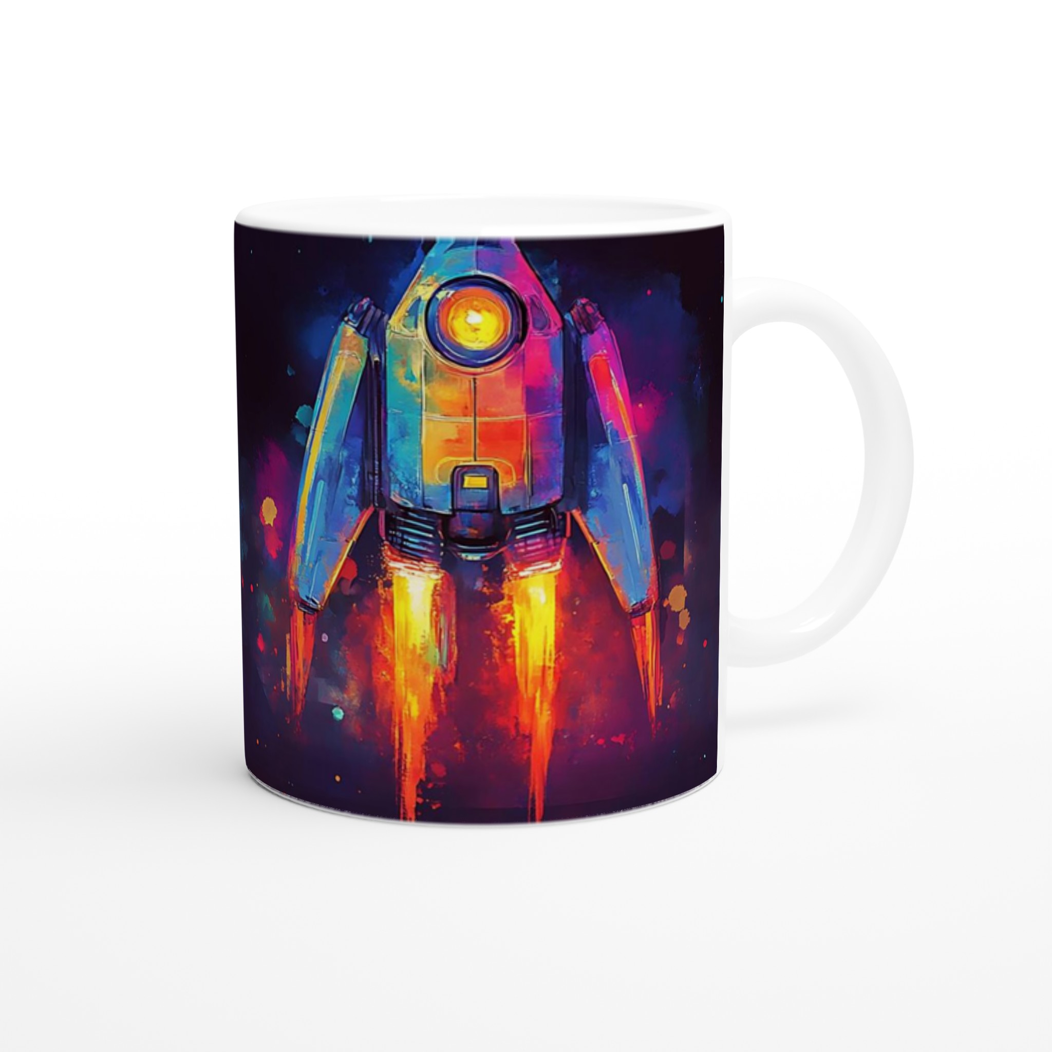 Inspirerad av universums oändliga under och en vibrerande akvarellestetik, fångar denna mugg blicken med sin dynamiska raketdesign som skjuter genom galaxen i en explosion av färg. Den blanka vita ytan ger ett skarpt och levande tryck som verkligen sticker ut, oavsett om det är en personlig design, ett roligt citat eller en present till någon du tycker om.