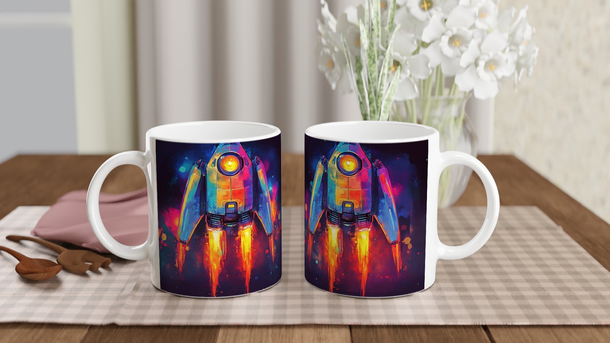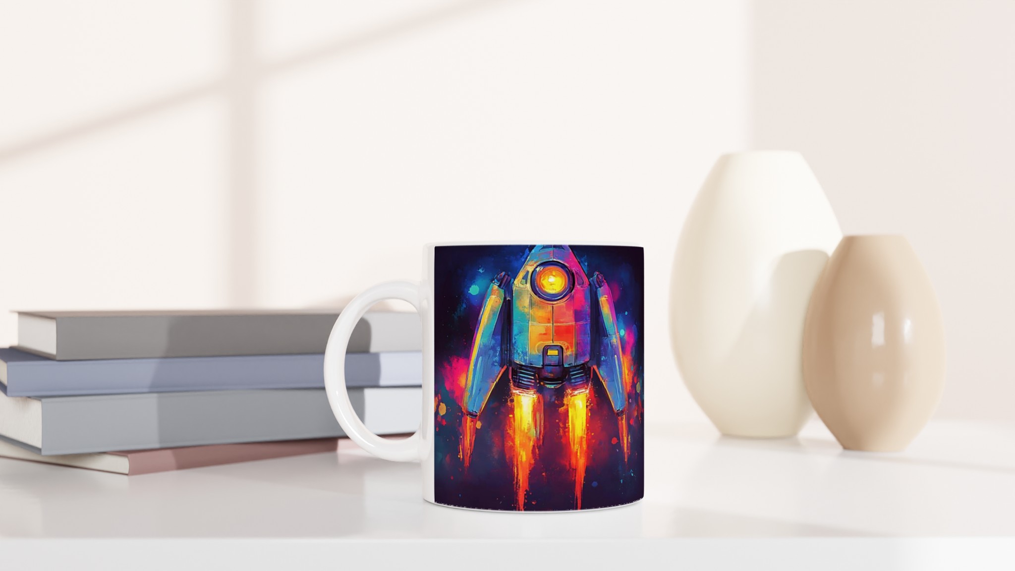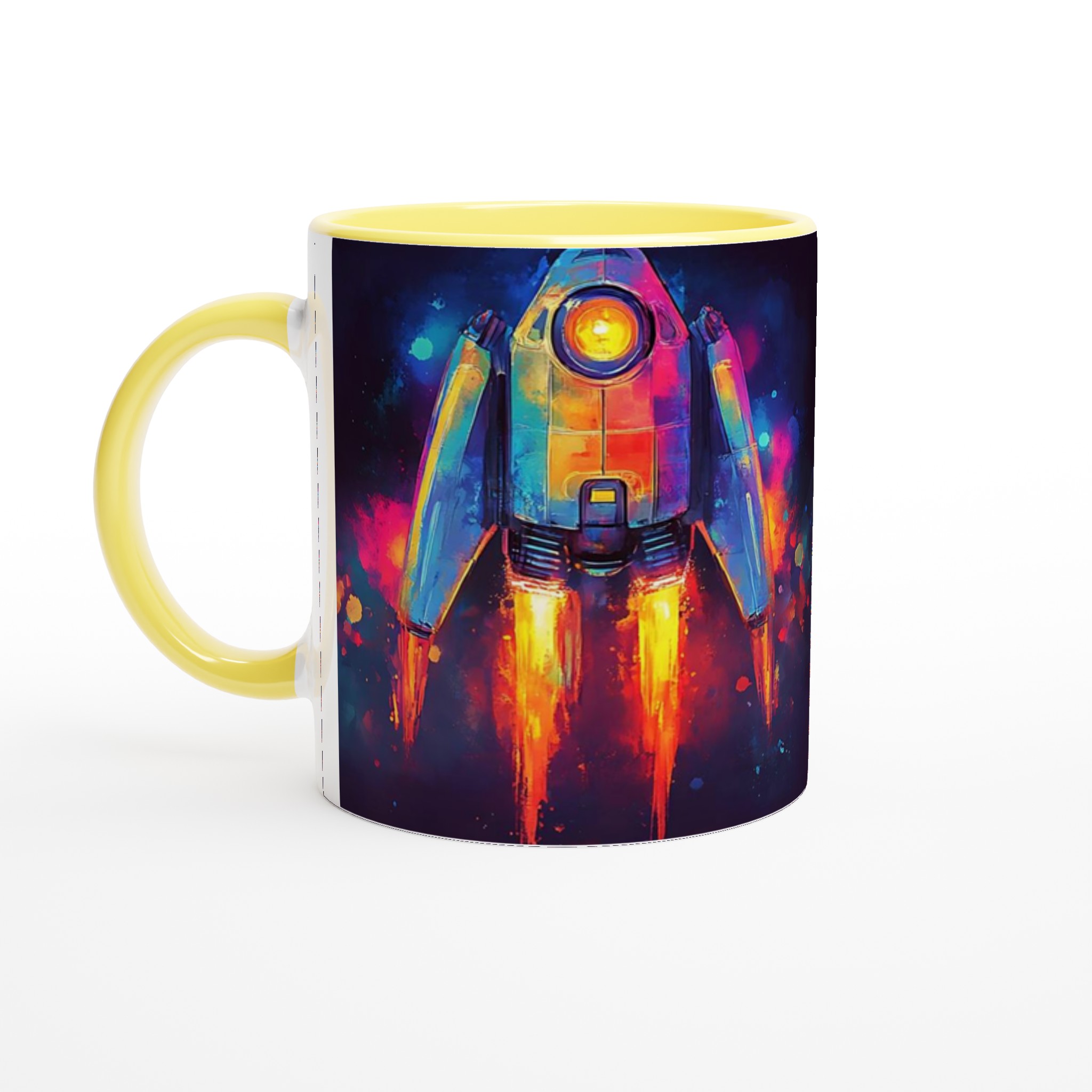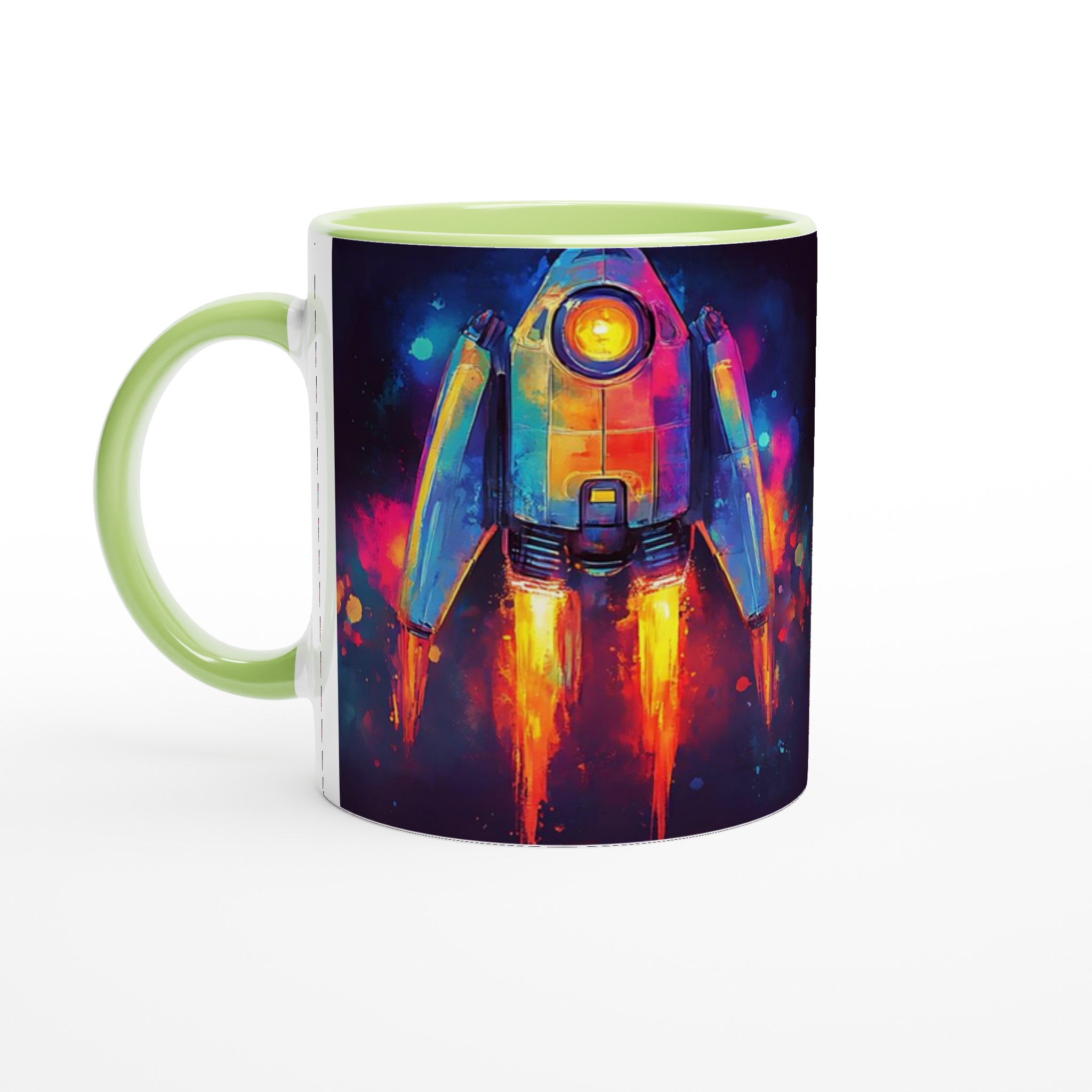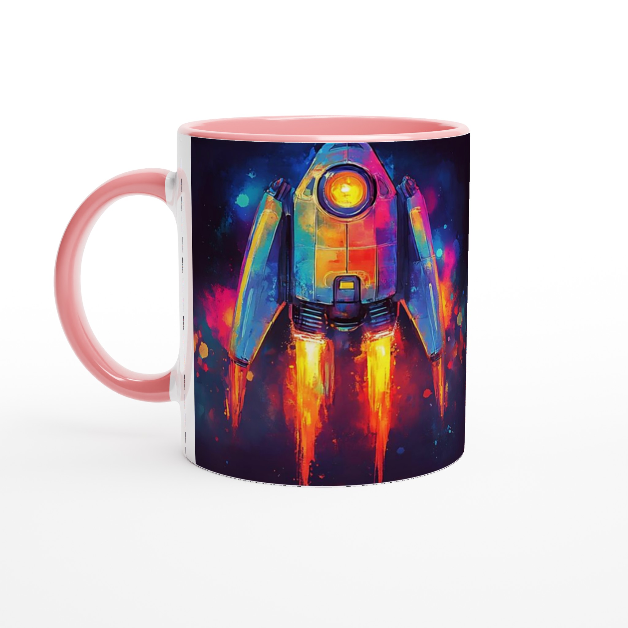 Inspirerad av universums oändliga under och en vibrerande akvarellestetik, fångar denna mugg blicken med sin dynamiska raketdesign som skjuter genom galaxen i en explosion av färg. Den blanka vita ytan ger ett skarpt och levande tryck som verkligen sticker ut, oavsett om det är en personlig design, ett roligt citat eller en present till någon du tycker om.