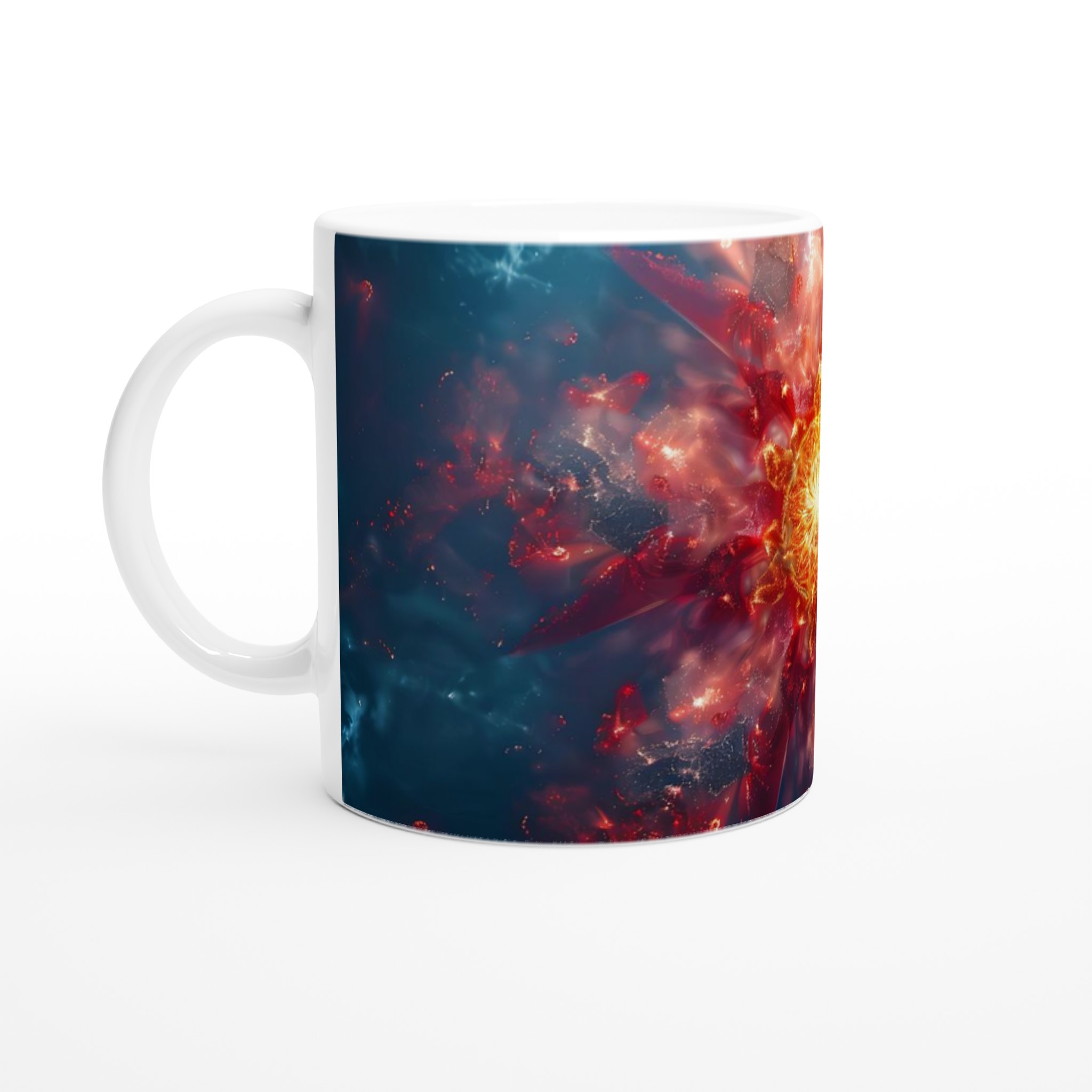 Väck dina sinnen varje morgon med vår ”Kosmisk Soluppgång” keramikmugg. Denna mugg fångar den eteriska skönheten hos en sol som flammar upp ur djupblå rymd, med varma, glödande nyanser av rött och guld mot en mystisk bakgrund. Det abstrakta konstverket skapar en känsla av oändlig energi och lugn, perfekt för att starta dagen med inspiration eller för att koppla av under kvällen.