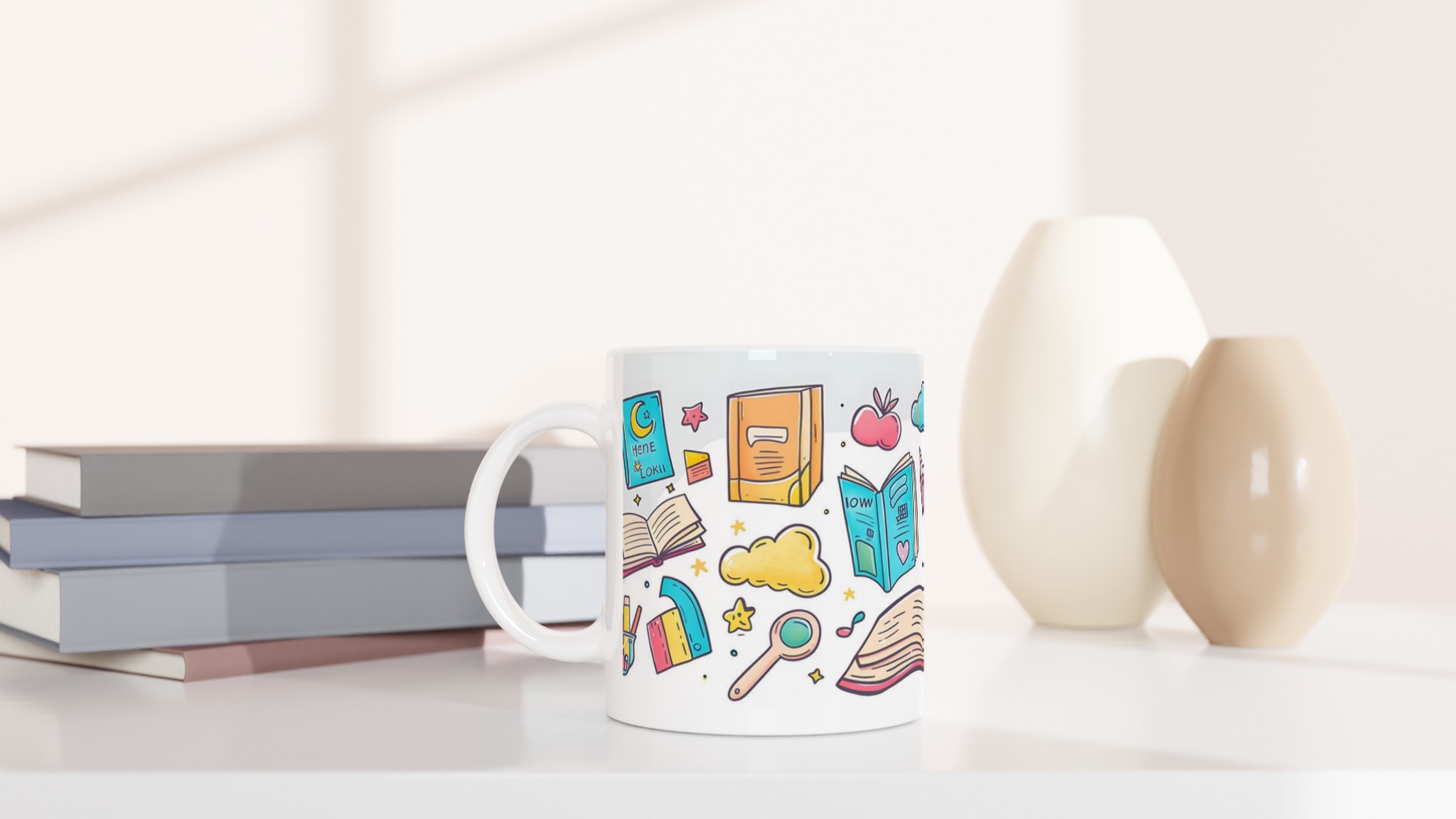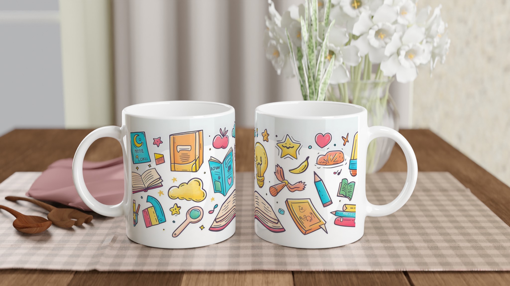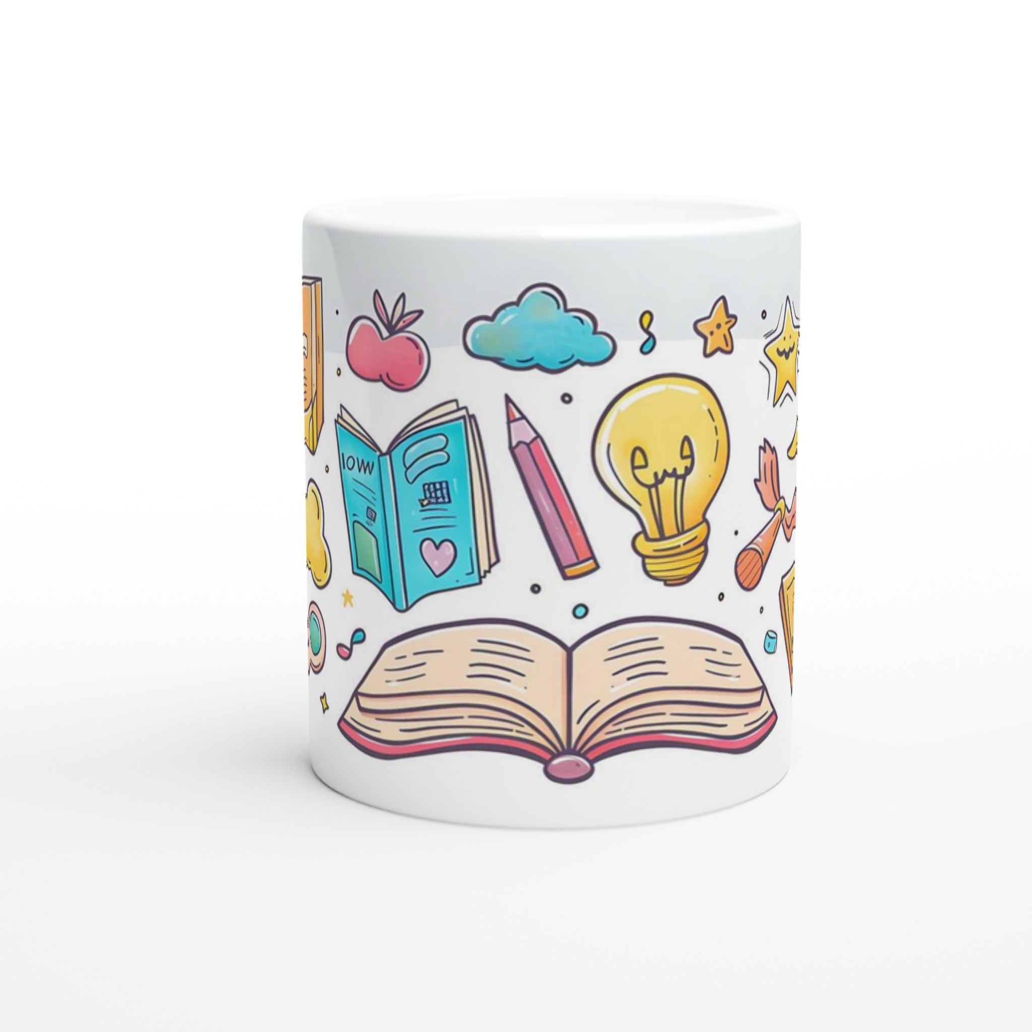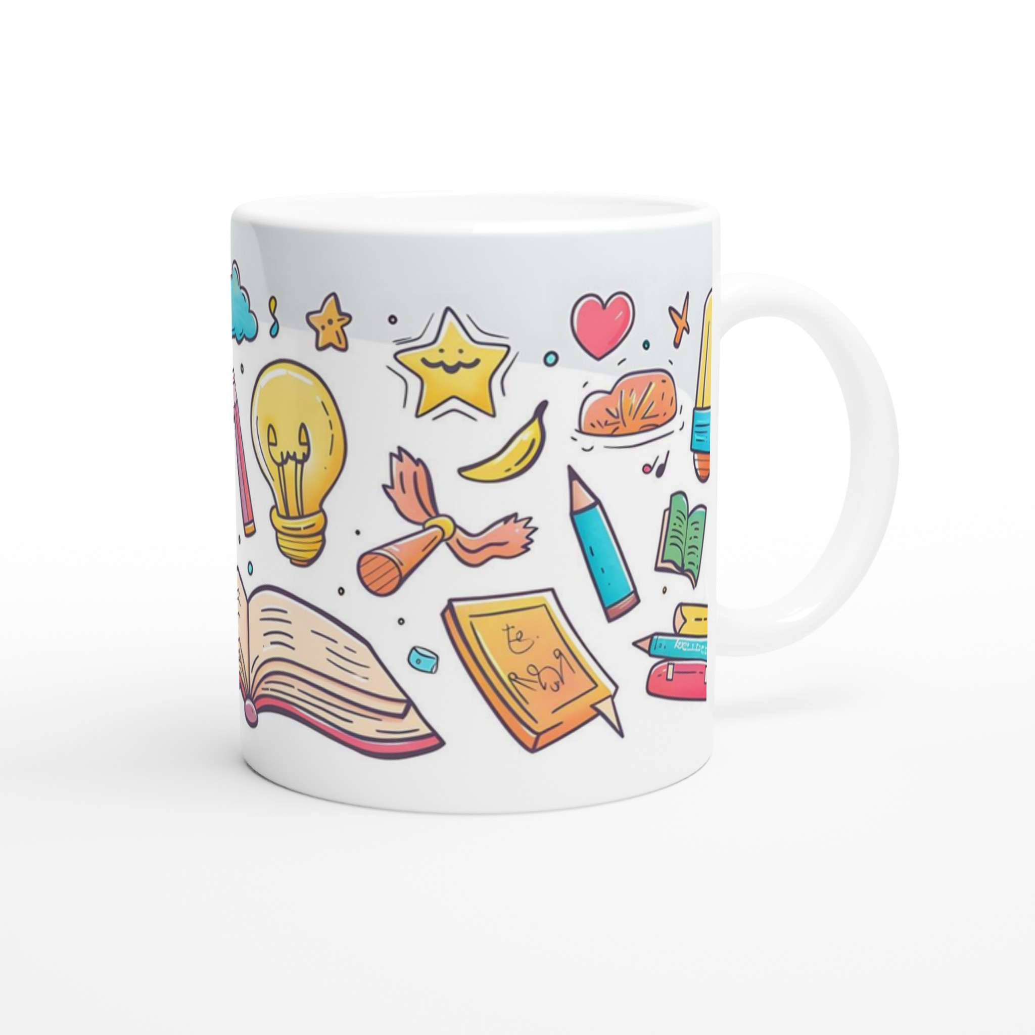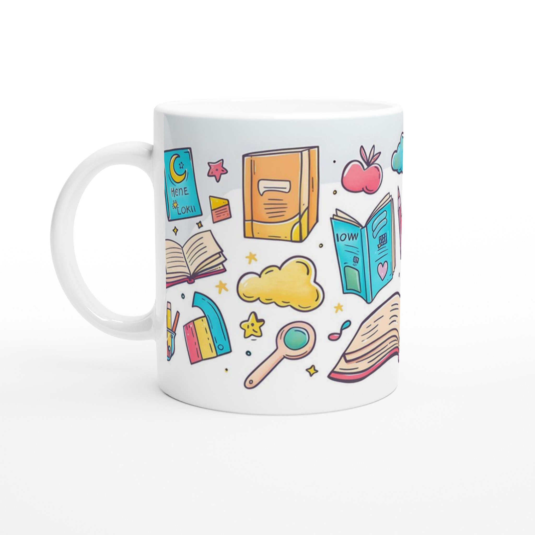 Väck din inre konstnär och drömmare med denna charmiga keramiska mugg, prydd med en lekfull illustration av böcker, pennor och stjärnor som lyfter fram fantasins kraft. Denna stilrena mugg blir snabbt en vardagsfavorit, perfekt för morgonkaffet, kvällens varma choklad eller när du bara vill njuta av en kopp te medan du förlorar dig i en god bok. Den blanka ytan gör att trycken framhävs med klara och levande färger, som håller sig fina även efter många turer i mikron och diskmaskinen.