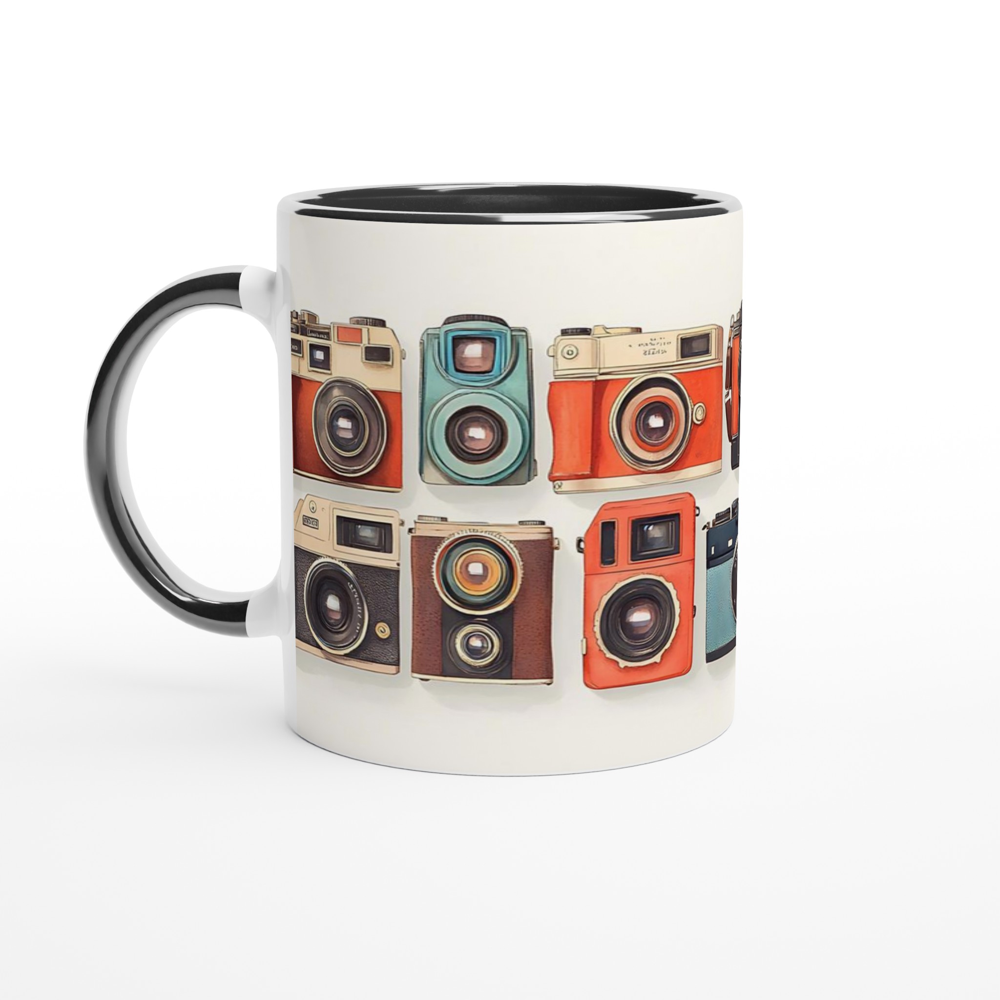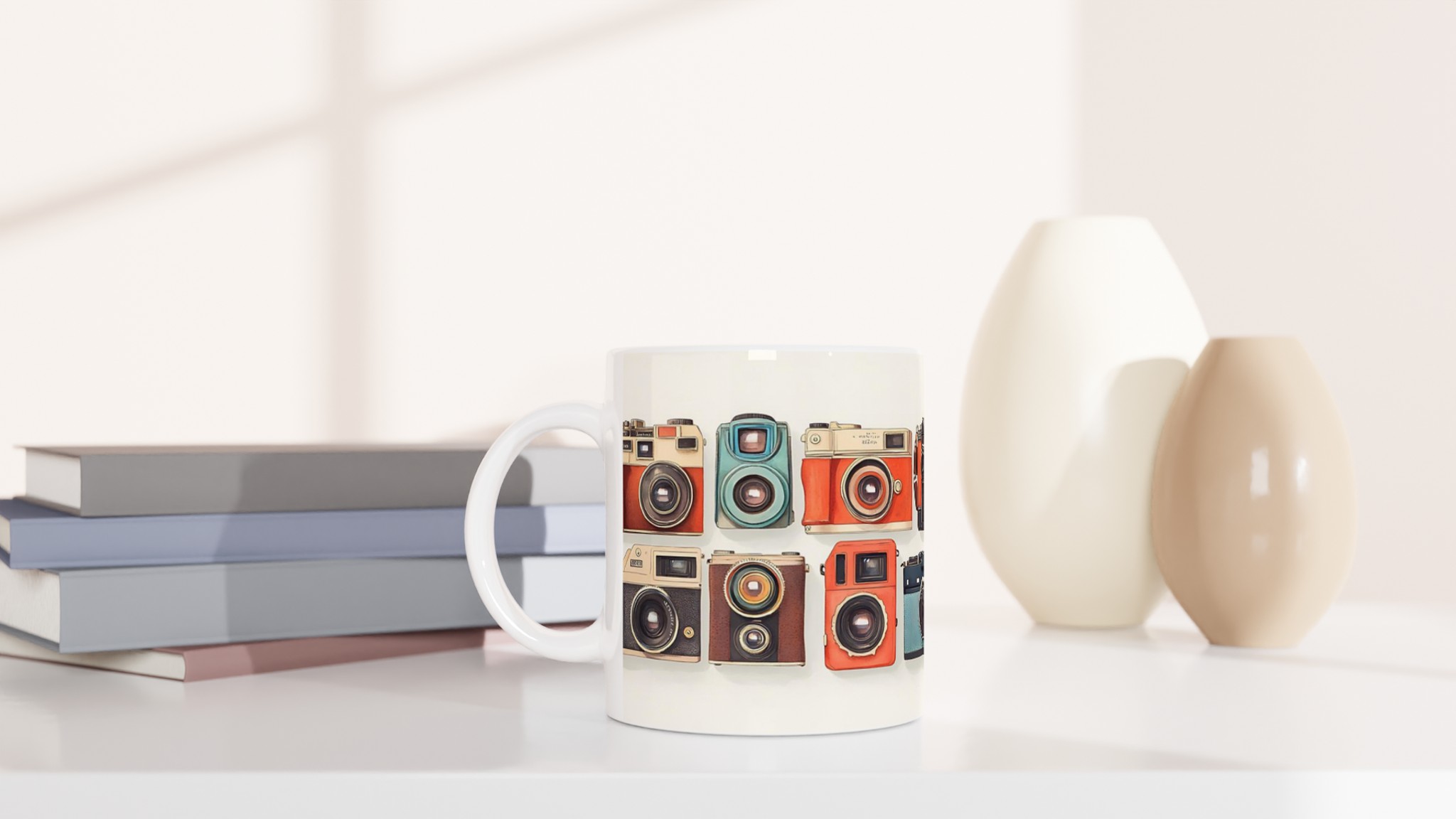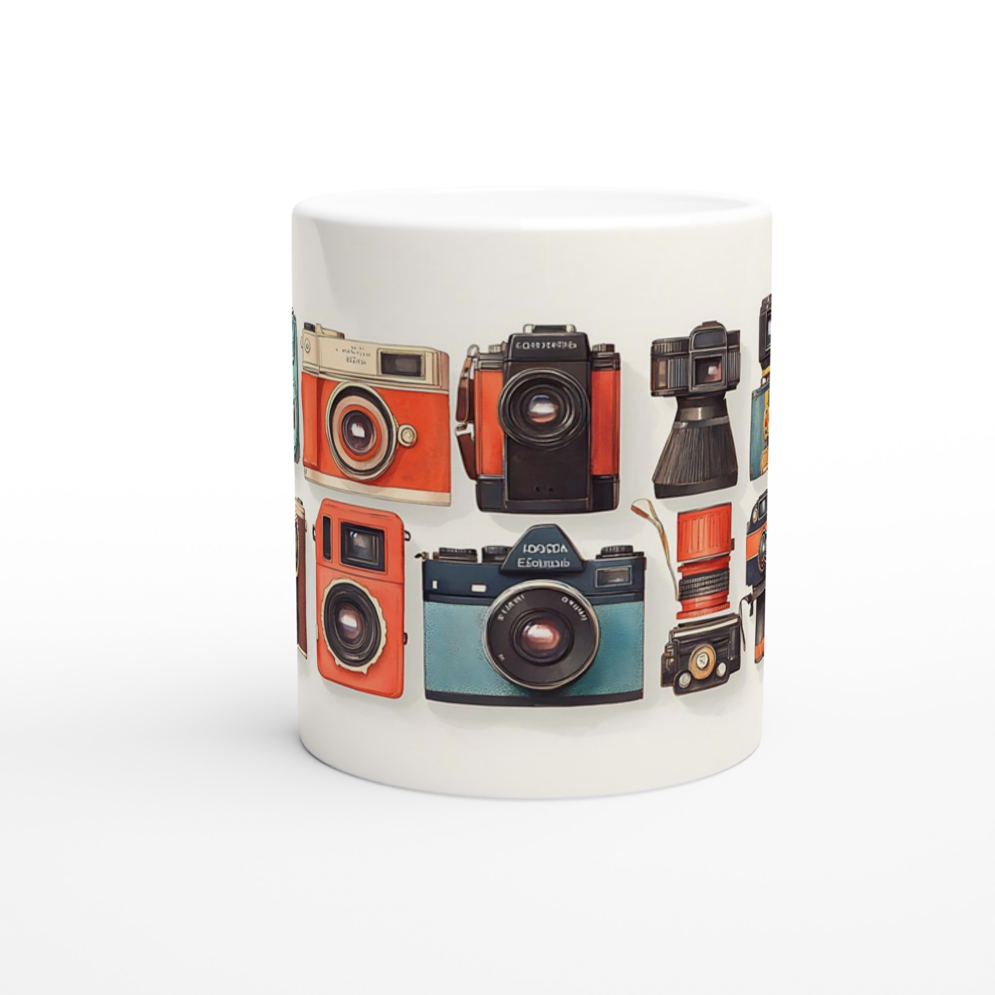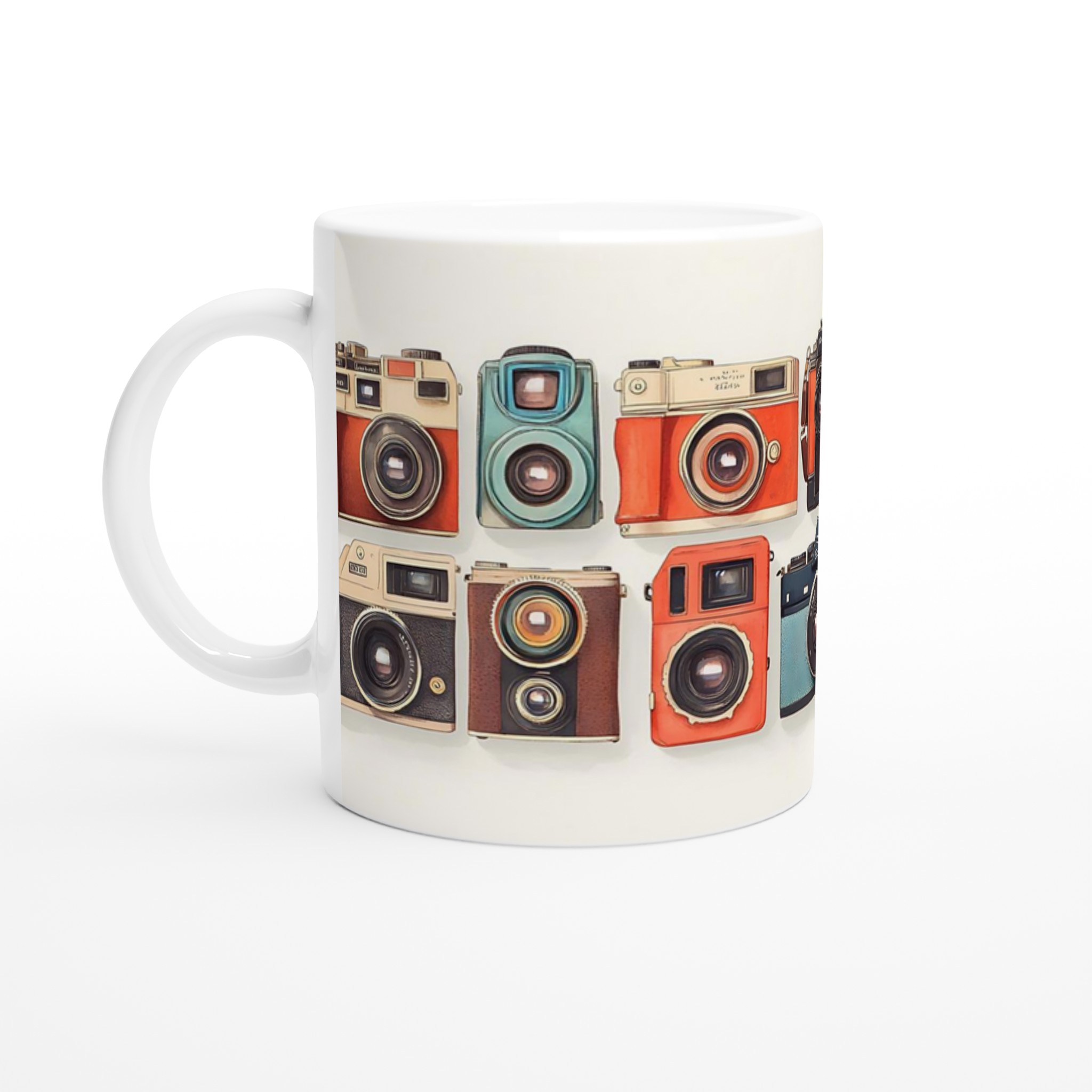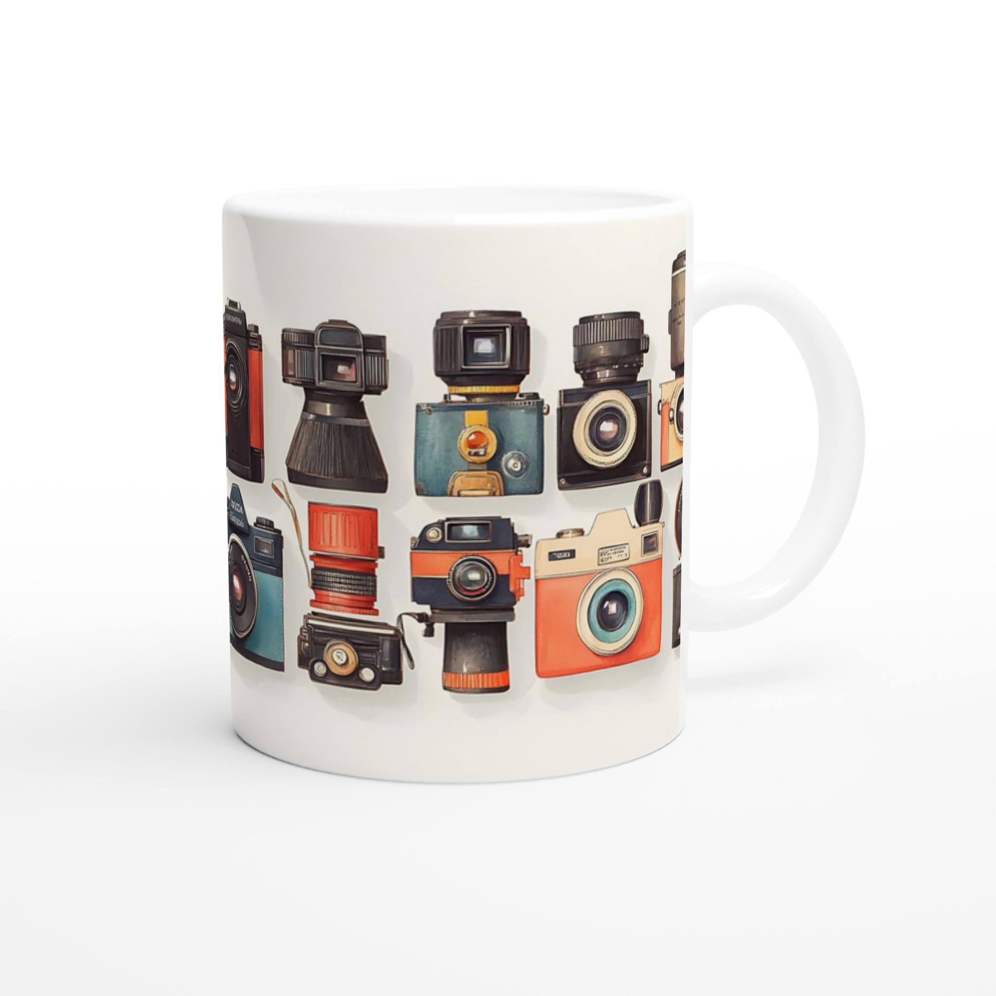 Den här stilrena keramiska muggen blir snabbt en vardagsfavorit. Perfekt för morgonkaffet, kvällens varma choklad eller när du bara vill njuta av en kopp te. Med sitt charmiga retrokamera-motiv, i en palett av livfulla färger, är denna mugg mer än bara en kopp – den är en hyllning till den tidlösa konsten att fånga ögonblick. Den blanka vita ytan gör att trycken framhävs med klara och levande färger, som håller sig fina även efter många turer i mikron och diskmaskinen.