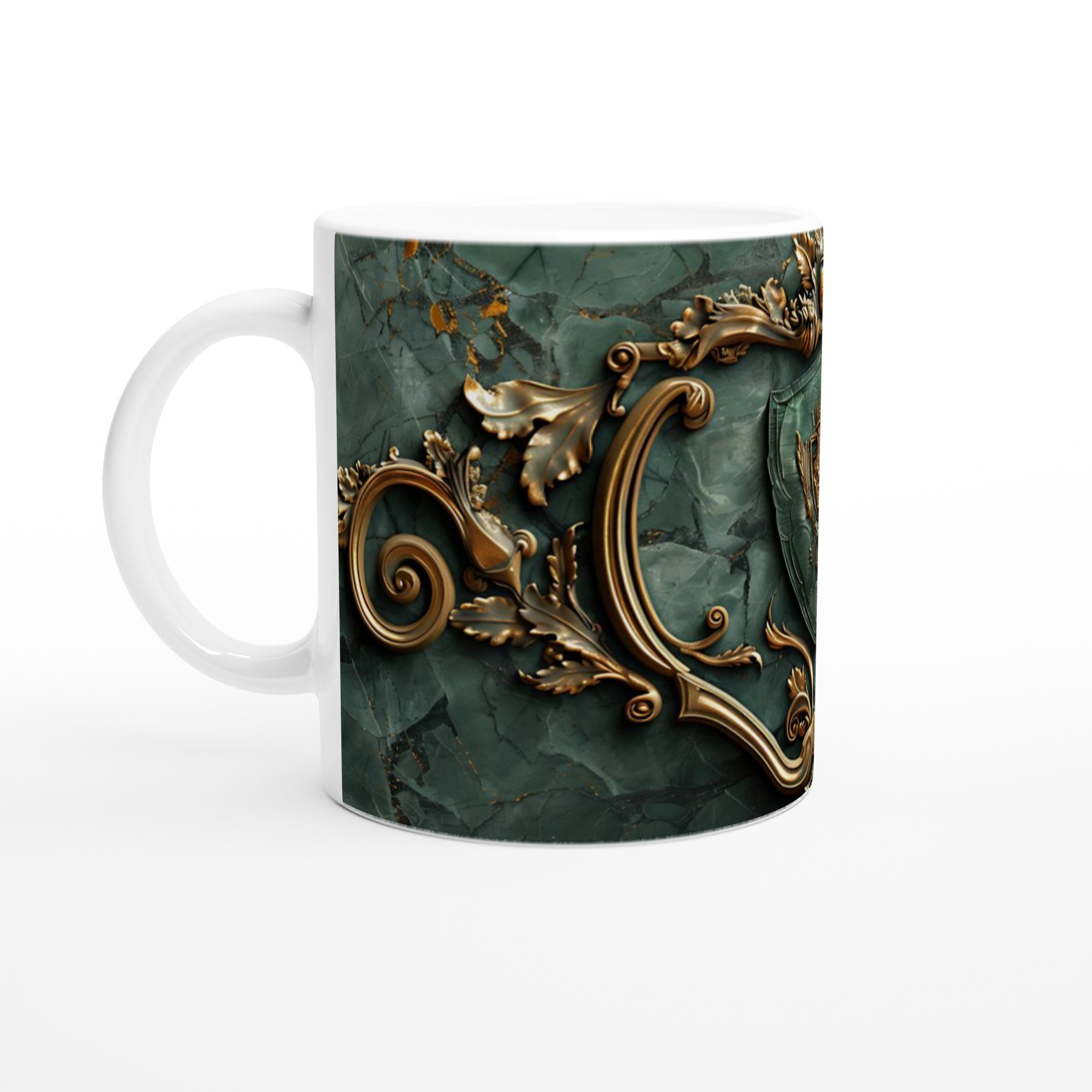 Kunglig Emblem Keramisk Mugg – 11oz Lyxig Kaffemugg med Gyllene Detaljer & Grön Marmorlook