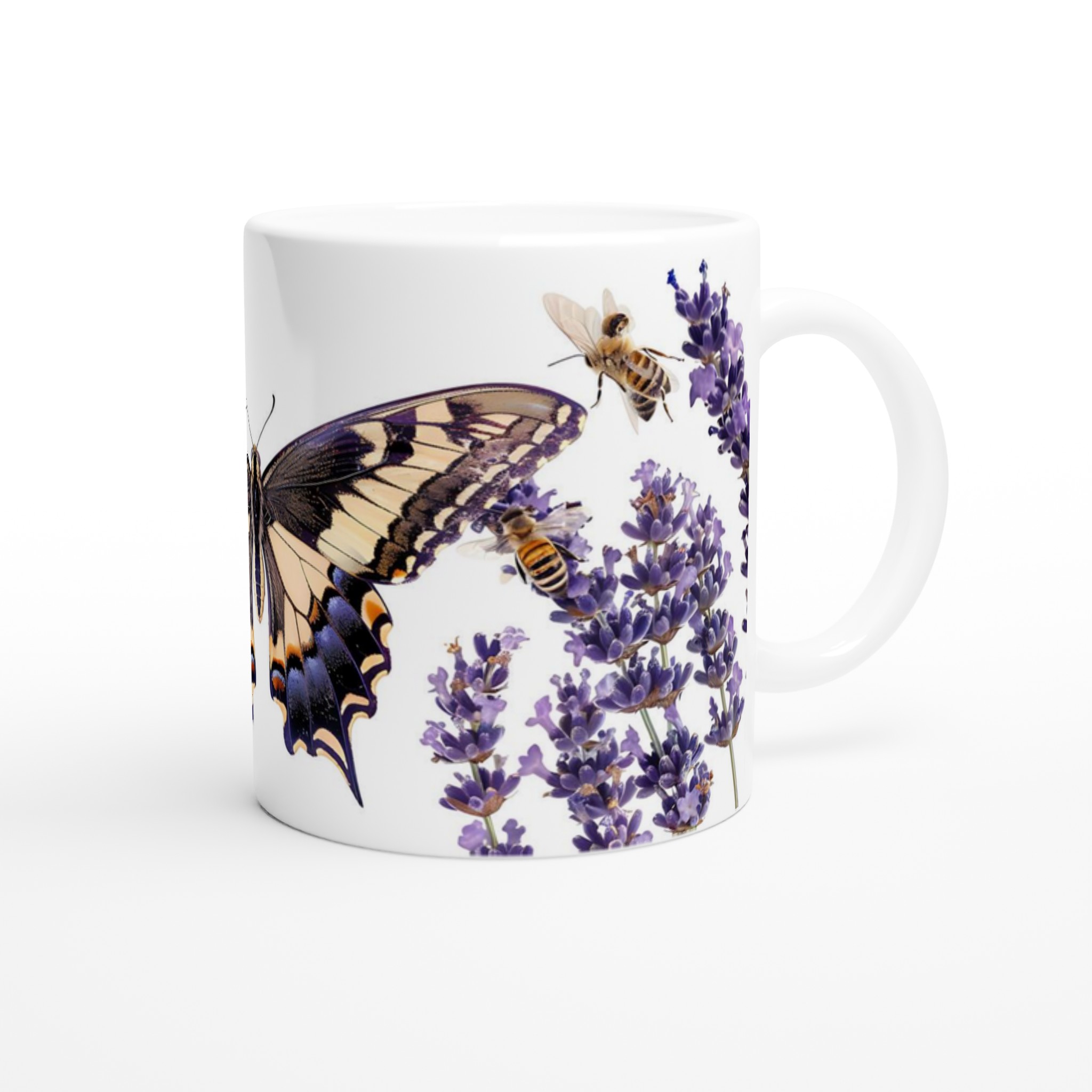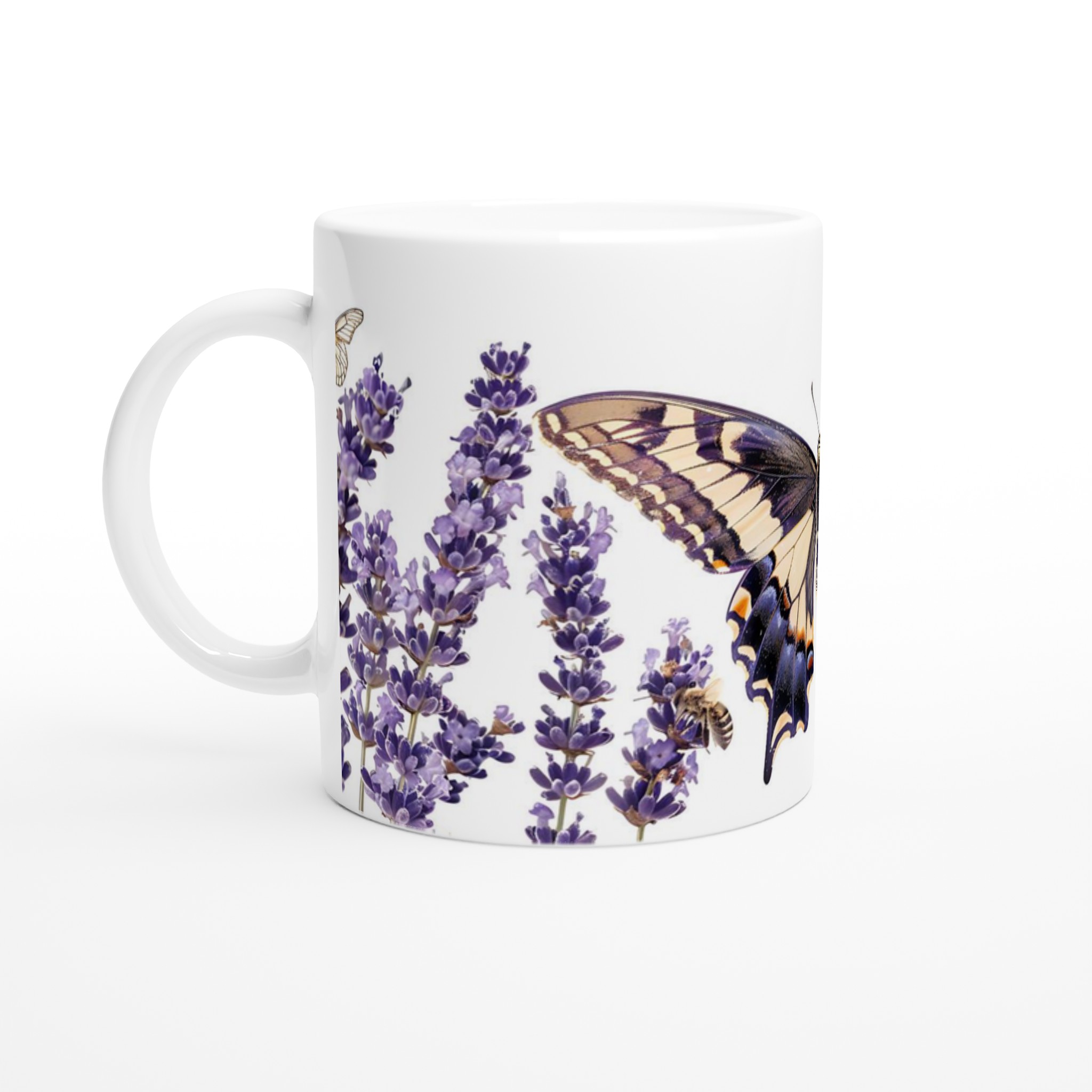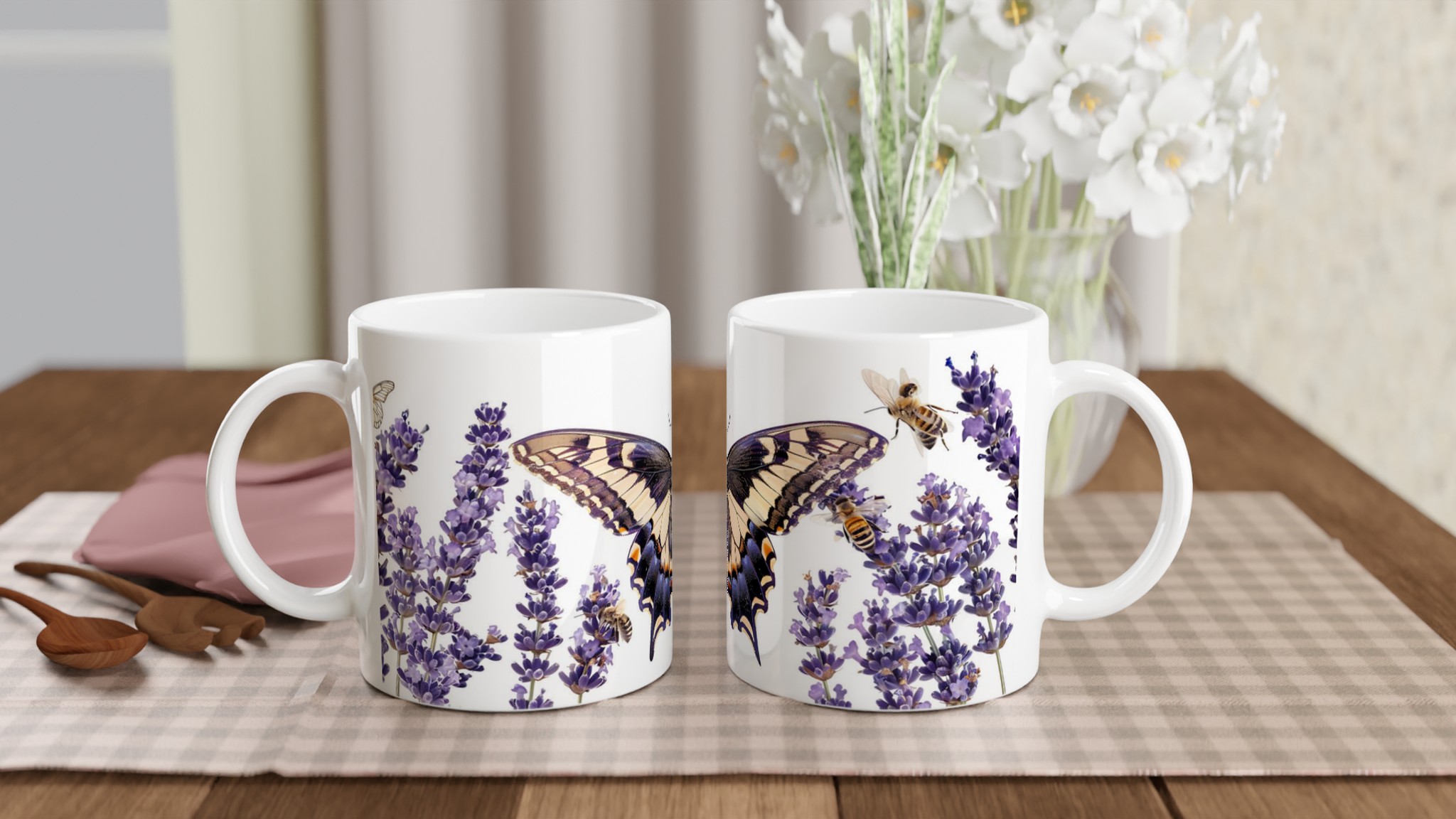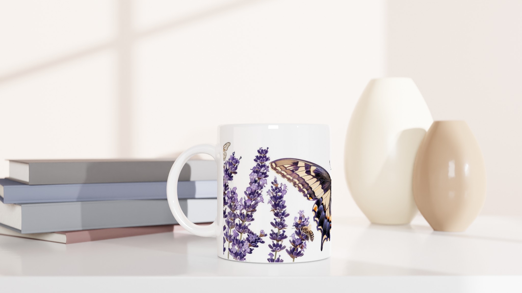 Fånga den lugna skönheten av en sommaräng med vår keramiska mugg med lavendelblommor och fjärilar. Den här stilrena muggen blir snabbt en vardagsfavorit, perfekt för morgonkaffet, kvällens varma choklad eller när du bara vill njuta av en kopp te. Den blanka ytan gör att trycken framhävs med klara och levande färger, som håller sig fina även efter många turer i mikron och diskmaskinen.