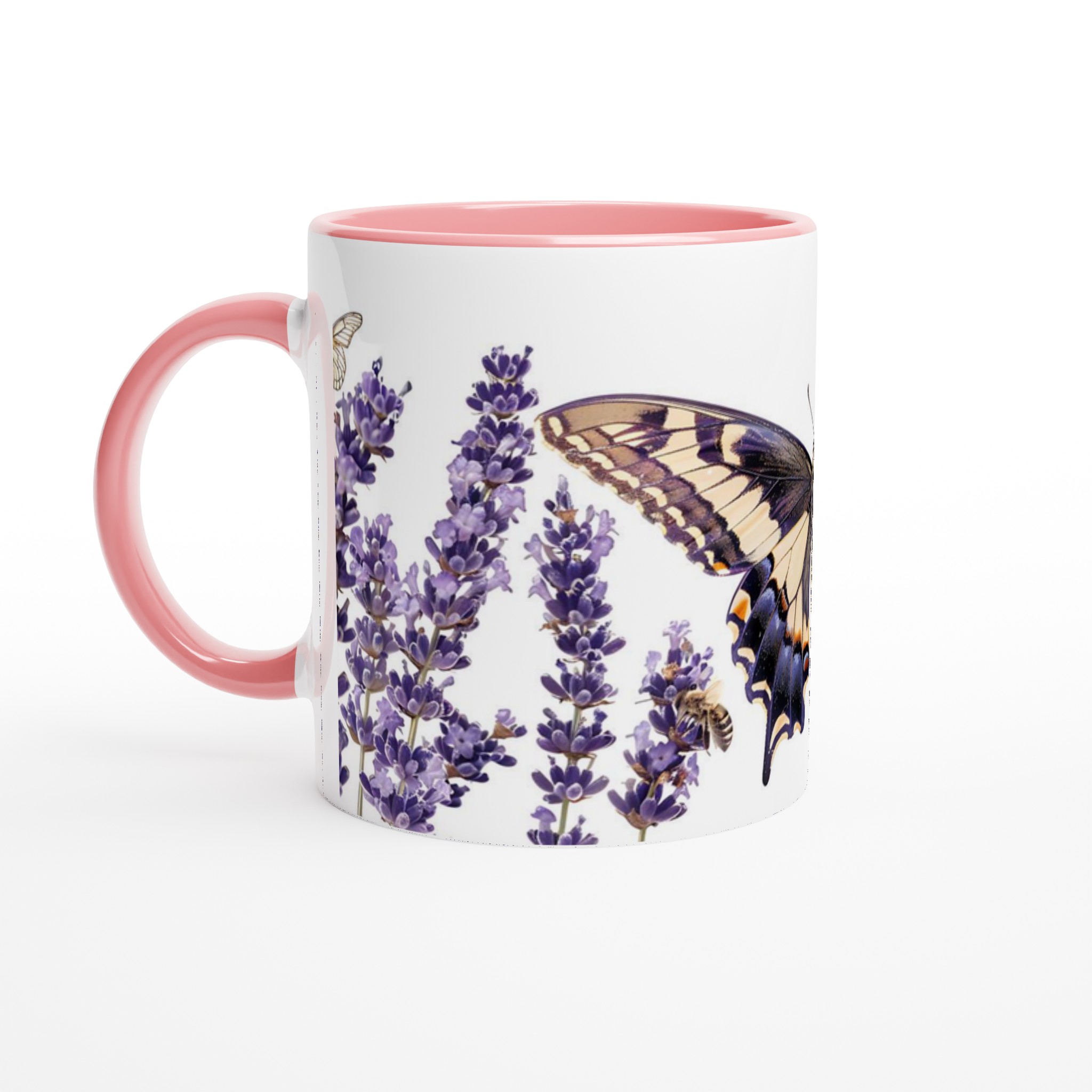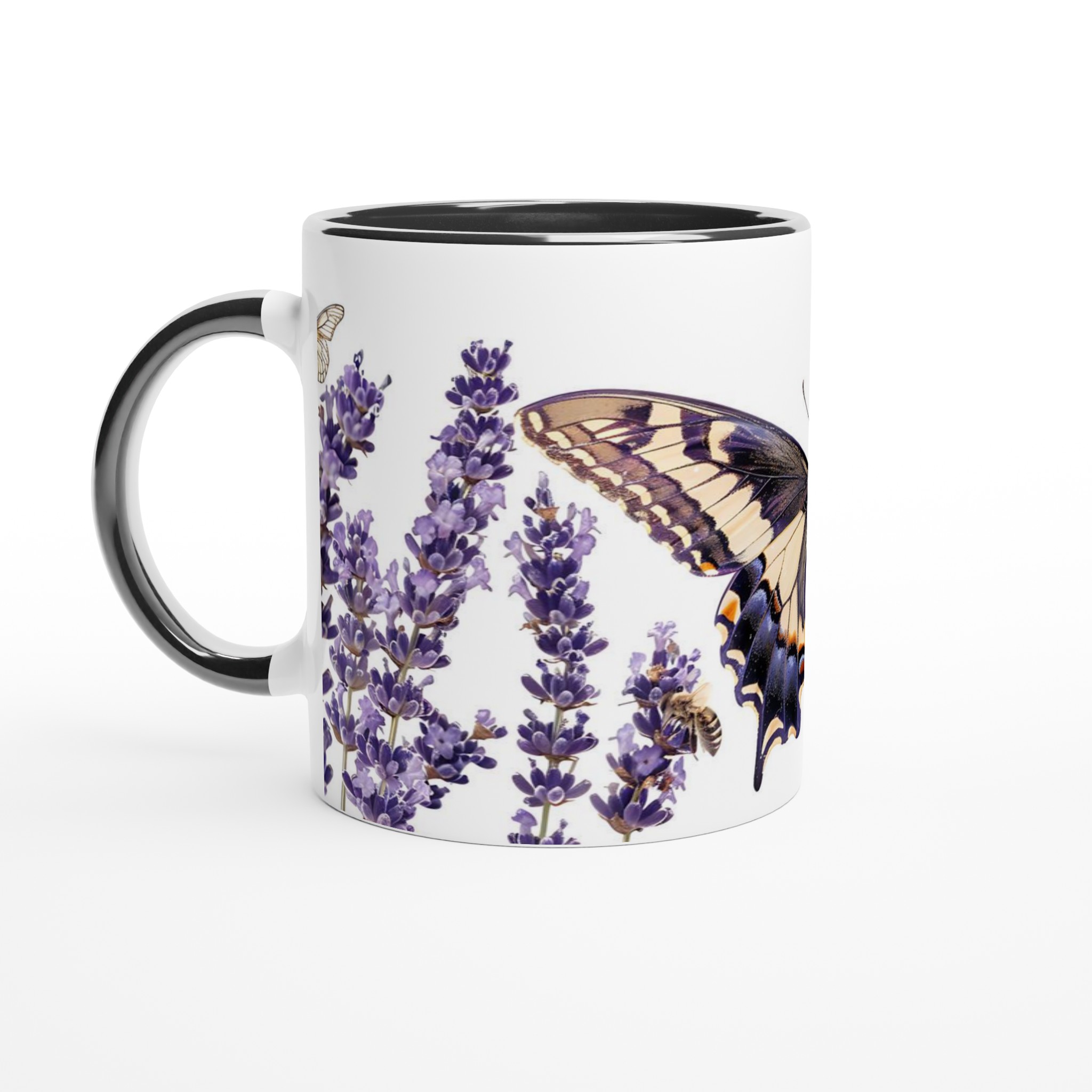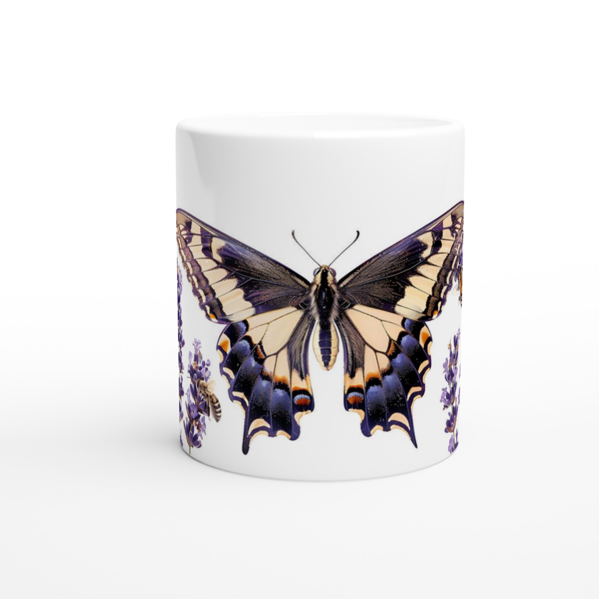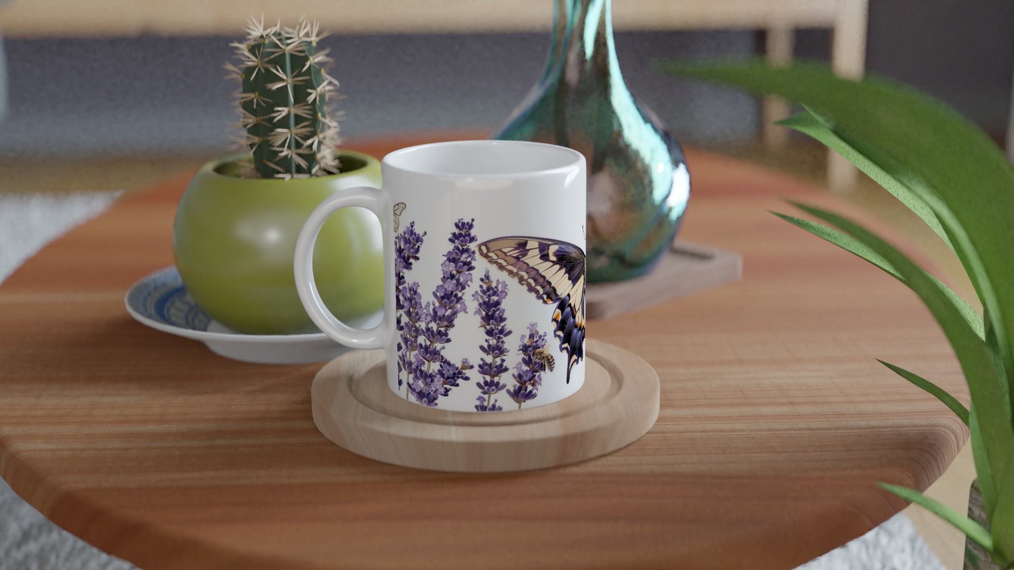 Fånga den lugna skönheten av en sommaräng med vår keramiska mugg med lavendelblommor och fjärilar. Den här stilrena muggen blir snabbt en vardagsfavorit, perfekt för morgonkaffet, kvällens varma choklad eller när du bara vill njuta av en kopp te. Den blanka ytan gör att trycken framhävs med klara och levande färger, som håller sig fina även efter många turer i mikron och diskmaskinen.