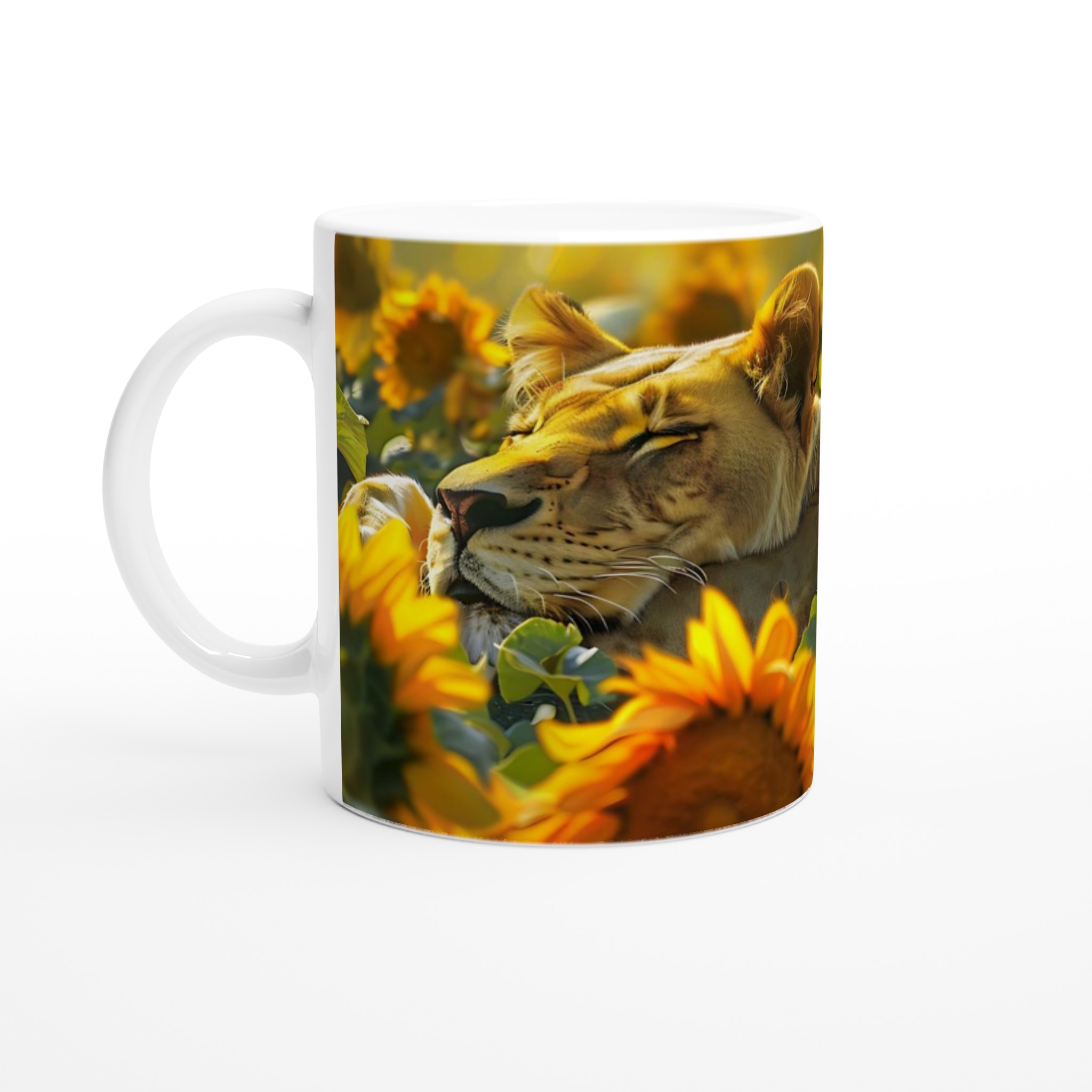 Inspirerad av den fridfulla skönheten hos en majestätisk lejoninna som vilar i ett gyllene solrosfält, förvandlar denna mugg dina dagliga dryckesritualer till en lugnande flykt. Den blanka vita ytan ger ett skarpt och levande tryck som verkligen sticker ut, oavsett om det är en personlig design, ett roligt citat eller en present till någon du tycker om.