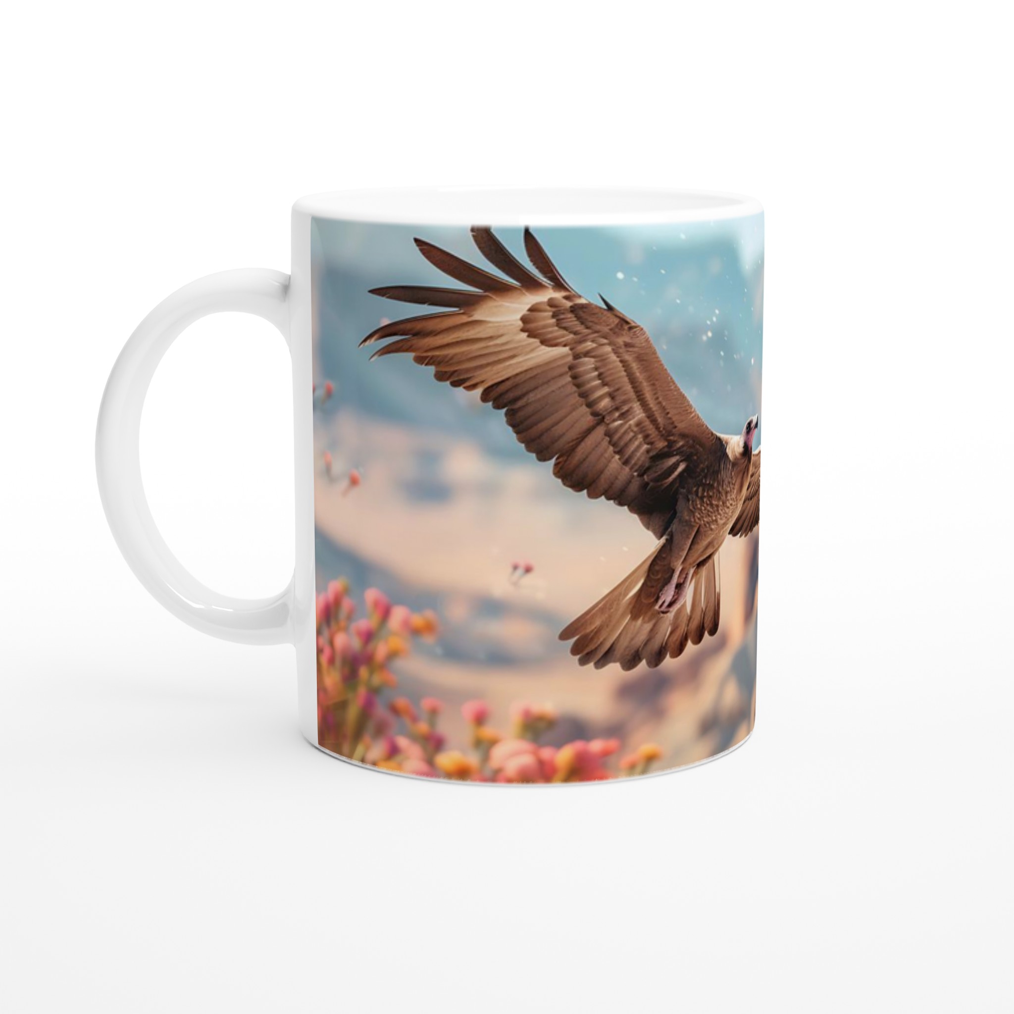 Inspirerad av den majestätiska fågeln som svävar bland blommande skönhet, erbjuder denna mugg en touch av naturens lugn och livfulla färger till din vardag. Den blanka ytan ger ett skarpt och levande tryck som verkligen sticker ut, oavsett om det är en personlig design, ett roligt citat eller en present till någon du tycker om.