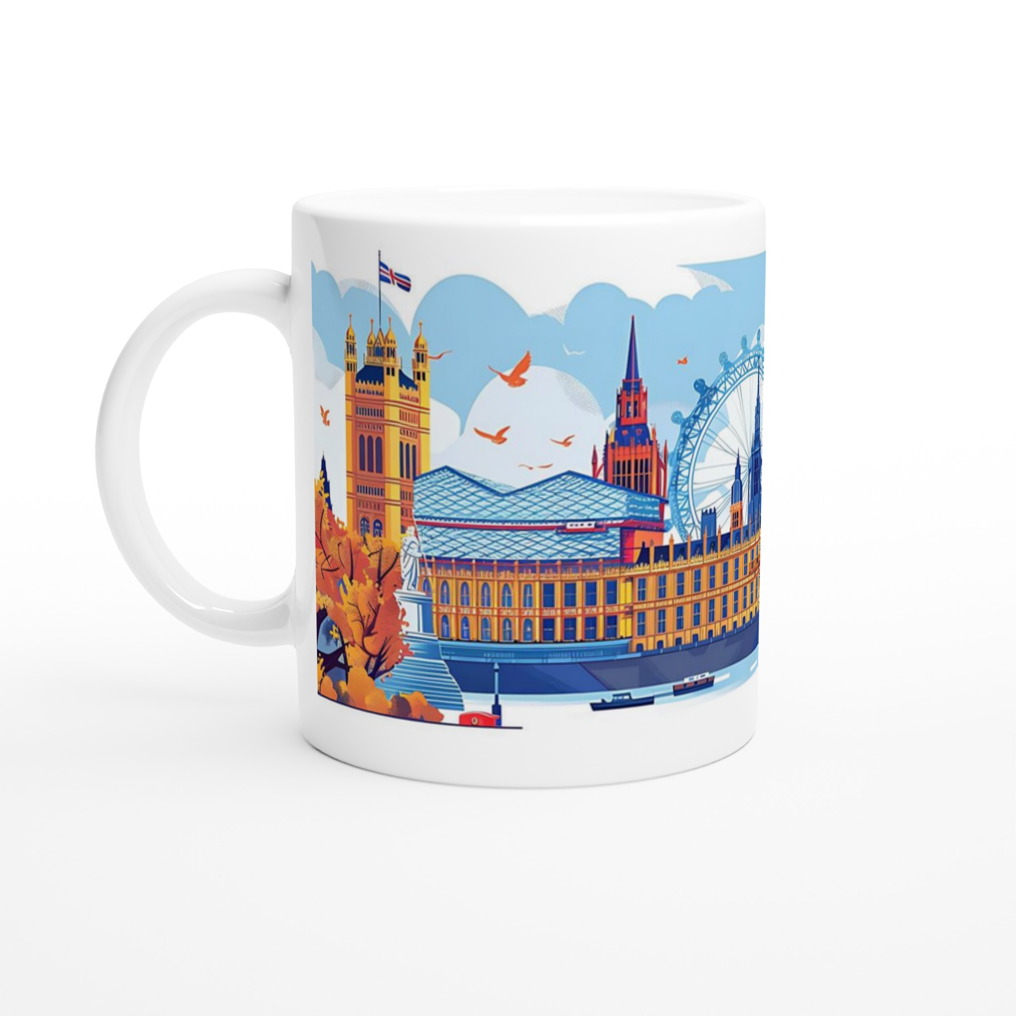 Res till hjärtat av London varje gång du tar en klunk med vår premium keramikmugg, prydd med en livlig höstvy av stadens ikoniska landmärken.