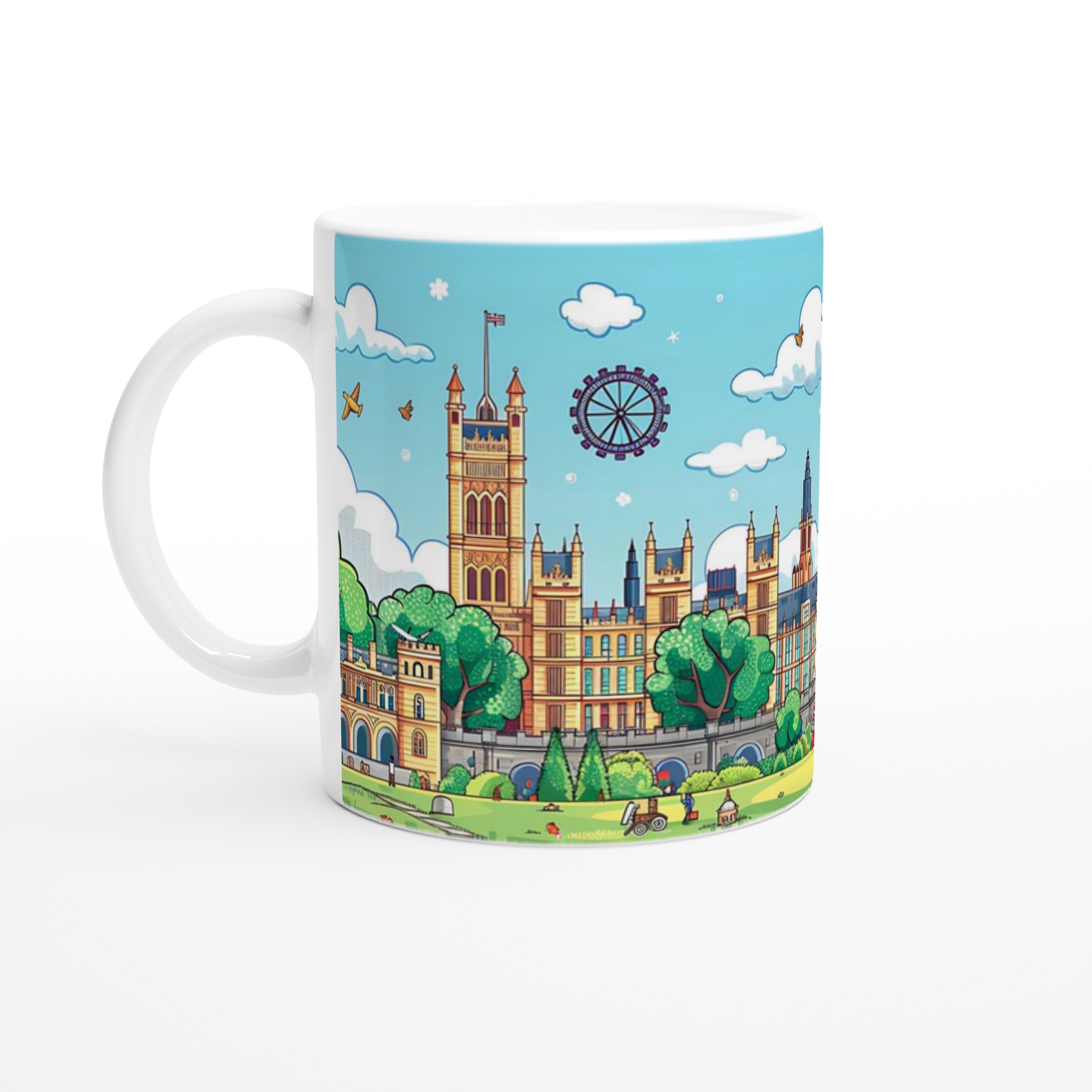 London Cartoon Cityscape Mugg – En Färgsprakande och Lekfull Keramikmugg i ditt Val av Sju Nyanser