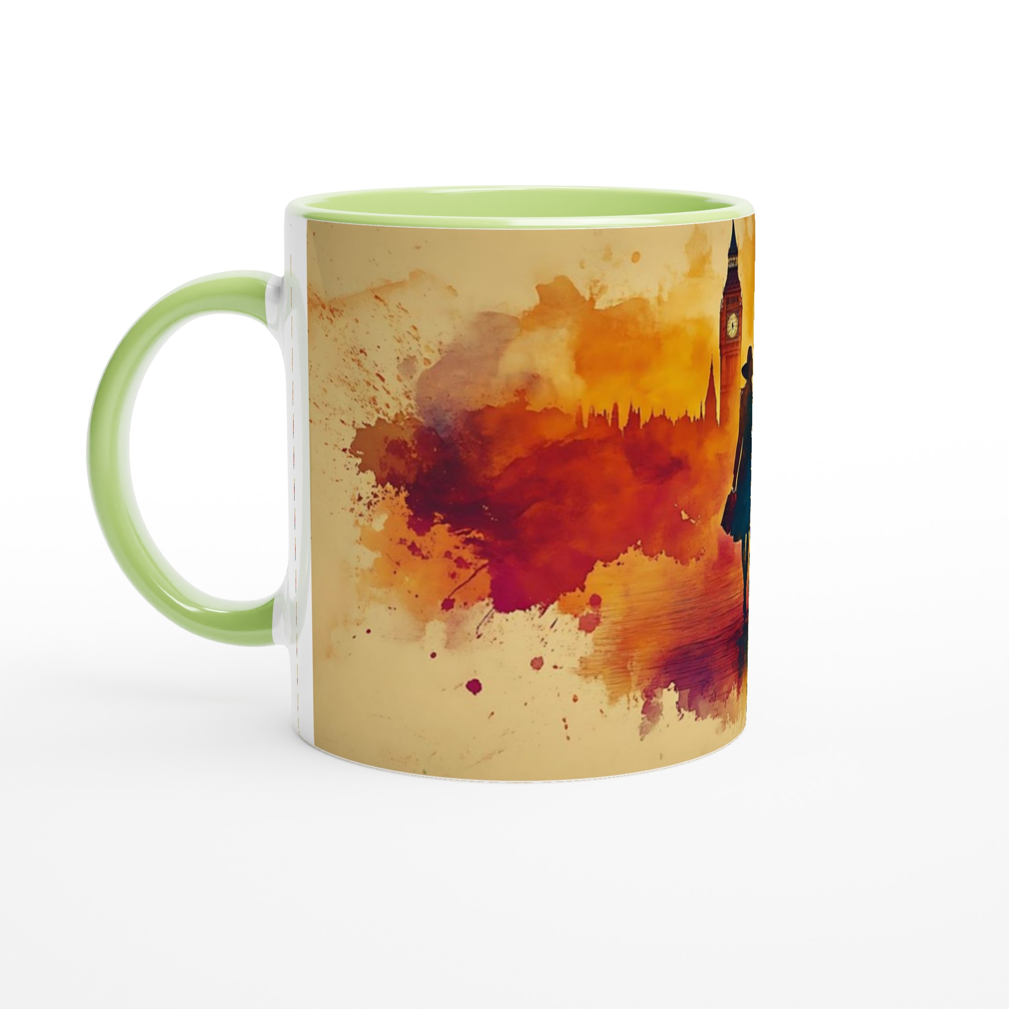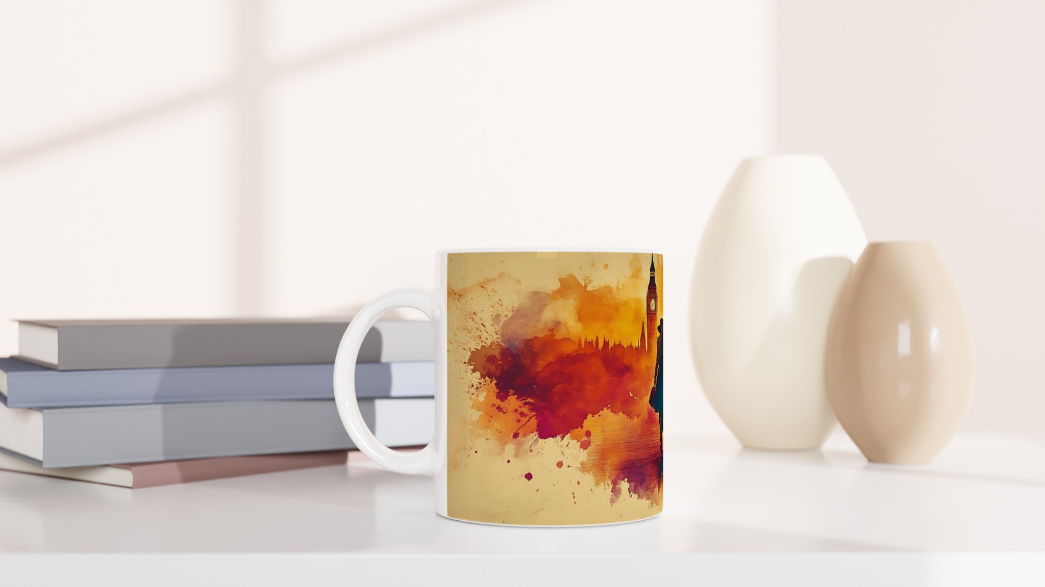 Fånga känslan av en romantisk promenad genom London med denna konstnärliga keramiska mugg. Den akvarellinspirerade designen, med sina varma orangea och djupa turkosa toner som omfamnar silhuetterna av Big Ben och St Paul’s Cathedral, gör varje klunk till en liten flykt. Den här stilrena muggen blir snabbt en vardagsfavorit. Perfekt för morgonkaffet, kvällens varma choklad eller när du bara vill njuta av en kopp te. Den blanka vita ytan framhäver trycket med klara och levande färger, som håller sig fina även efter många turer i mikron och diskmaskinen.