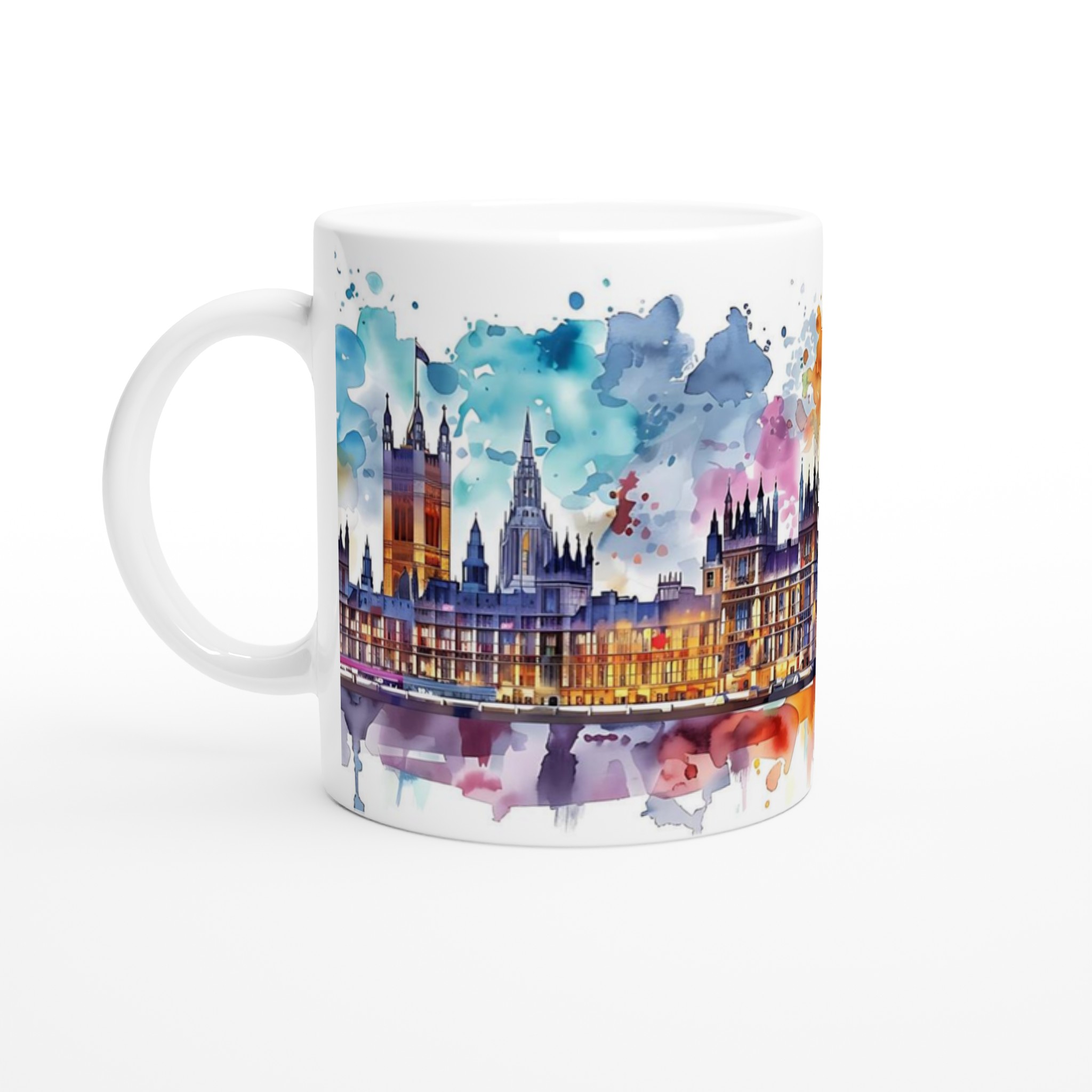 Vakna till liv med en färgsprakande resa längs Themsen varje morgon. Vår premium 11 oz keramiska mugg är dekorerad med en akvarellinspirerad vy av Londons siluett – från Big Ben till Tower Bridge – och förvandlar varje klunk till en konstnärlig upplevelse. Den livfulla designen sätter tonen för en kreativ start på dagen, vare sig du är på kontoret eller hemma.