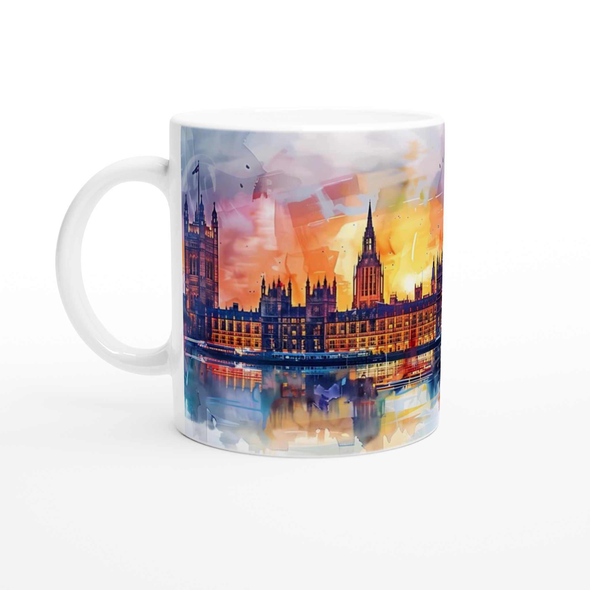Inspirerad av Londons ikoniska skyline i en levande akvarellstil, fångar denna mugg den magiska atmosfären av stadens ljus och flodens speglingar. Den blanka vita ytan ger ett skarpt och levande tryck som verkligen sticker ut, oavsett om det är en personlig design, ett roligt citat eller en present till någon du tycker om.