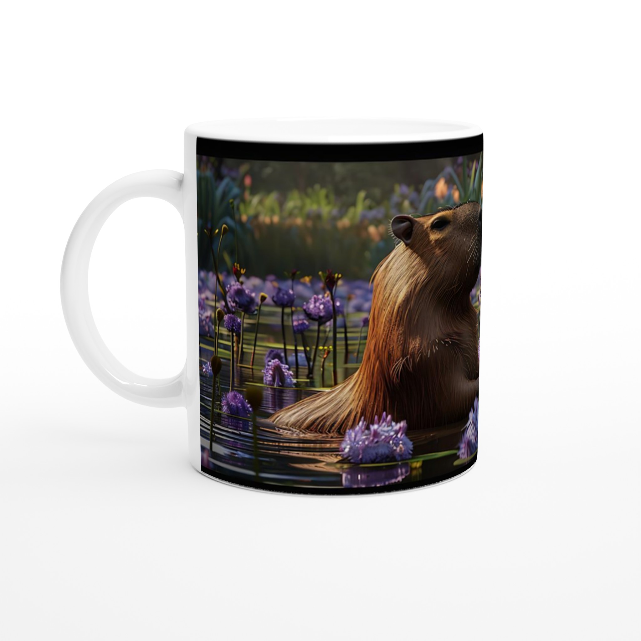 Föreställ dig den lugna känslan av en capybara omgiven av lila vattenblommor, fångad på din alldeles egen mugg. Denna unika design ger en touch av ro och natur till din dag. Vår mugg är tillverkad av högkvalitativ keramik som tål både diskmaskin och mikrovågsugn utan att tappa färg eller glans. Den håller formen och färgerna tvätt efter tvätt – en riktig vardagsfavorit som består.