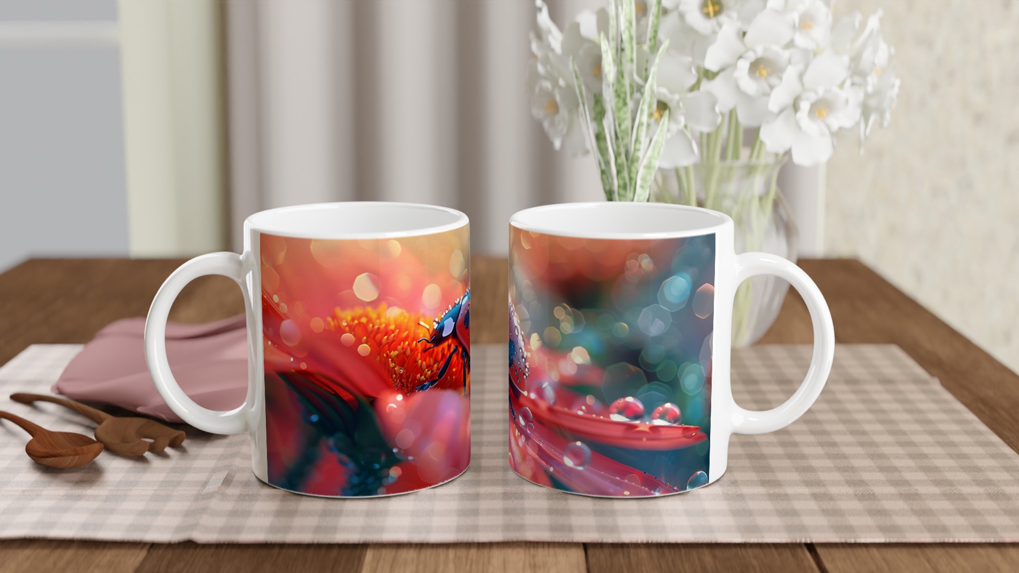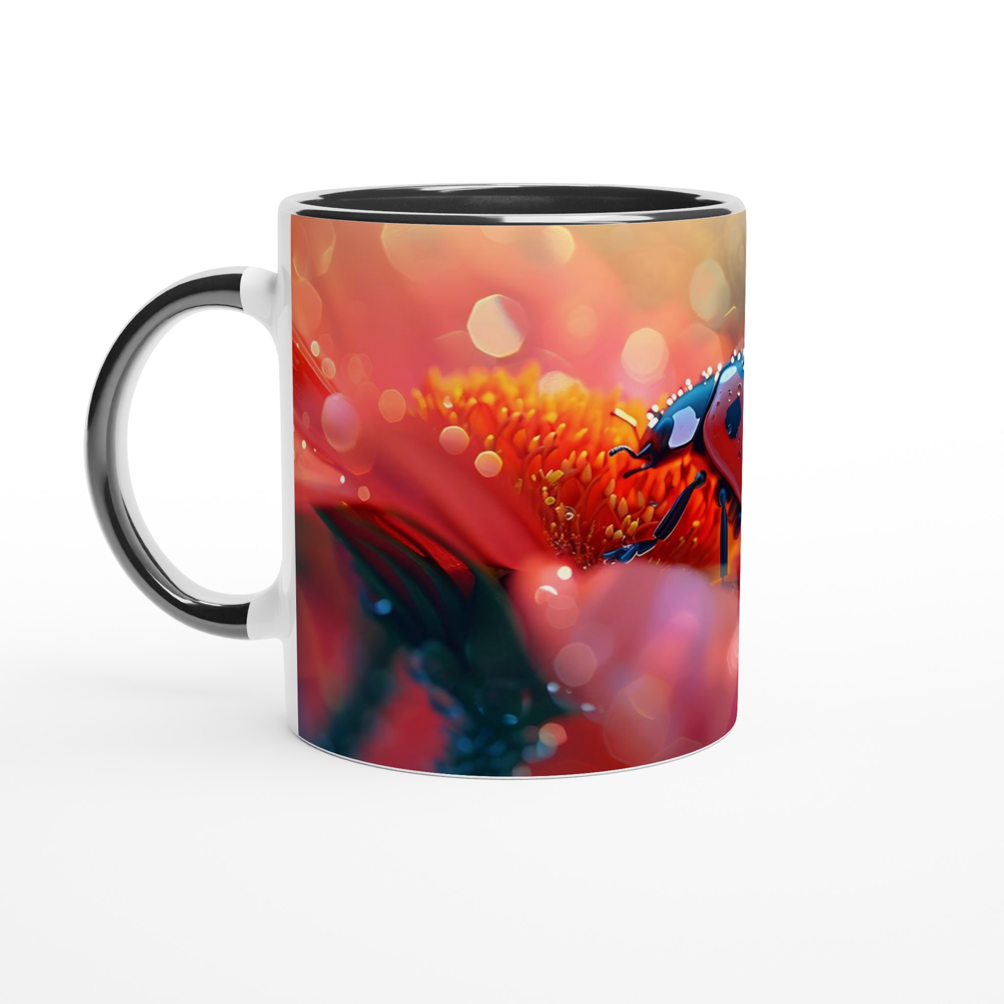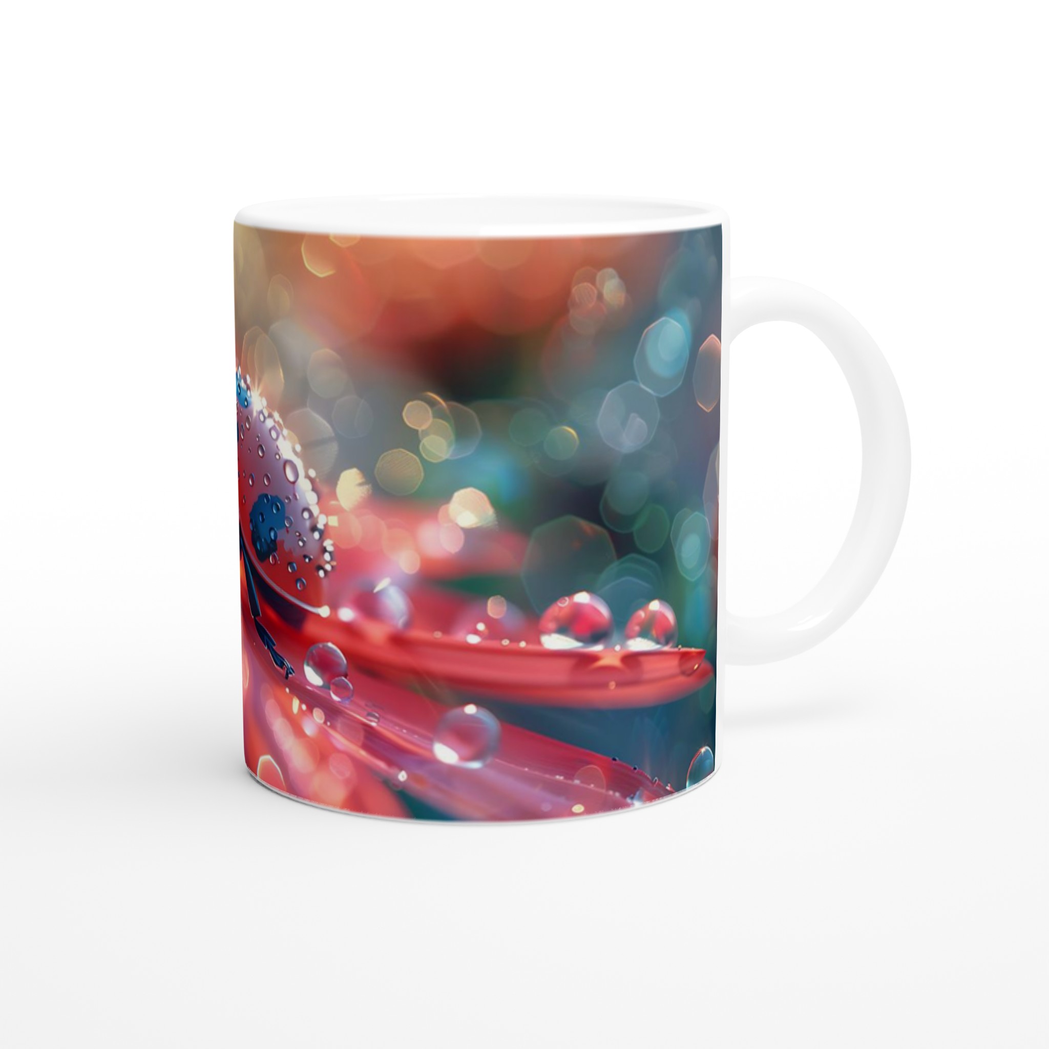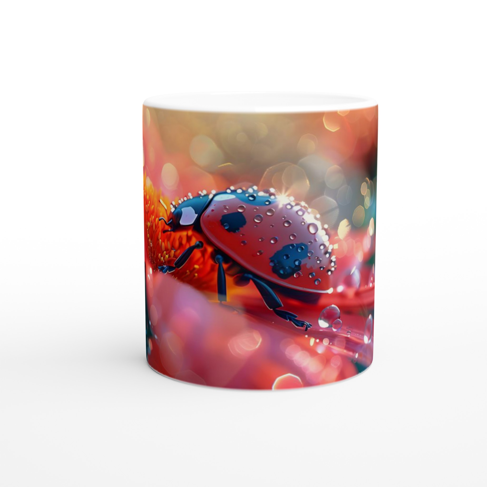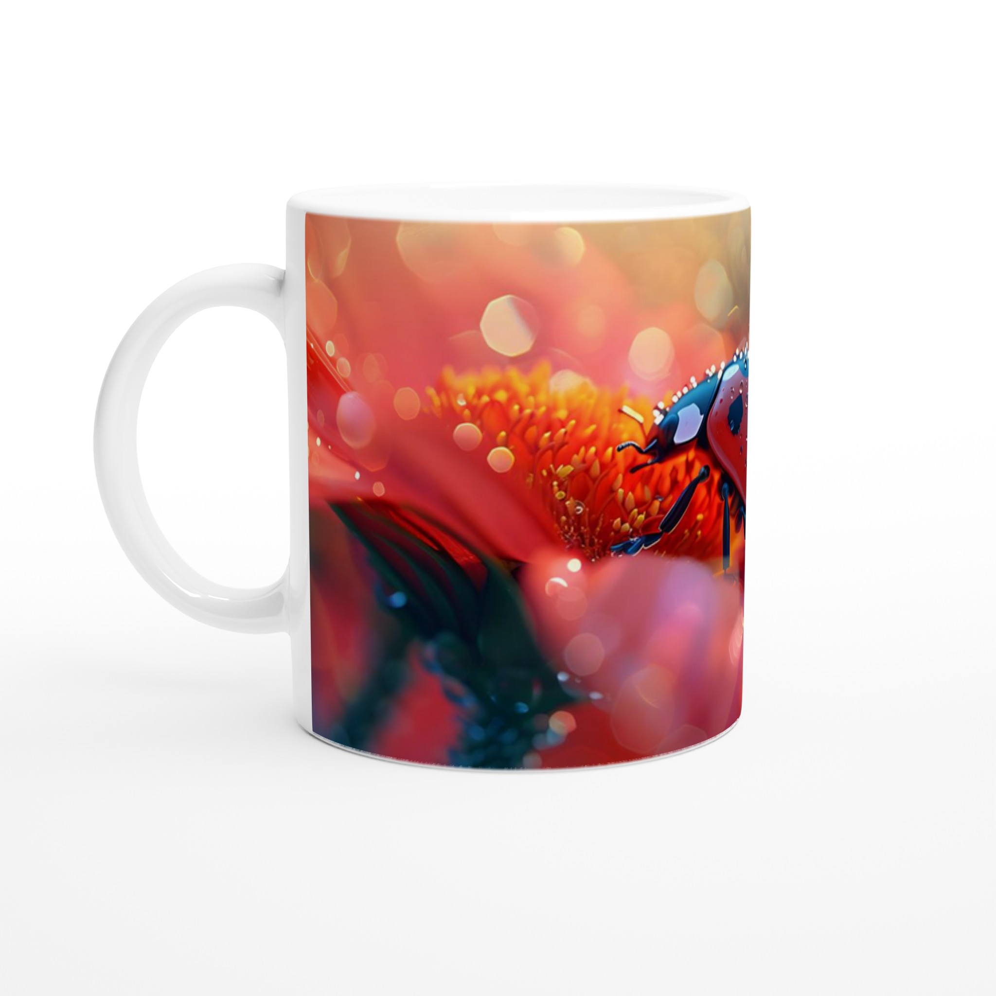 Vakna till liv med din nya favorit – en keramisk mugg som förtrollar varje ögonblick. Denna mugg fångar den glada energin hos en daggig nyckelpiga på en levande blomma, med en drömlik bokeh-effekt som ger en känsla av magi till din dryck. Perfekt för morgonkaffet, kvällens varma choklad eller när du bara vill njuta av en kopp te. Den blanka ytan gör att trycken framhävs med klara och levande färger, som håller sig fina även efter många turer i mikron och diskmaskinen.