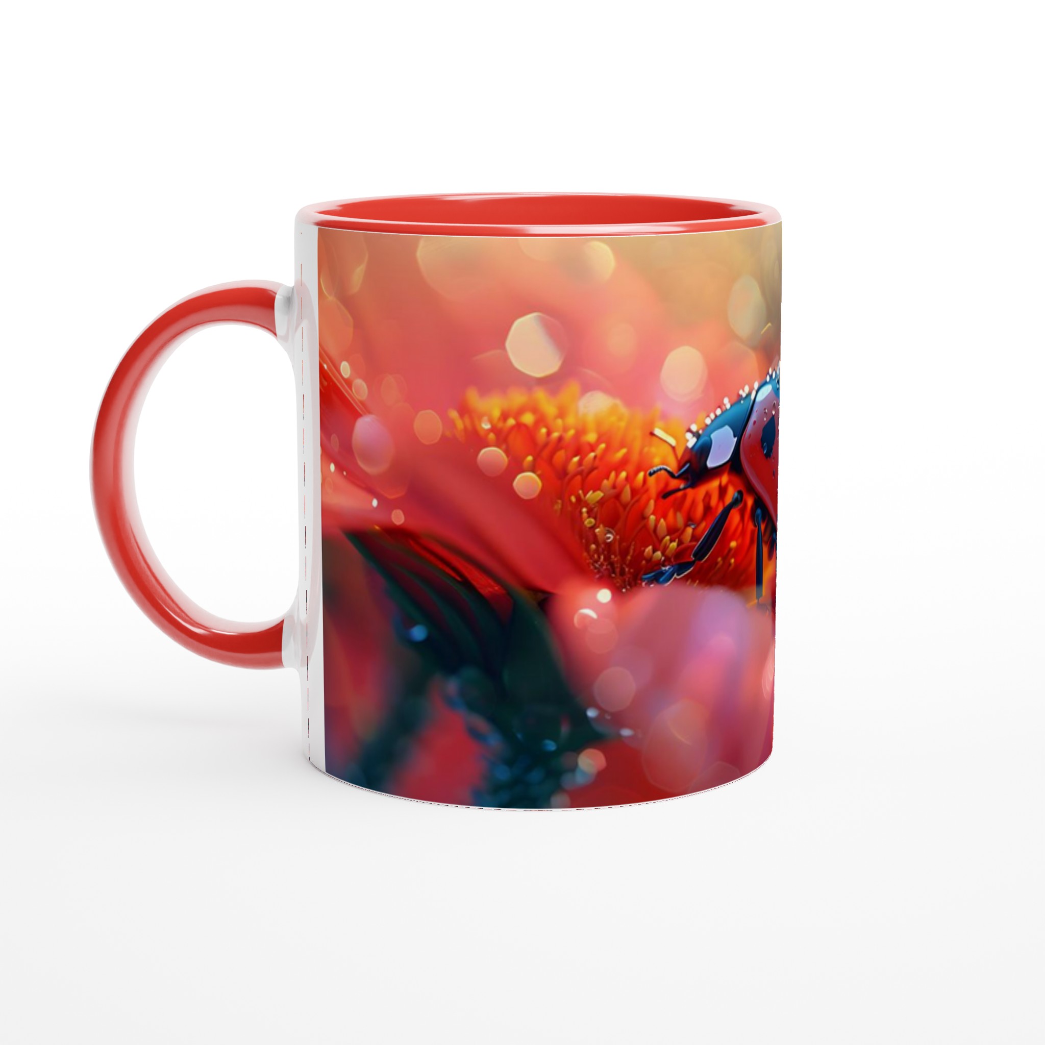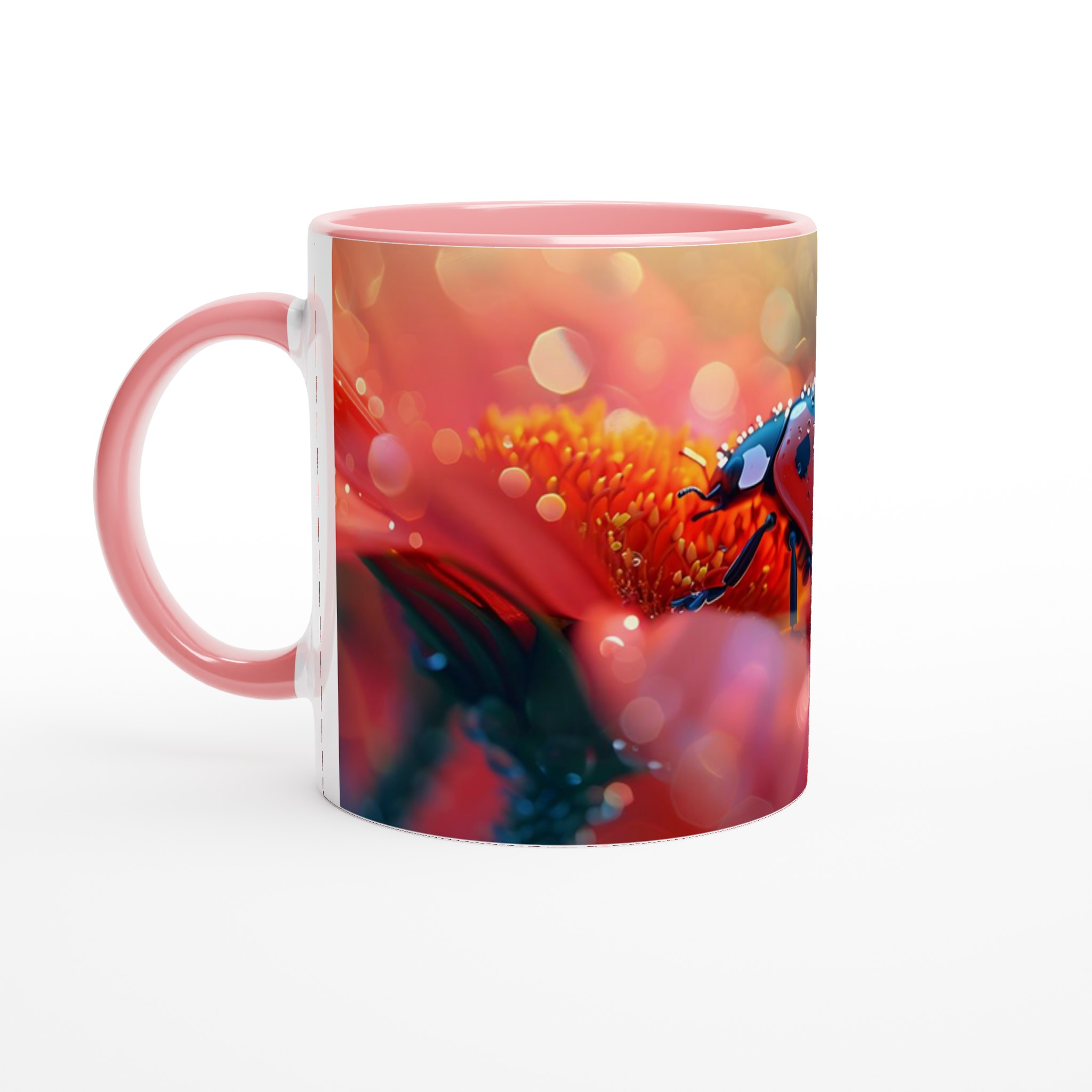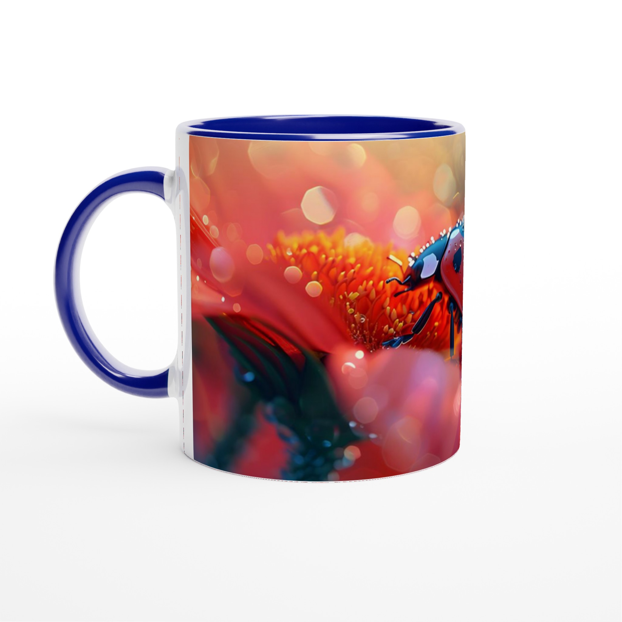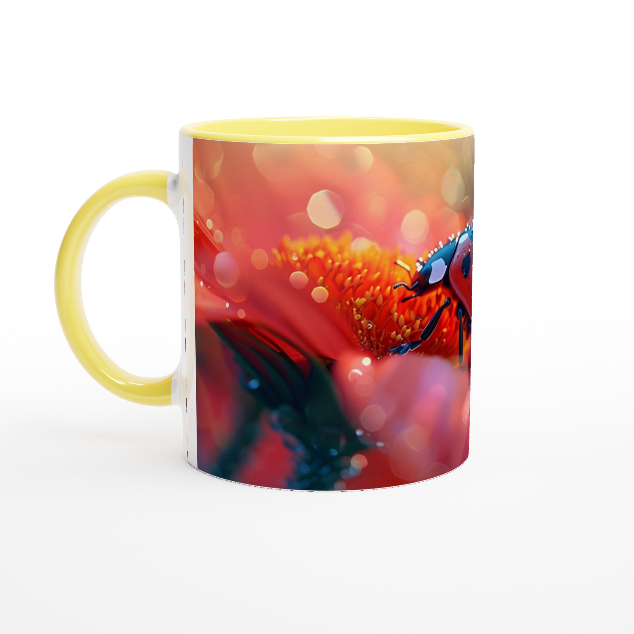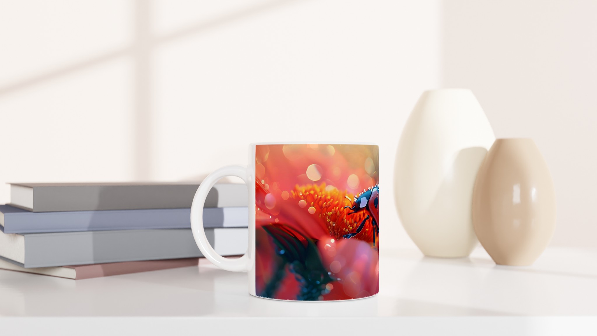 Vakna till liv med din nya favorit – en keramisk mugg som förtrollar varje ögonblick. Denna mugg fångar den glada energin hos en daggig nyckelpiga på en levande blomma, med en drömlik bokeh-effekt som ger en känsla av magi till din dryck. Perfekt för morgonkaffet, kvällens varma choklad eller när du bara vill njuta av en kopp te. Den blanka ytan gör att trycken framhävs med klara och levande färger, som håller sig fina även efter många turer i mikron och diskmaskinen.