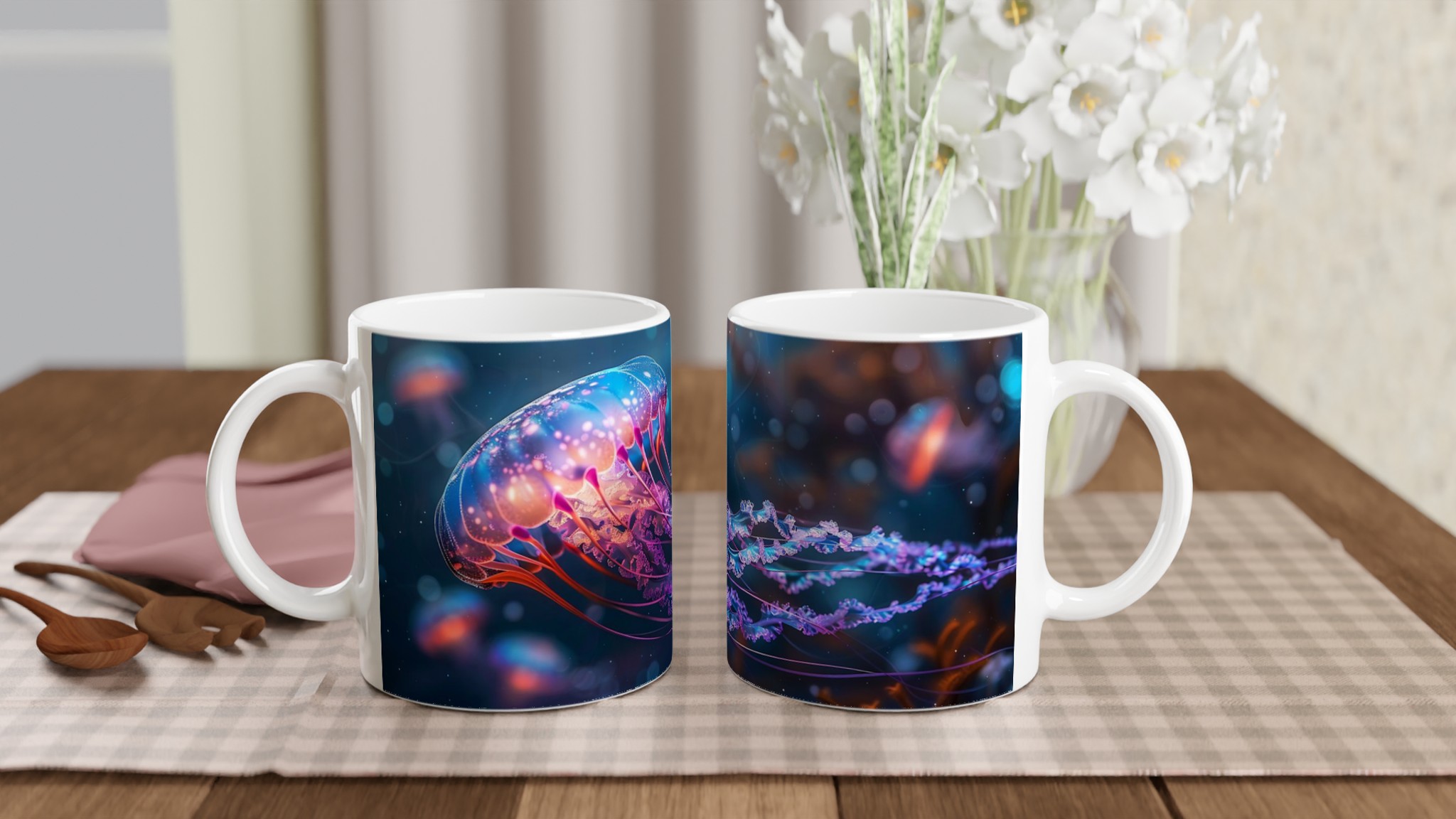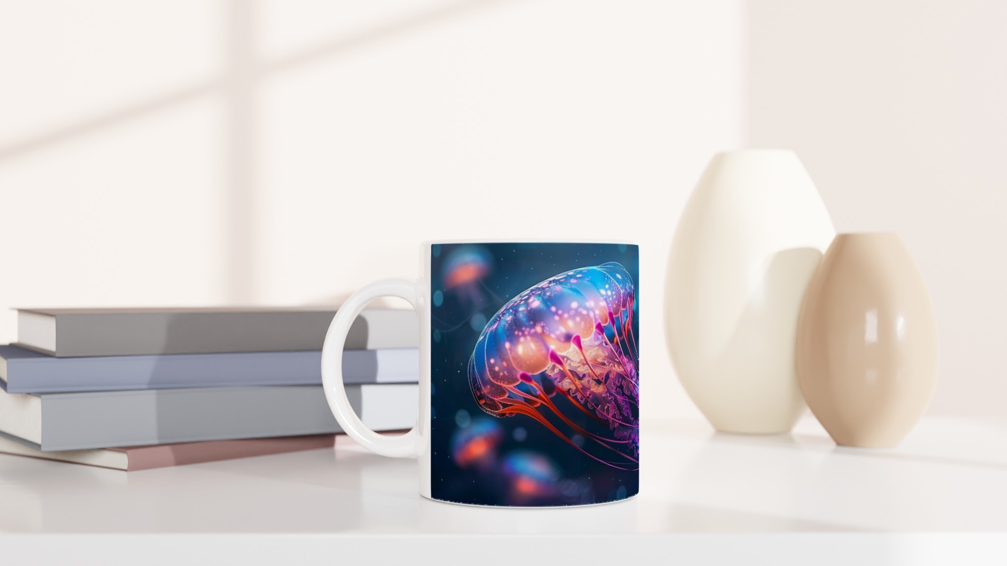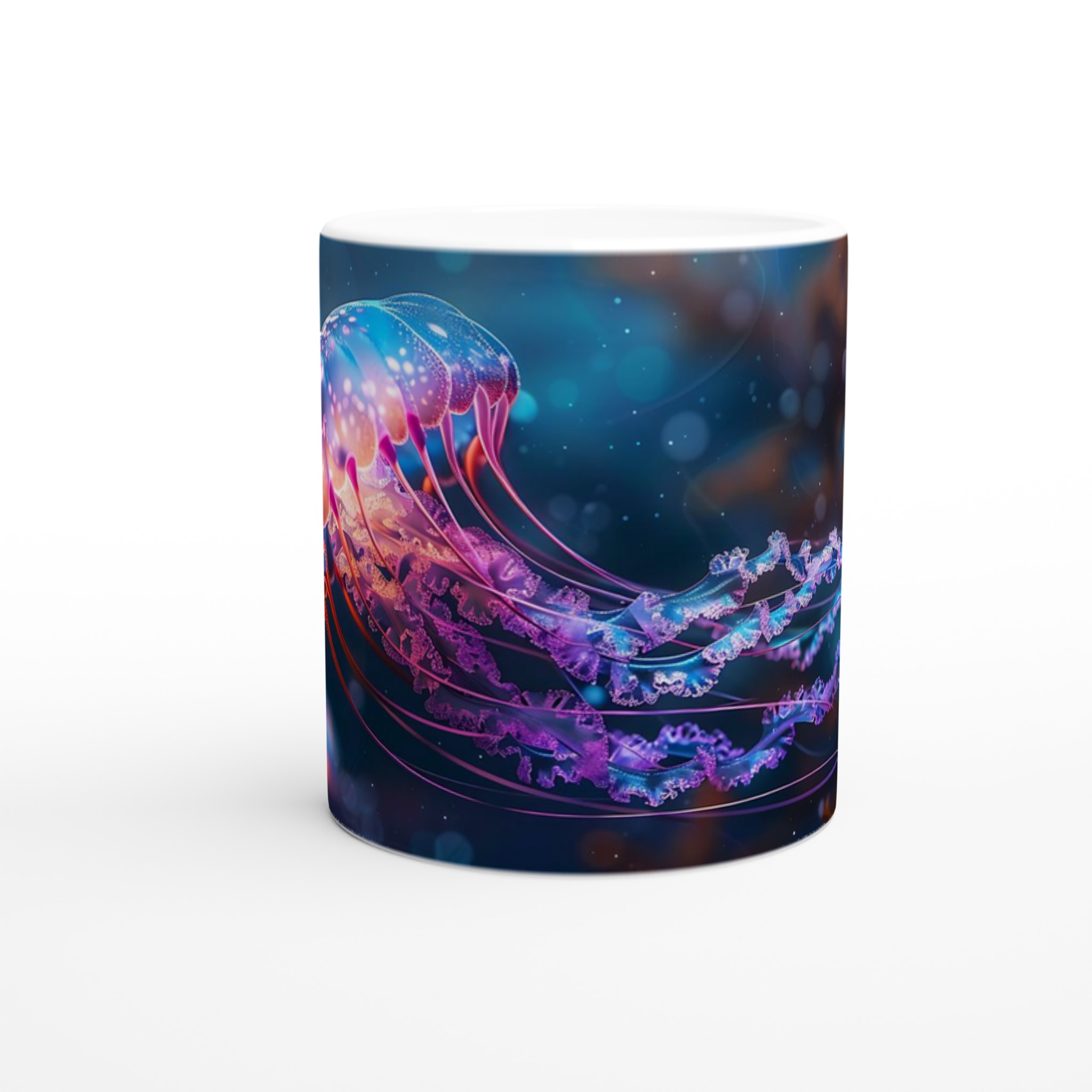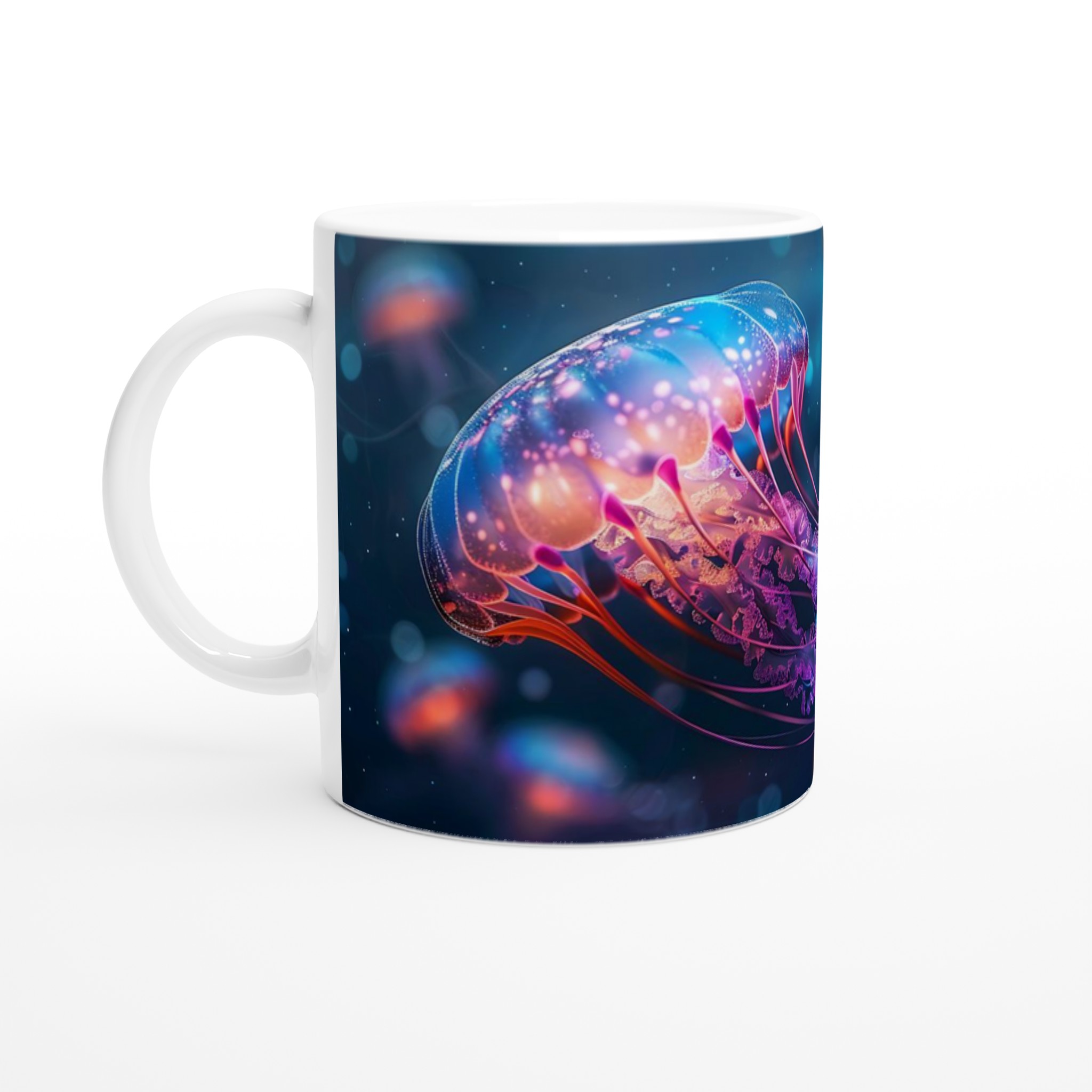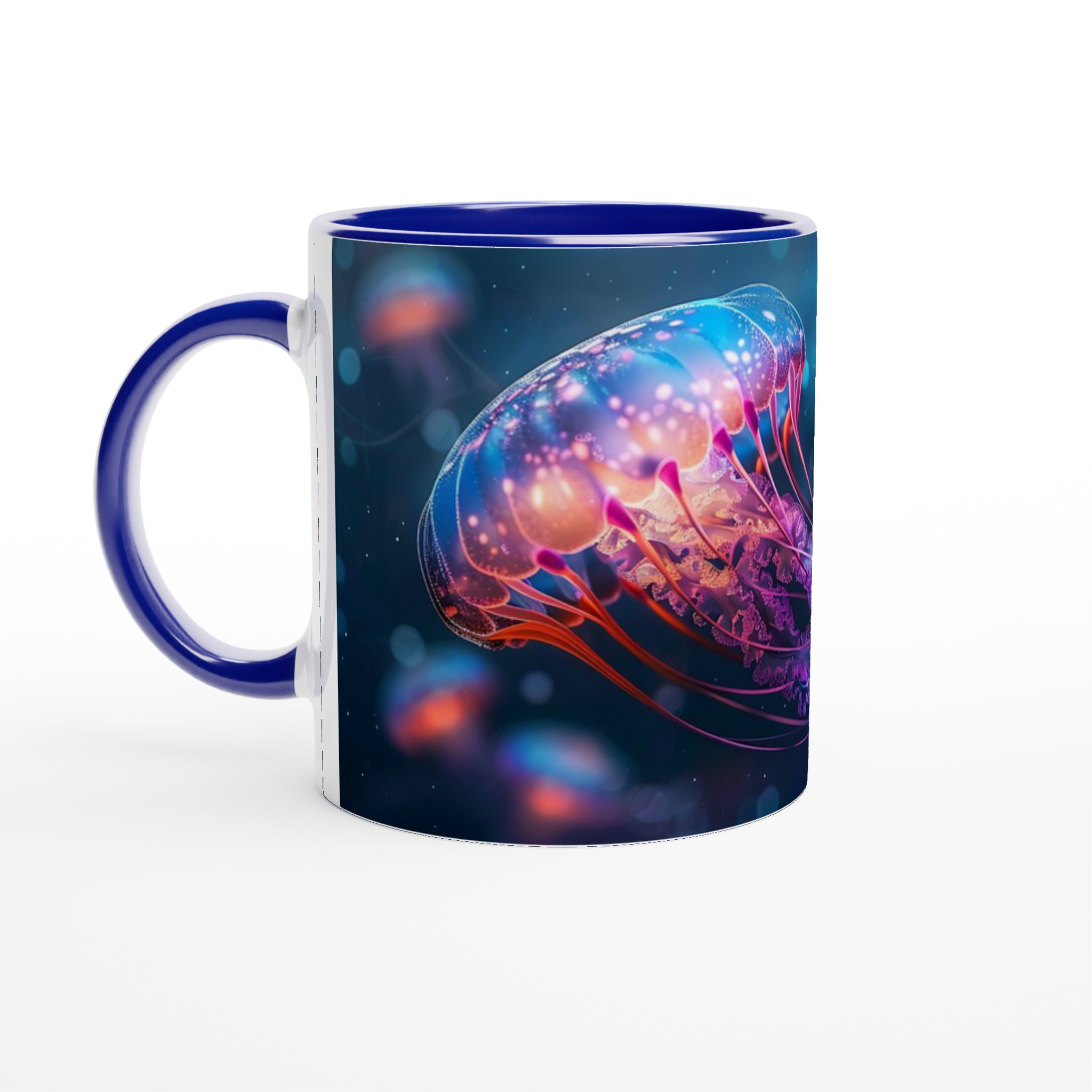 Föreställ dig att du dyker ner i en värld av lugn och färg med varje klunk. Denna unika keramiska mugg, prydd med en lysande manet i fascinerande neonfärger som blått, lila och rosa, fångar havets mystik och skönhet. Den är inte bara en mugg – det är ett konstverk som förvandlar din fikastund till en magisk upplevelse. Oavsett om det är för morgonkaffet, kvällens varma choklad eller en lugn stund med te, kommer den här muggen att lysa upp din dag med sin drömlika undervattensdesign.