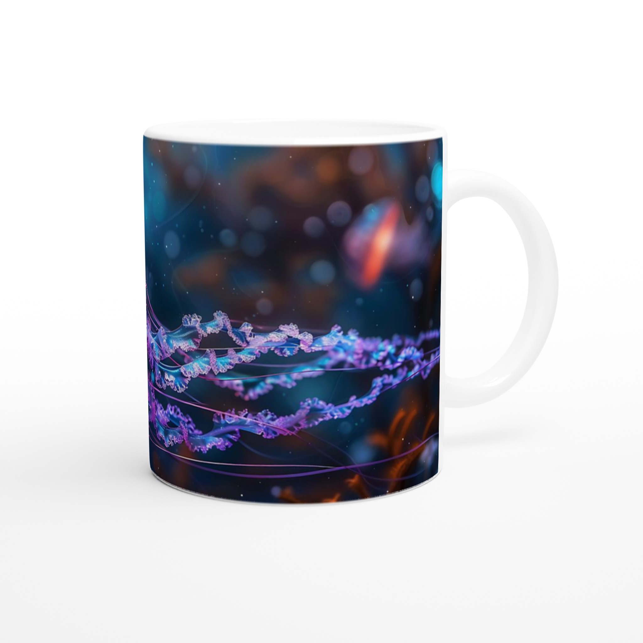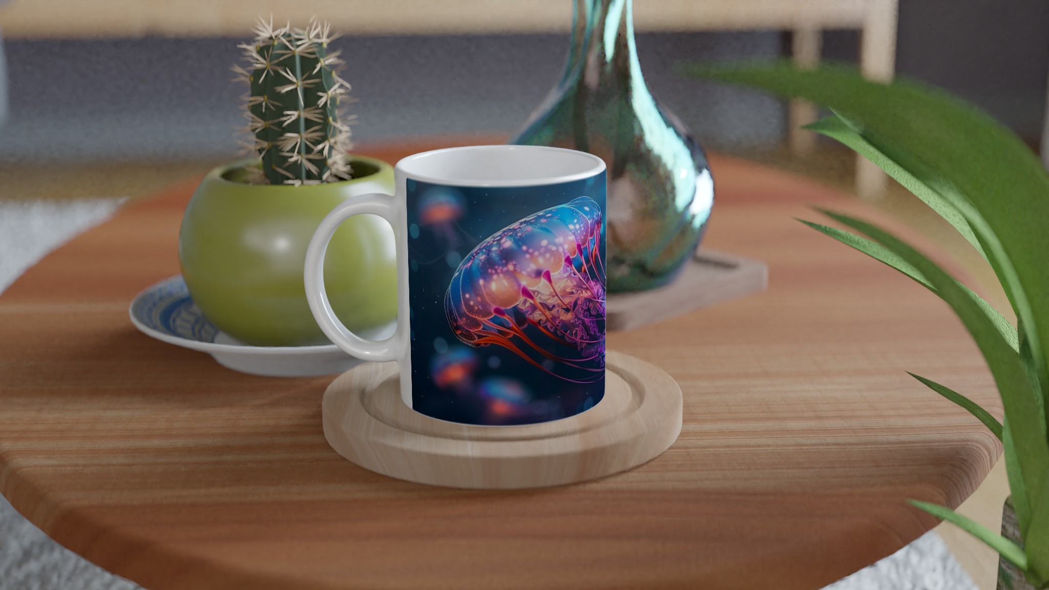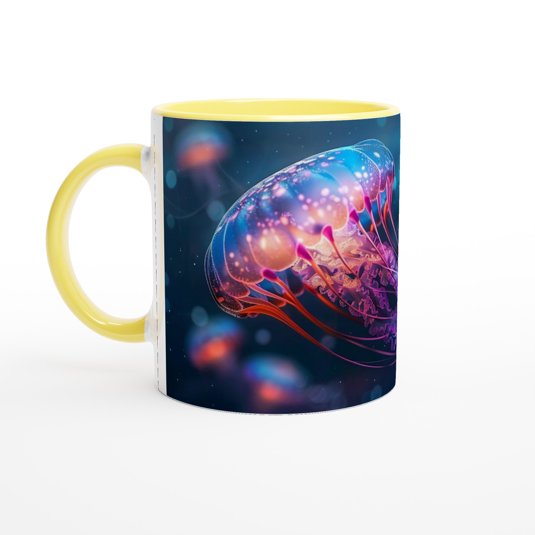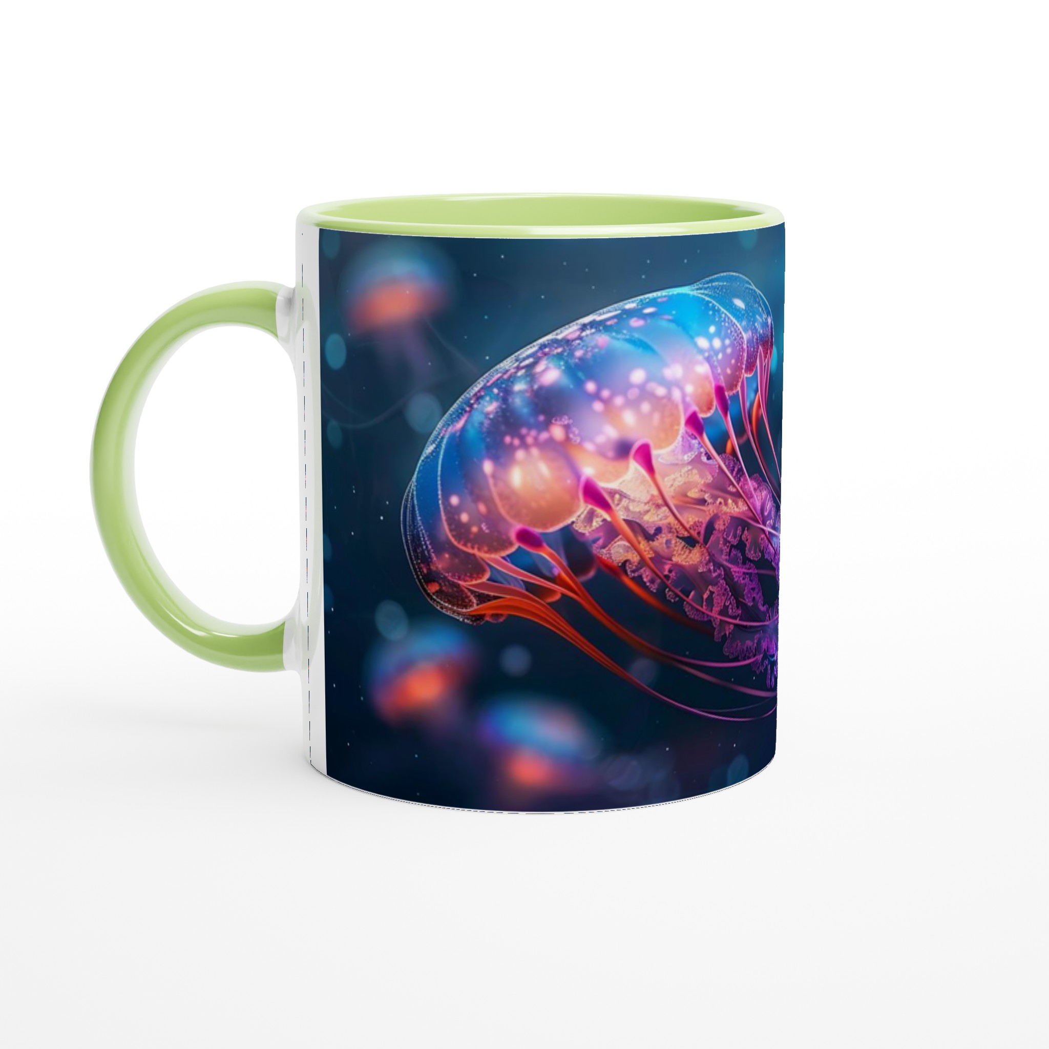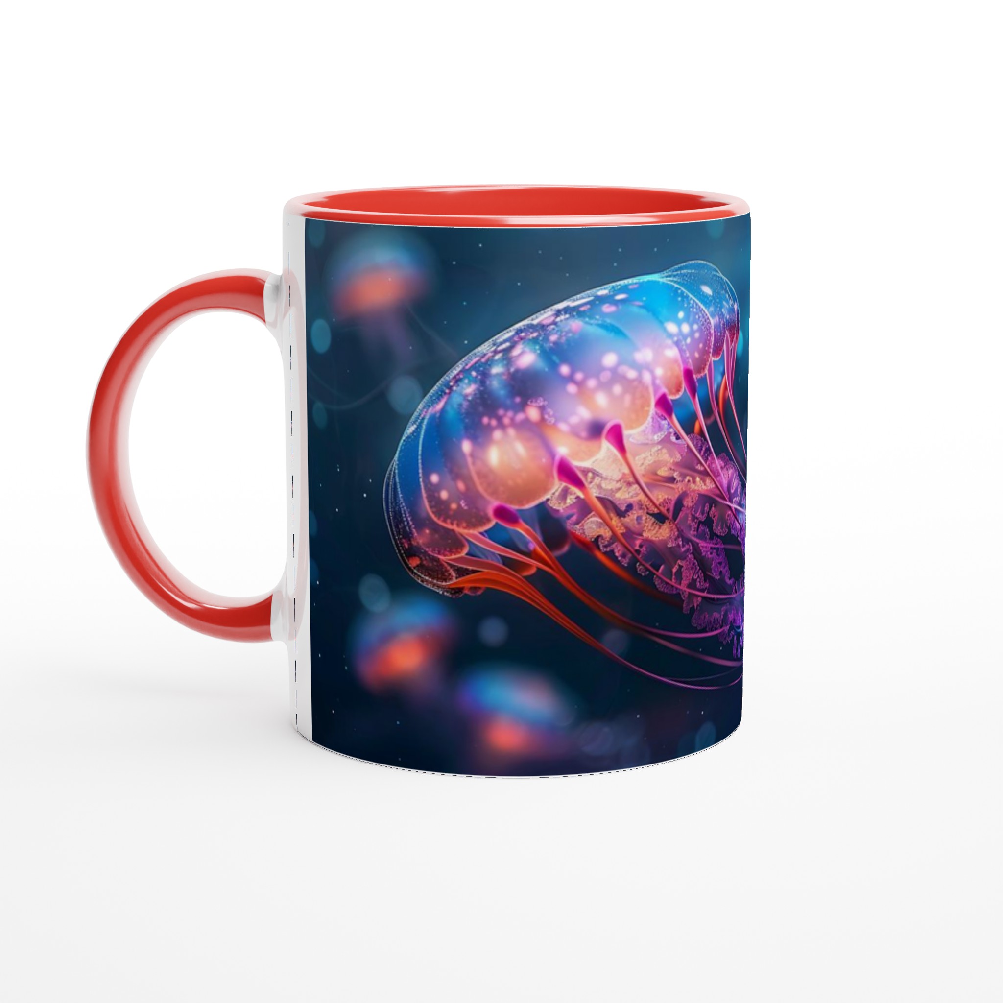 Föreställ dig att du dyker ner i en värld av lugn och färg med varje klunk. Denna unika keramiska mugg, prydd med en lysande manet i fascinerande neonfärger som blått, lila och rosa, fångar havets mystik och skönhet. Den är inte bara en mugg – det är ett konstverk som förvandlar din fikastund till en magisk upplevelse. Oavsett om det är för morgonkaffet, kvällens varma choklad eller en lugn stund med te, kommer den här muggen att lysa upp din dag med sin drömlika undervattensdesign.