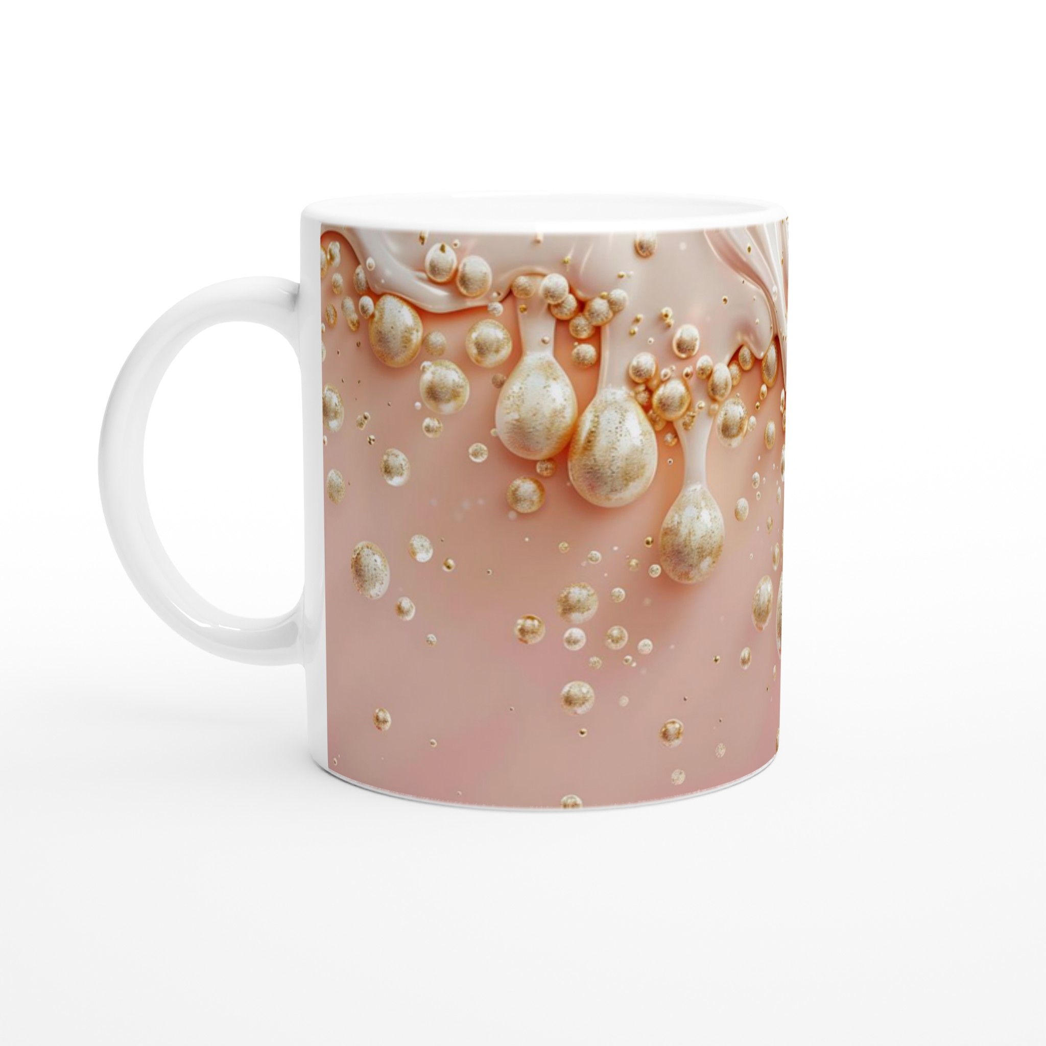 Lyft varje kaffestund med vår premium keramikmugg – stilren, hållbar och skapad för att låta ditt motiv glänsa. Inspirerad av drömlika toner av persika och skimrande guldglitter, är denna mugg en hyllning till elegans och glädje. Den blanka vita ytan ger ett skarpt och levande tryck som verkligen sticker ut, oavsett om det är en personlig design, ett roligt citat eller en present till någon du tycker om.