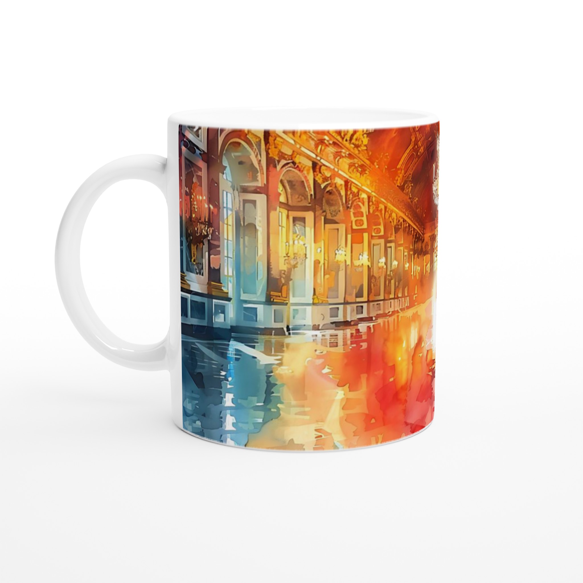Inspirerad av den drömska och färgsprakande akvarellen av en lång, majestätisk hall, förvandlar denna mugg din fikapaus till en stund av lyx. De varma guldiga tonerna som möter svala blå skapar en konstnärlig och inbjudande känsla, perfekt för den som uppskattar både skönhet och funktionalitet.