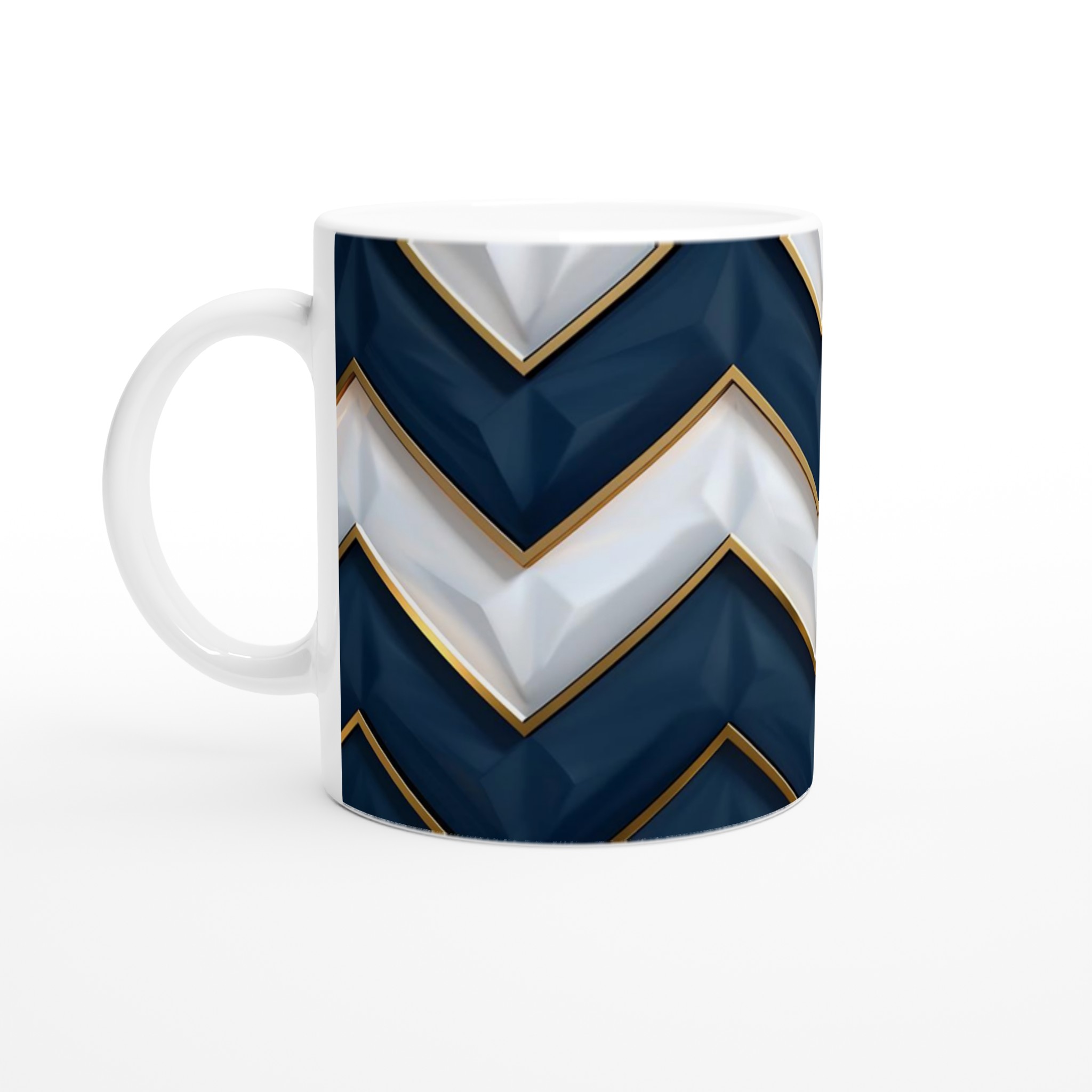 Inspirerad av den sofistikerade chevronmönstret med dess djupa marinblå, rena vita och glänsande guldaccenter, ger denna mugg en touch av modern elegans till din vardag. Den blanka ytan garanterar ett skarpt och levande tryck som verkligen sticker ut, perfekt för att visa upp en personlig design, ett inspirerande citat eller som en exklusiv present.