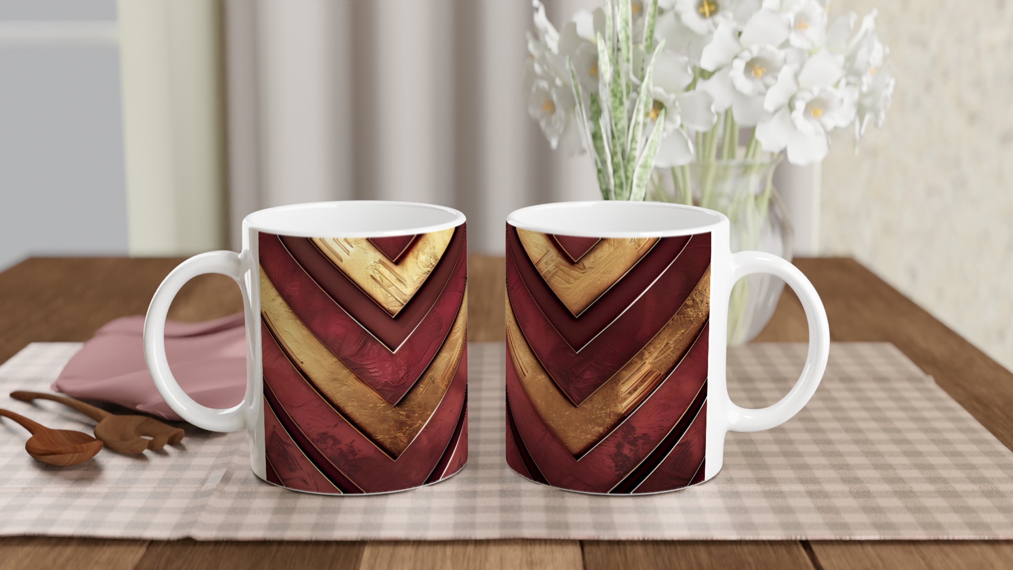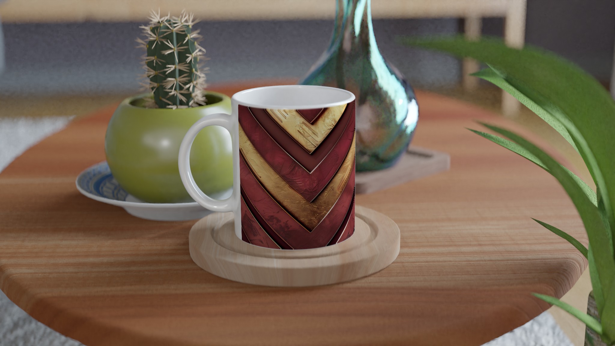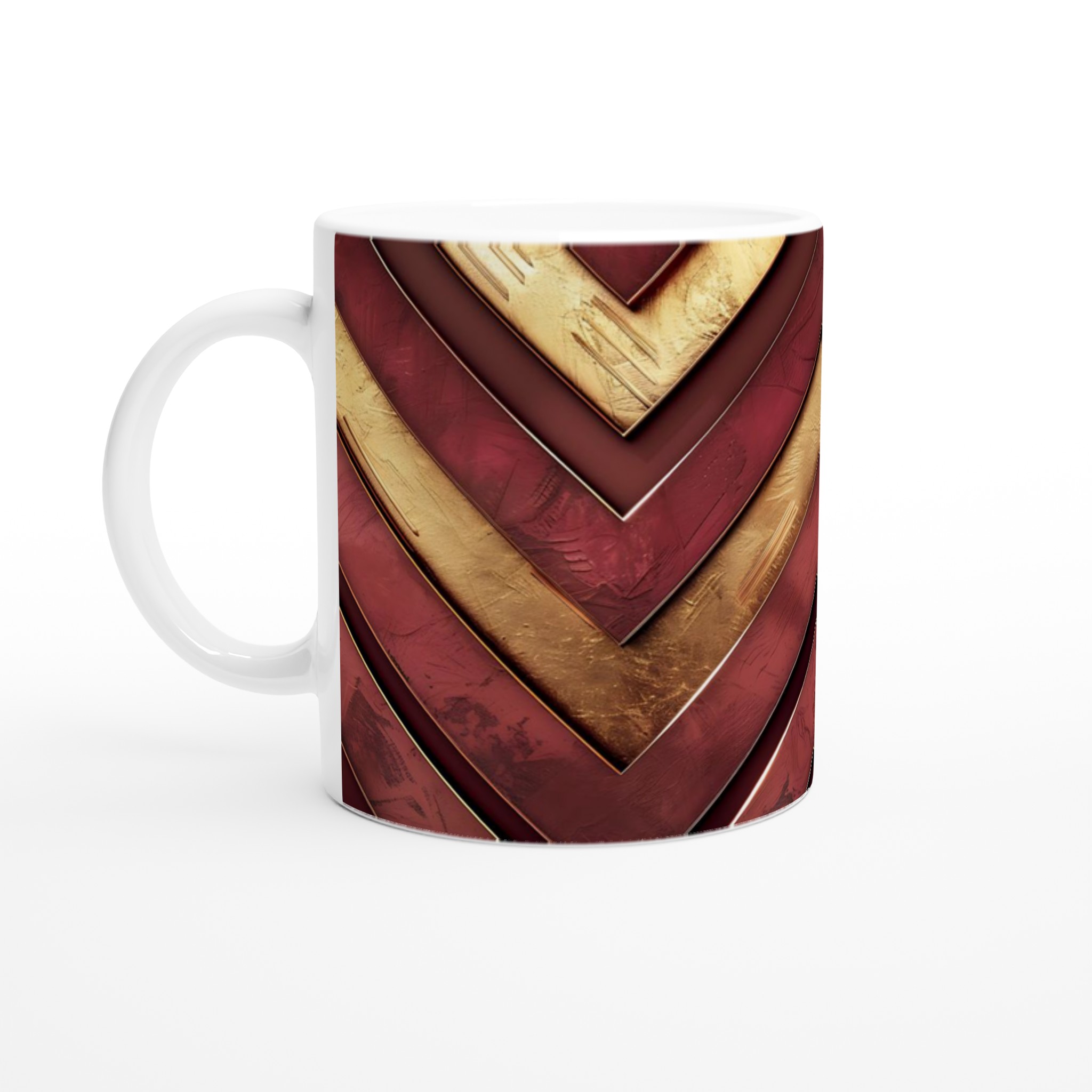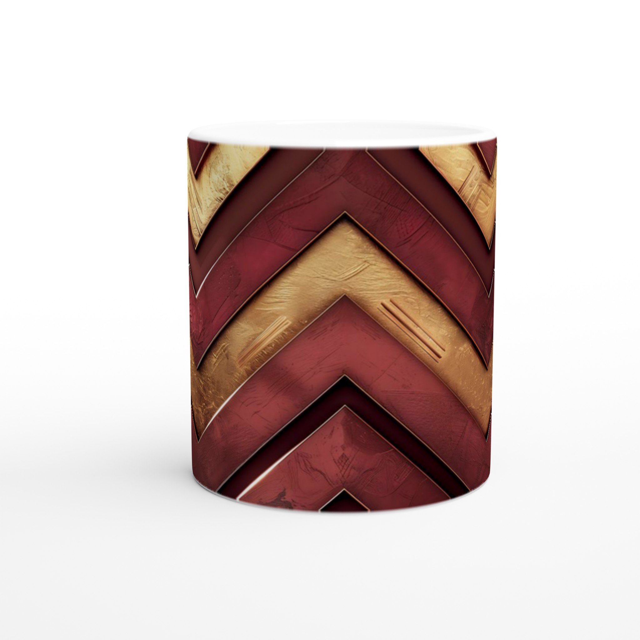 Lyft din fikastund med denna exklusiva keramikmugg, prydd med ett iögonfallande chevronmönster i sofistikerade guld- och vinröda toner. Denna mugg är inte bara en praktisk vardagsfavorit utan också en statement-detalj som ger en touch av lyx till ditt kök eller kontor. Den rika färgpaletten och de skarpa, moderna linjerna gör den till ett perfekt inslag för dig som uppskattar både stil och funktionalitet.