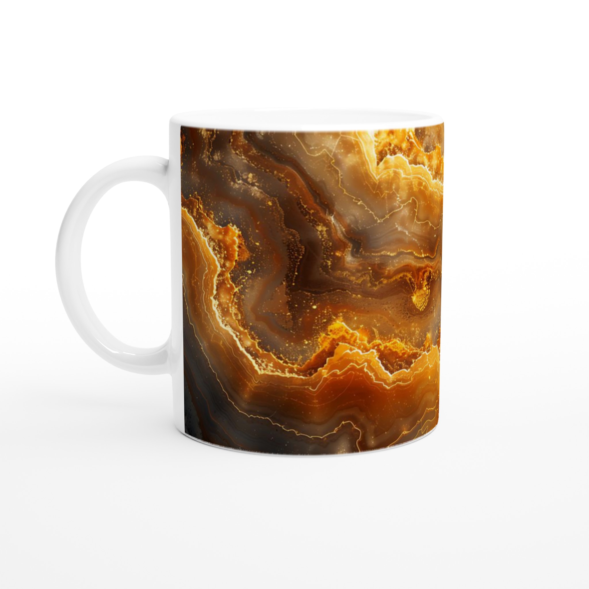 Den blanka vita ytan ger ett skarpt och levande tryck som verkligen sticker ut, oavsett om det är en personlig design, ett roligt citat eller en present till någon du tycker om. Varje klunk blir en upplevelse av ren elegans med den rika designen av guldådrade marmor som pryder denna exklusiva mugg. Det skimrande mönstret för tankarna till flytande guld och naturstenens majestät, vilket skapar en känsla av lyx och värme i din hand.
