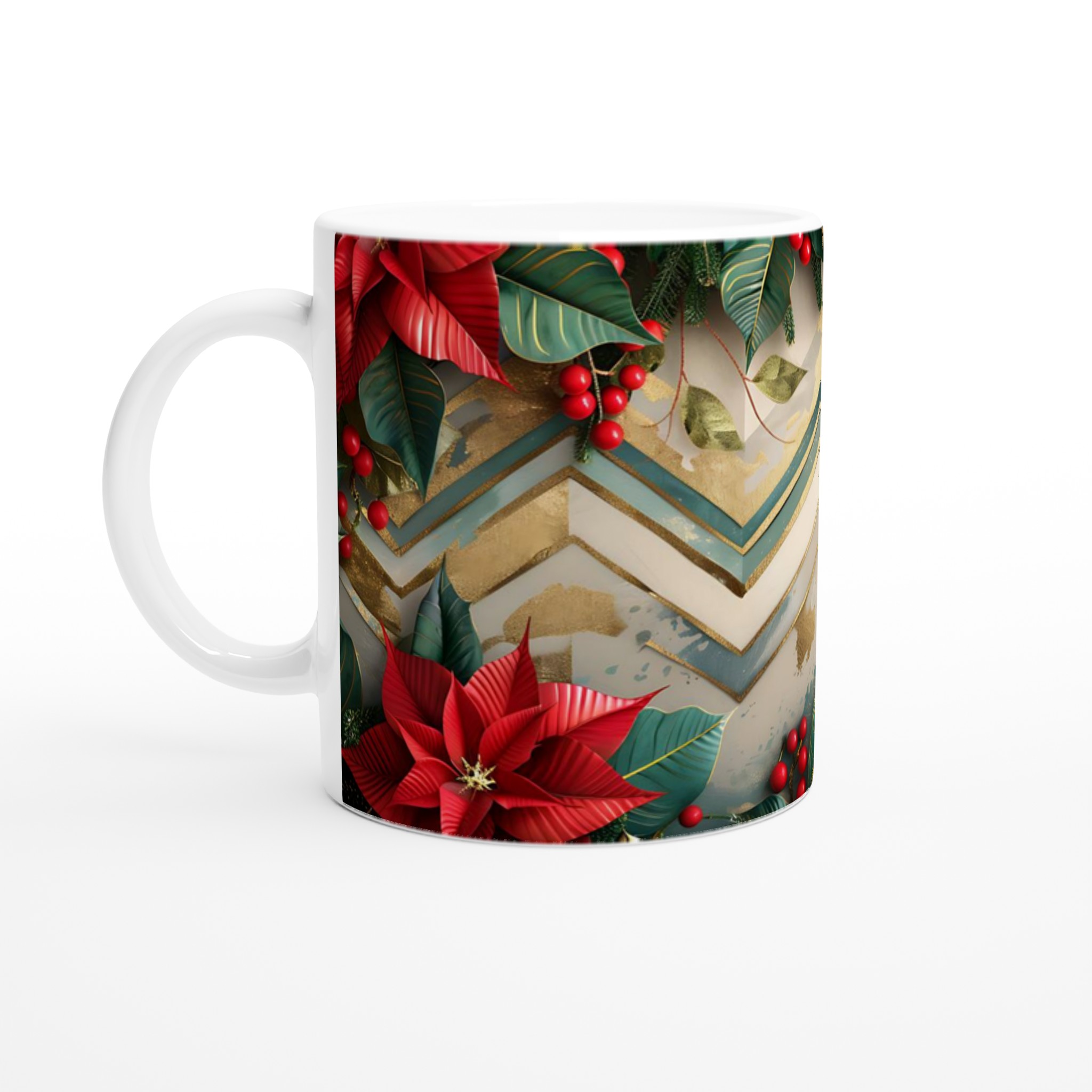 Inspirerad av julens glans med frodiga röda julstjärnor, glänsande bär och eleganta guldaccenter mot en modern chevronbakgrund, fångar denna mugg ögonblickets festliga charm. Den blanka vita ytan ger ett skarpt och levande tryck som verkligen sticker ut, oavsett om det är en personlig design, ett roligt citat eller en present till någon du tycker om.