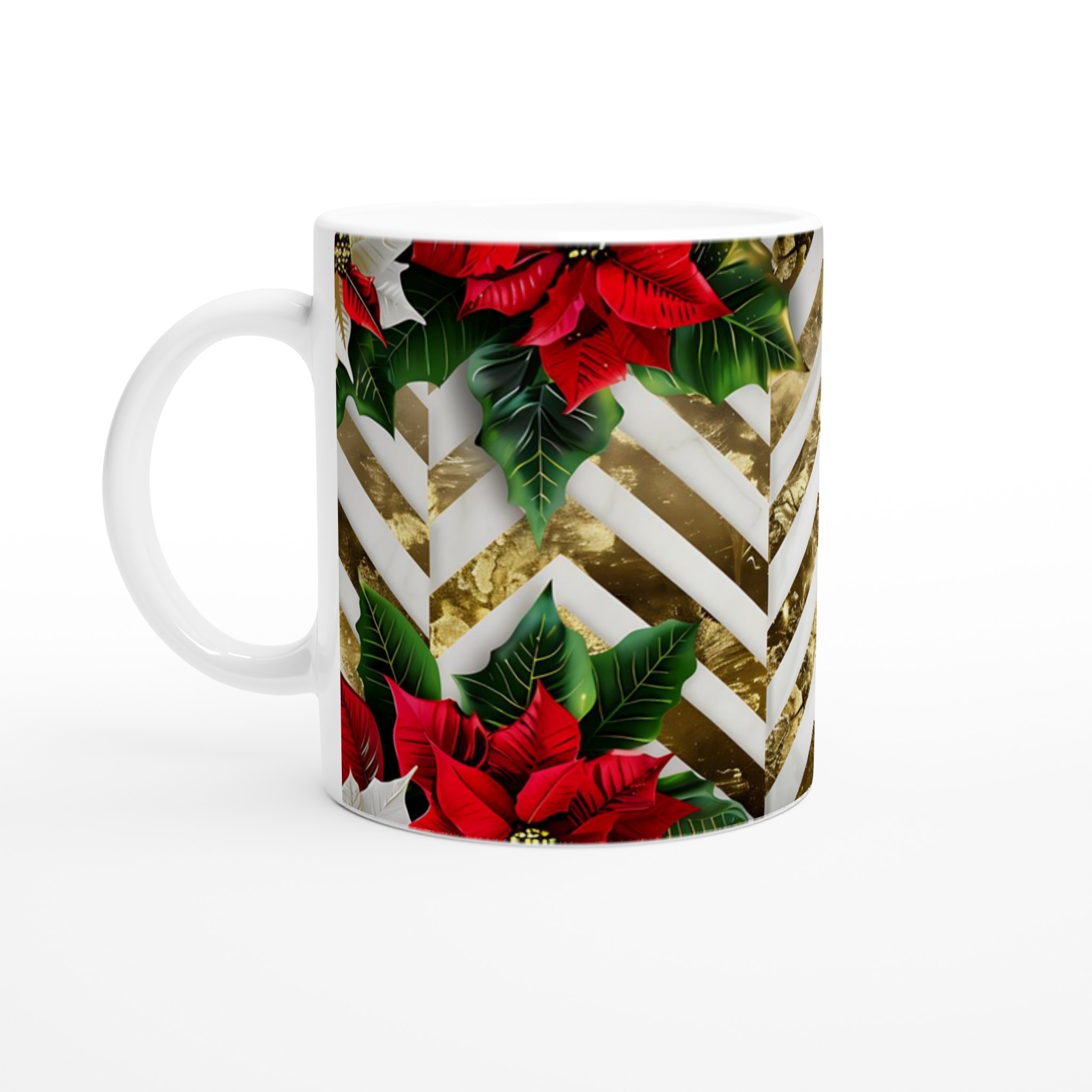 Denna exklusiva julmugg kombinerar festlig elegans med vardaglig funktionalitet. De djupröda och krämvita julstjärnorna, omgivna av frodigt grönt bladverk, vilar mot en sofistikerad bakgrund av guldskimrande och vita chevronmönster. En touch av lyx och fest som förvandlar varje sipp till en upplevelse. Den blanka vita ytan ger ett skarpt och levande tryck som verkligen sticker ut, oavsett om det är en personlig design, ett roligt citat eller en present till någon du tycker om.