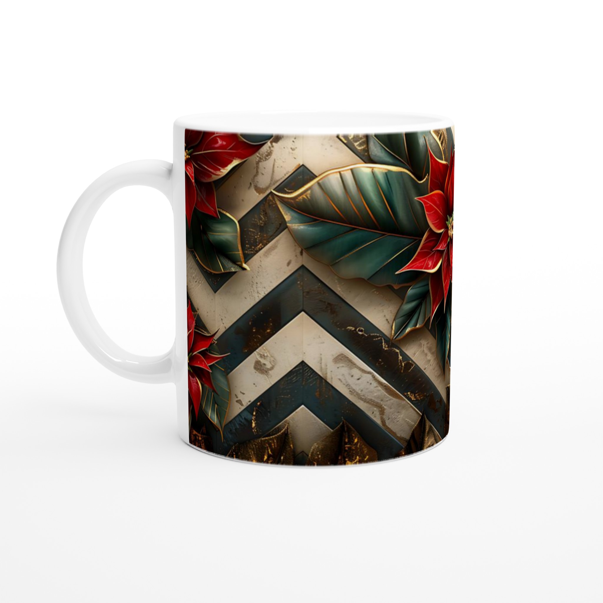 Inspirerad av den festliga glansen hos en julstjärna, framhäver denna mugg ett levande och skarpt tryck. De rika röda blommorna mot de djupgröna bladen, accentuerade med guldiga detaljer och en elegant chevronbakgrund, skapar en sofistikerad och festlig känsla. Den blanka vita ytan ger ett skarpt och levande tryck som verkligen sticker ut, oavsett om det är en personlig design, ett roligt citat eller en present till någon du tycker om.