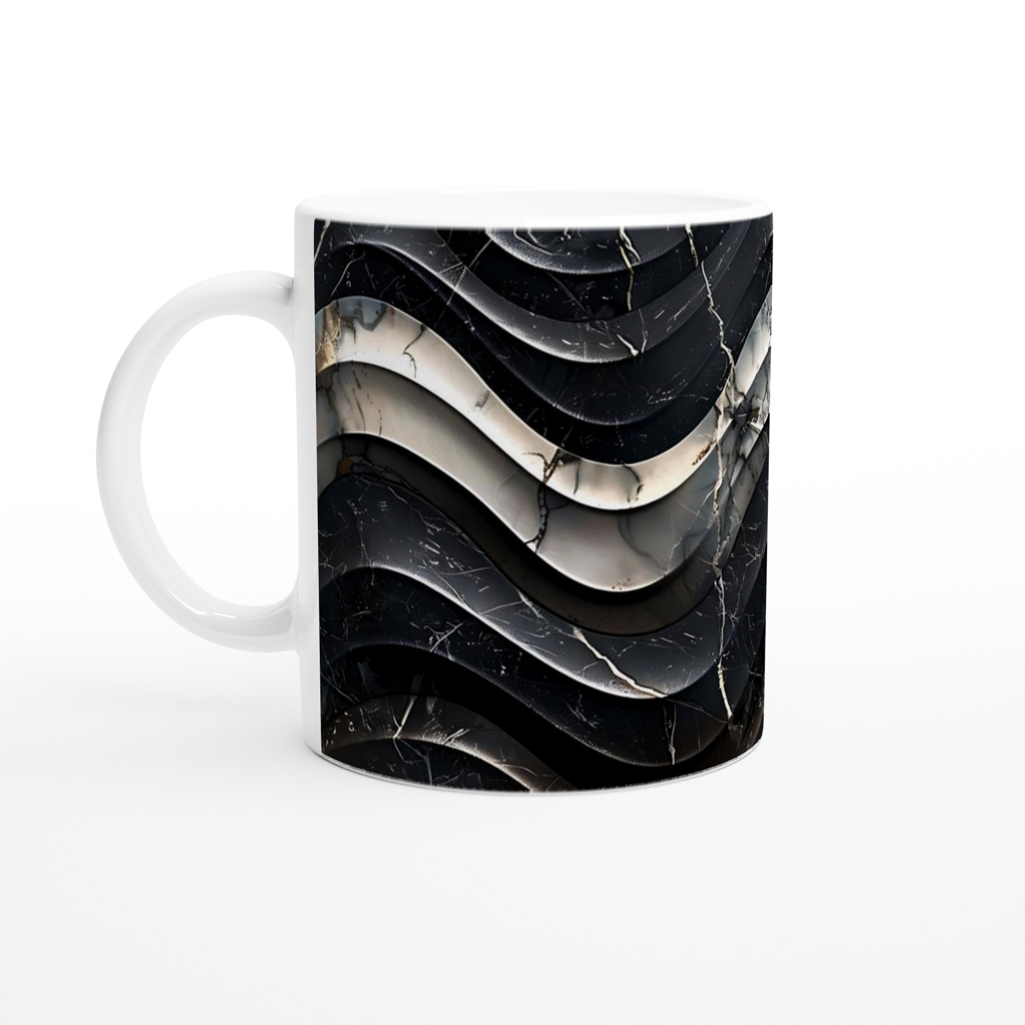 Inspirerad av den eleganta kontrasten av mörkt marmor och ljusa vågformade linjer, ger denna mugg en sofistikerad touch till din dryckesupplevelse. Den blanka vita ytan ger ett skarpt och levande tryck som verkligen sticker ut, oavsett om det är en personlig design, ett roligt citat eller en present till någon du tycker om.