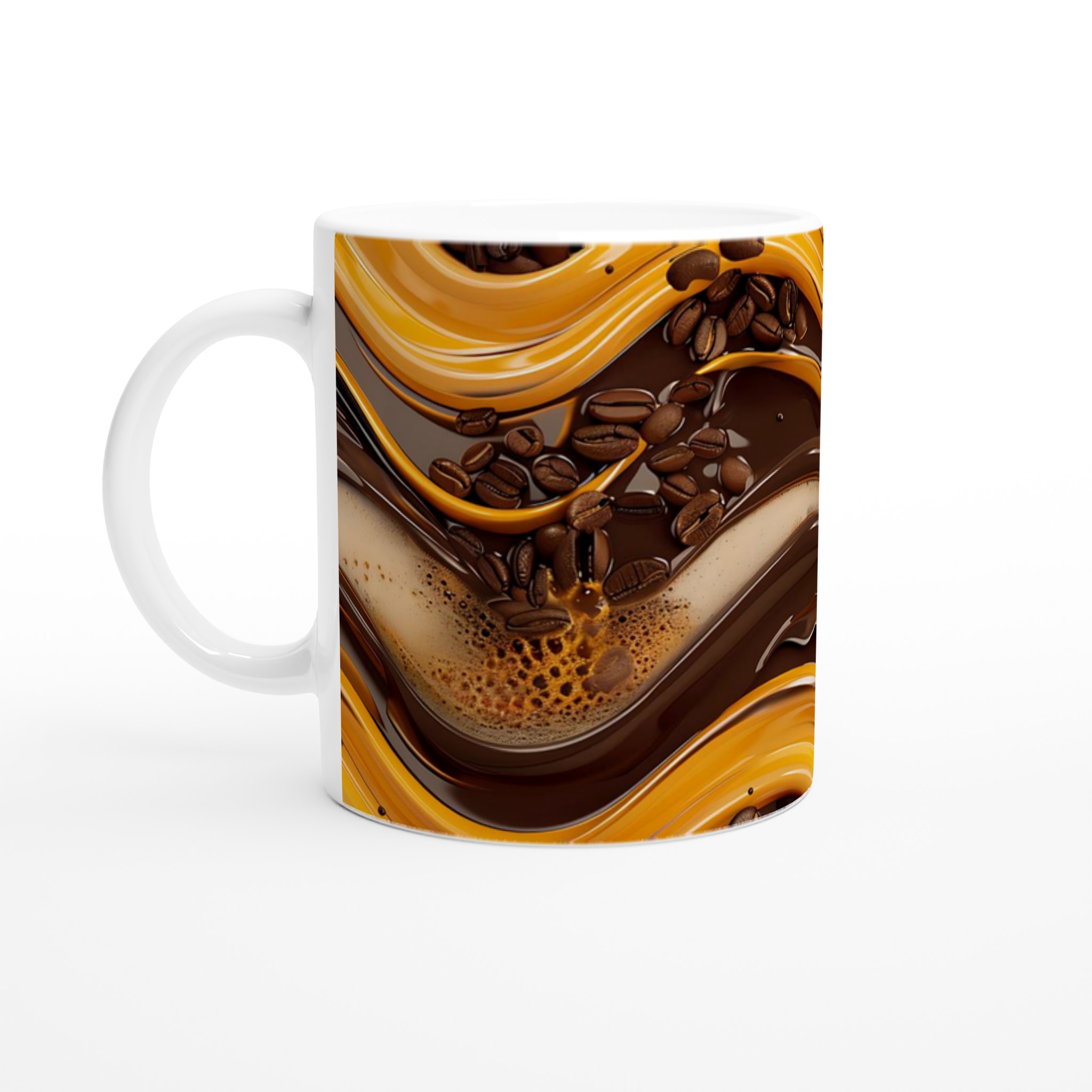 Inspirerad av den rika, virvlande blandningen av mocka, karamell och kaffebönor, ger denna mugg en känsla av lyx till din dagliga rutin. Den blanka vita ytan ger ett skarpt och levande tryck som verkligen sticker ut, oavsett om det är en personlig design, ett roligt citat eller en present till någon du tycker om.