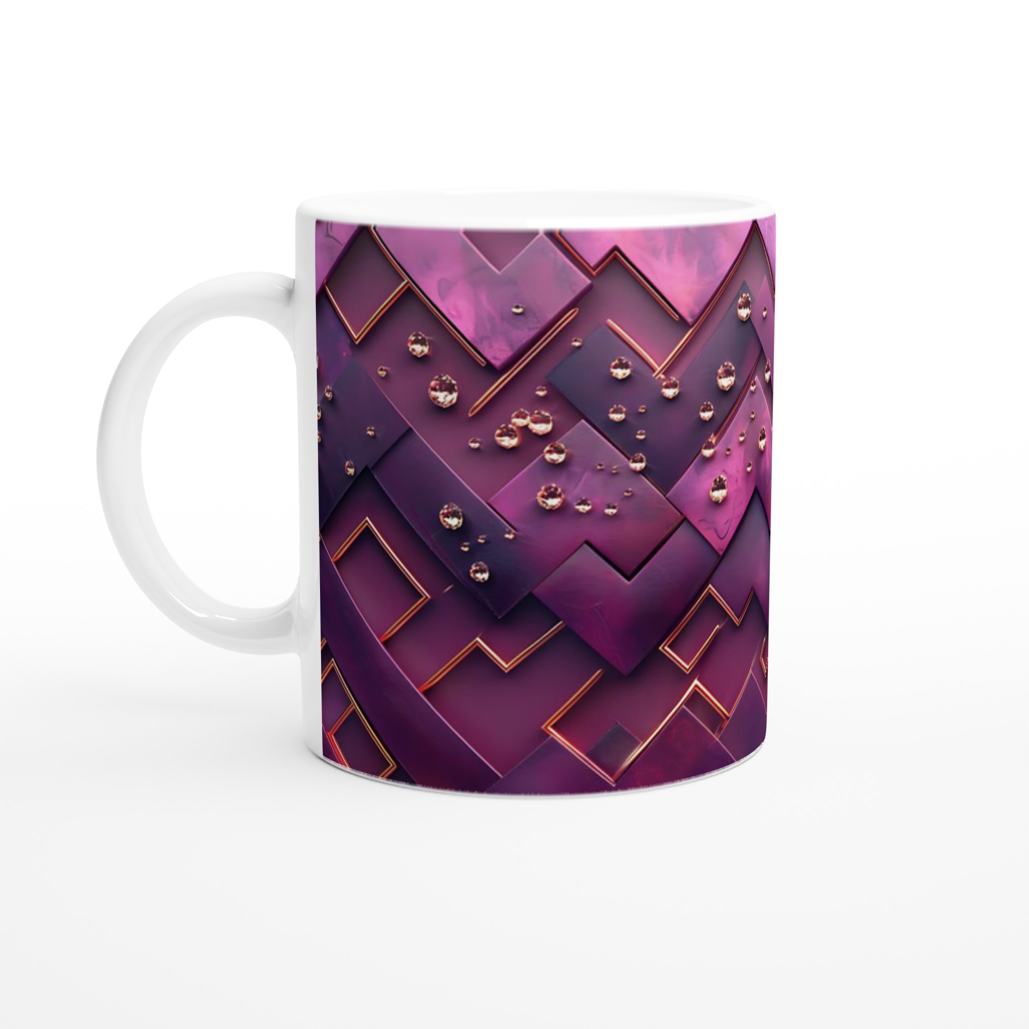 Lyft varje kaffestund med vår premium keramikmugg – stilren, hållbar och skapad för att låta ditt motiv glänsa. Denna eleganta mugg fångar den sofistikerade känslan av mörkrosa juveltoner och geometriska mönster, vilket ger din dryckesupplevelse en touch av glamour. Den blanka vita ytan ger ett skarpt och levande tryck som verkligen sticker ut, oavsett om det är en personlig design, ett roligt citat eller en present till någon du tycker om.