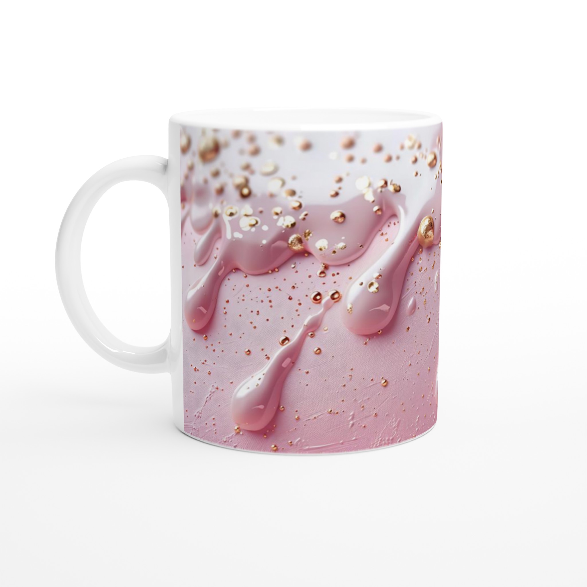 Välj bland våra sju strålande färgalternativ – från klassiskt Ceramic White till djärvt Ceramic Black eller de lekfulla nyanserna Ceramic Yellow, Pink, Green, Red och Blue – för att hitta den perfekta bakgrunden för din design eller matcha din personliga stil. Varje mugg lovar att behålla sin briljans, precis som de glittrande gulddropparna mot den mjuka rosa bakgrunden, för en touch av glamour i varje klunk.