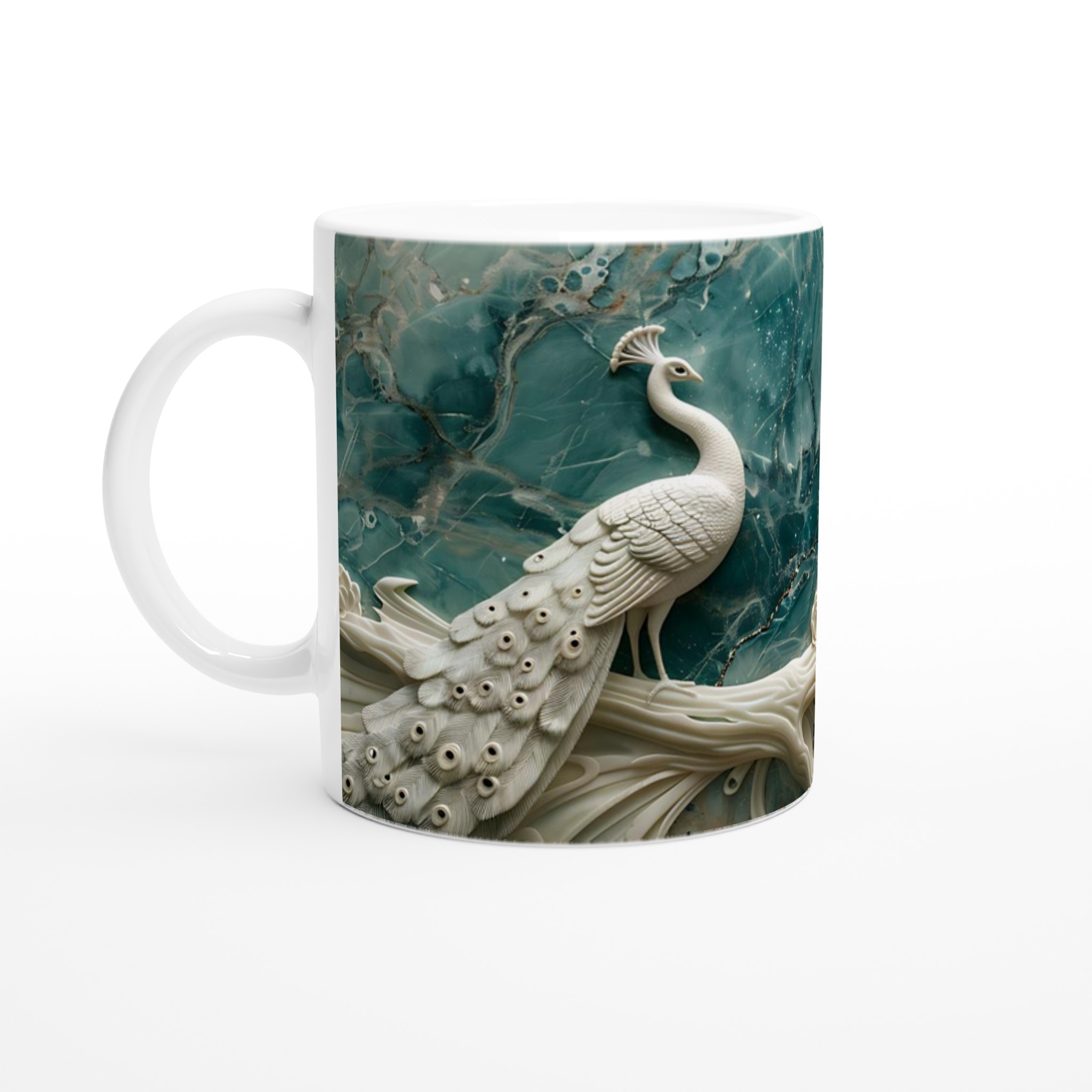 Inspirerad av den majestätiska påfågeln mot en bakgrund av skimrande blå marmor, med utsökta vita blomdetaljer, är denna mugg en konstnärlig njutning. Den blanka vita ytan ger ett skarpt och levande tryck som verkligen sticker ut, oavsett om det är en personlig design, ett roligt citat eller en present till någon du tycker om.
